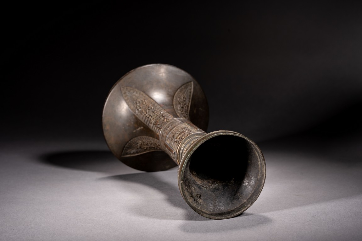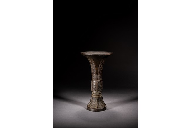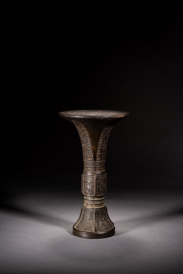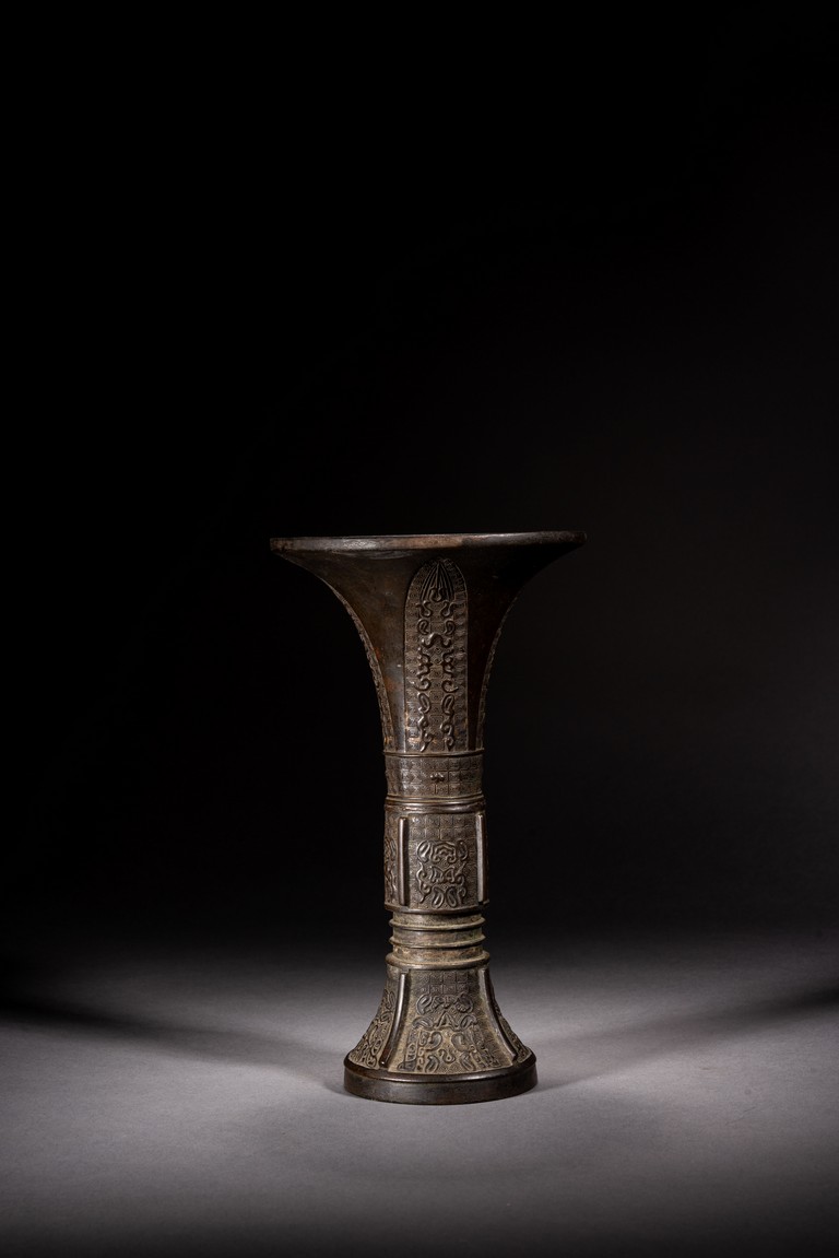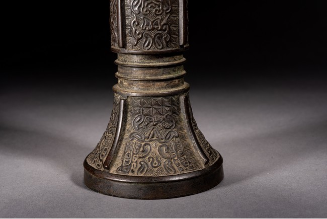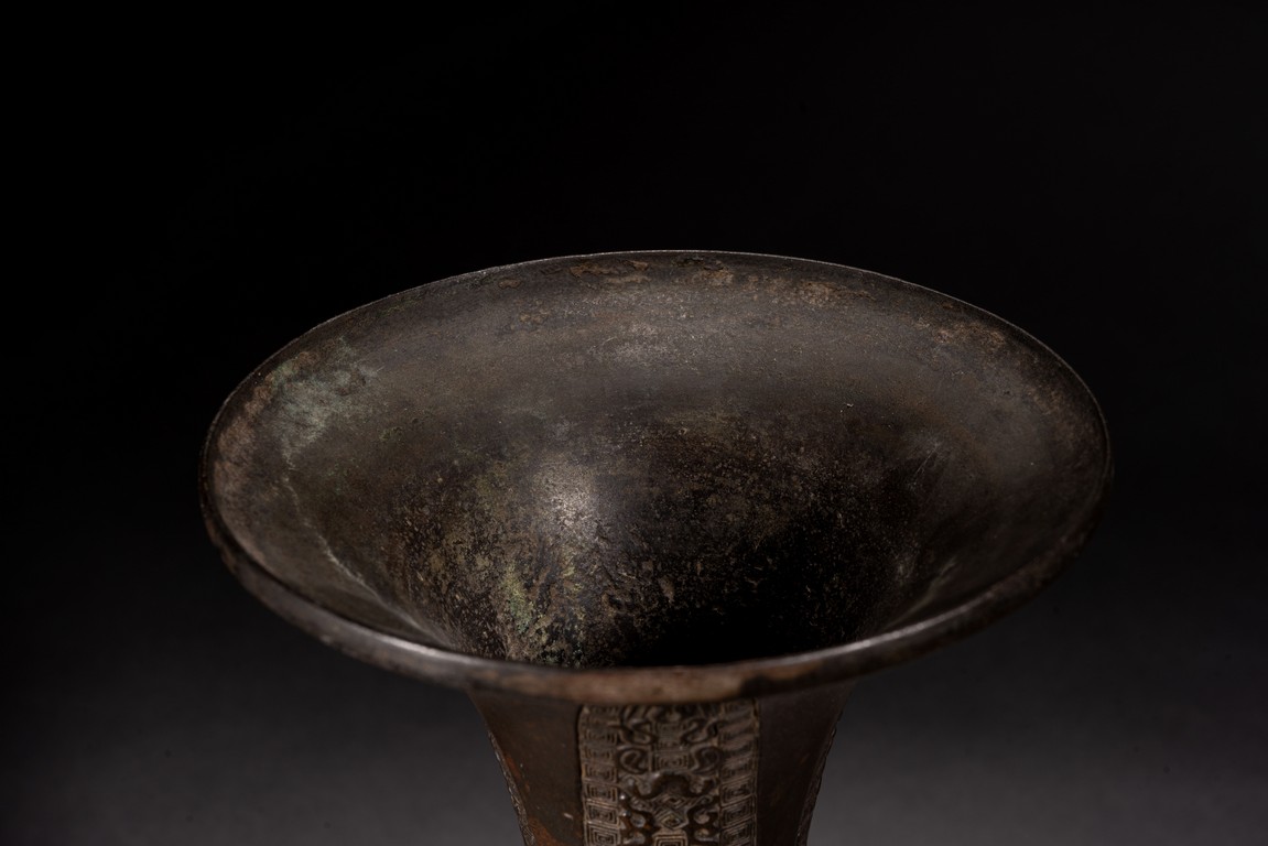 精銅鑄花觚,敞口呈喇叭狀,束腹,高圈足,圈足外撇。整器從口沿至圈足的紋飾分三部分,整體鋪鑄回字紋為地,其上為饕餮紋,布局似商周青銅紋飾。
