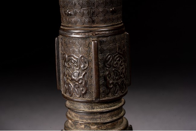 Ming Dynasty period. The upper section with leaf shaped panels, the central and lower sections with taotie masks and flanges, all on geometric pattern grounds