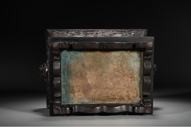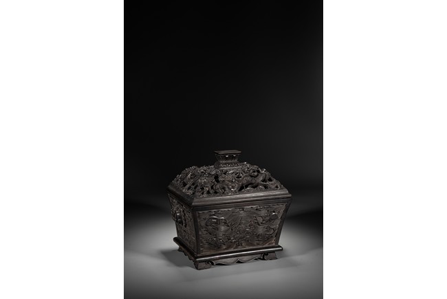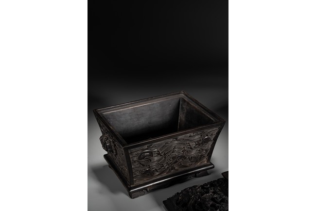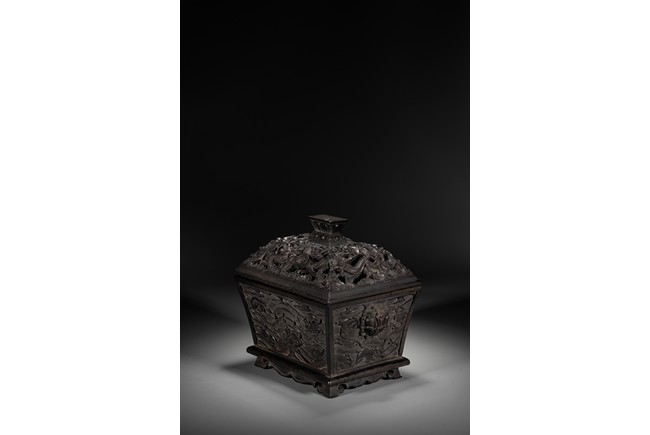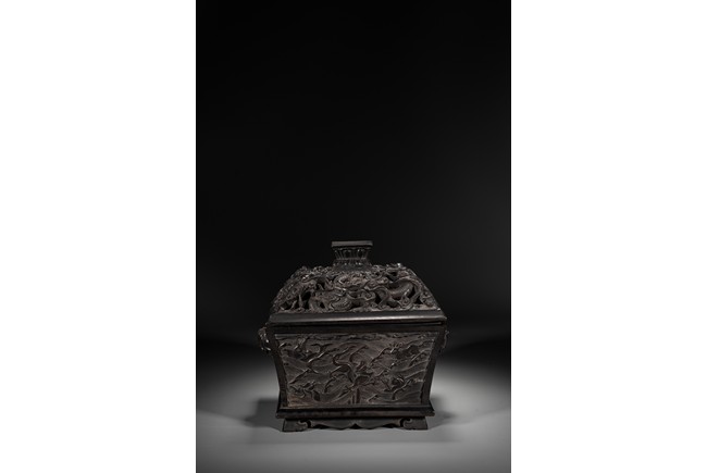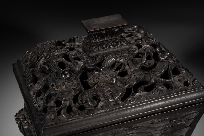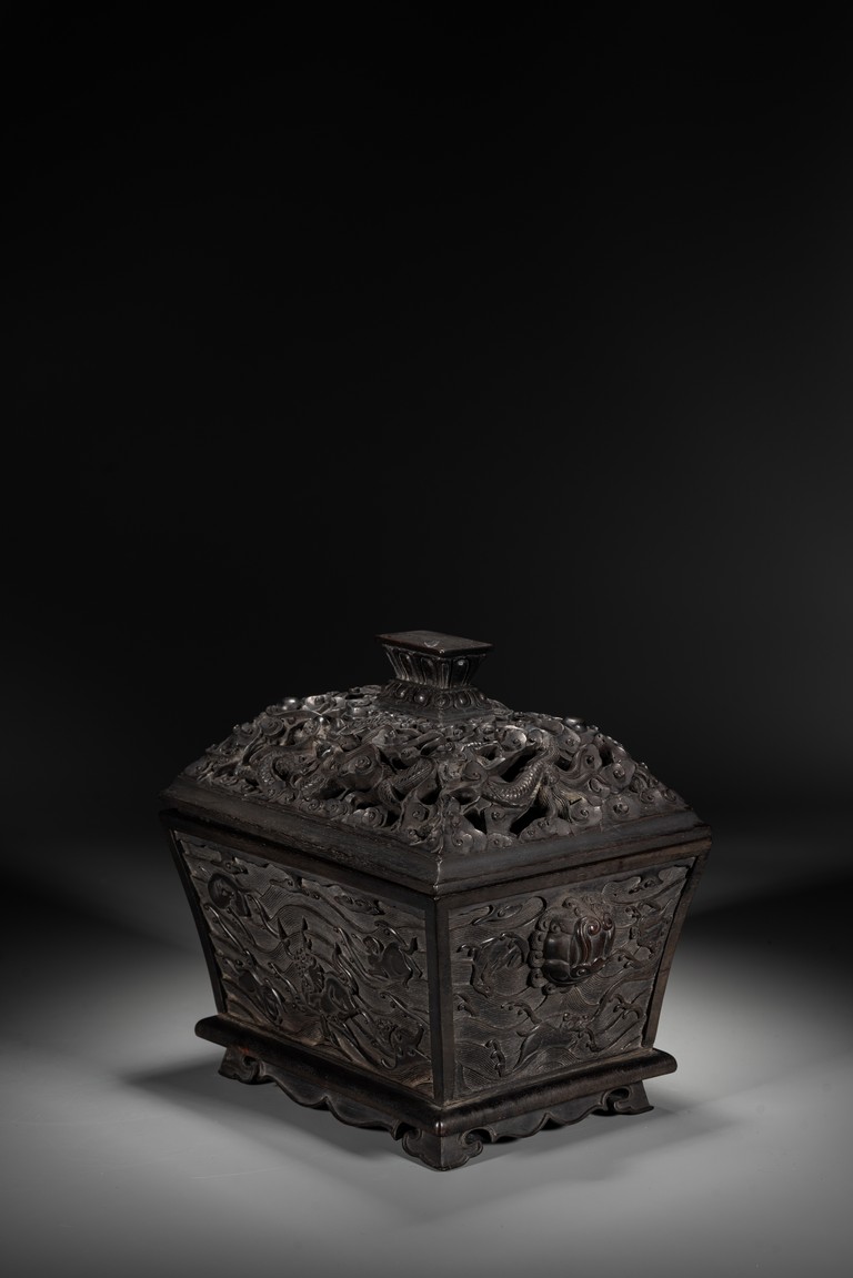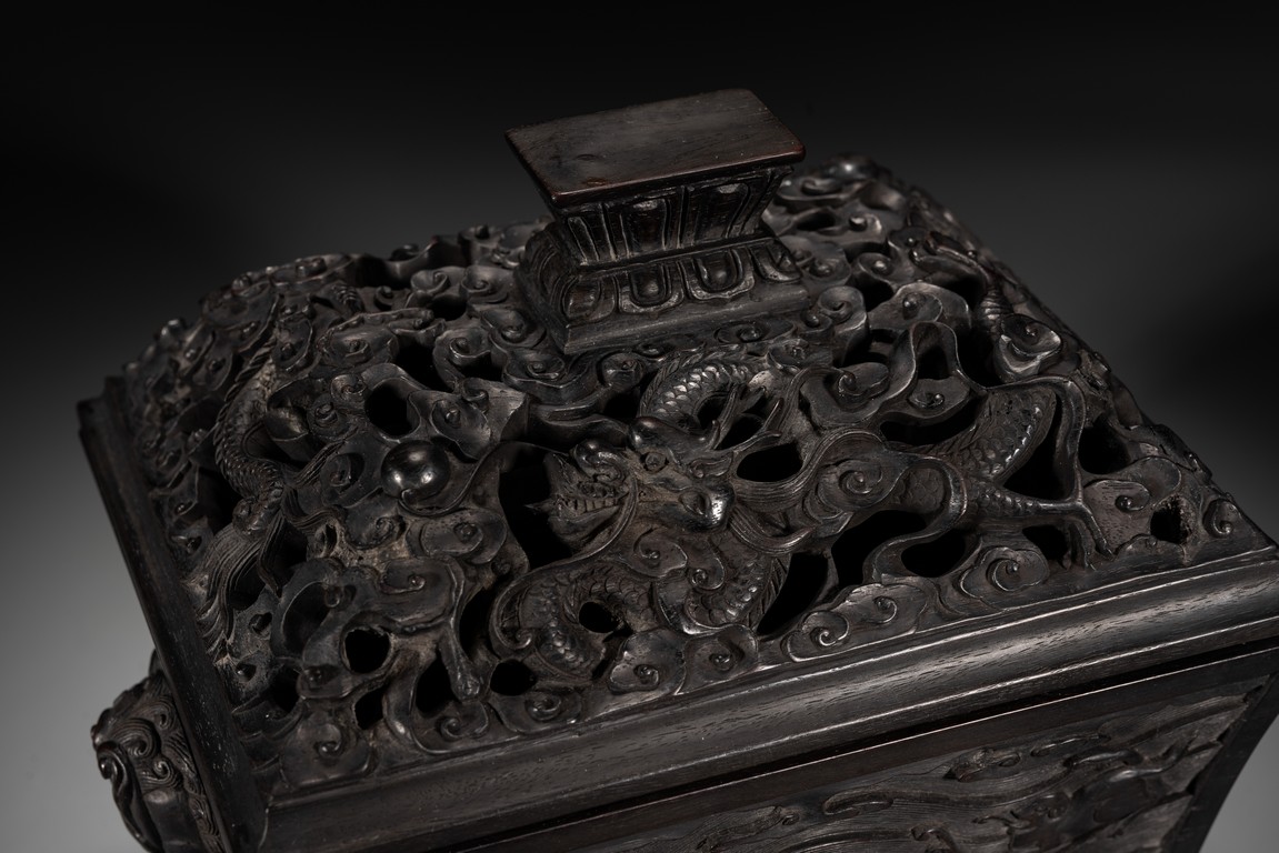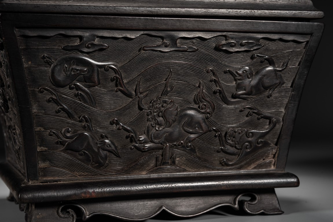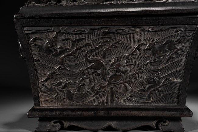 紫檀制成,包漿沈郁醇厚,木色漆黑,局部微透紫紅,質理堅實細密,表面牛毛棕密布,實甚佳料。爐呈倒梯形,斜腹,底四足著地,中開壺門。爐蓋鏤空鏨刻“龍紋”,鬢髯鱗角絲理規整,生動有致。腹部刻“海水八怪紋”,江崖海水激蕩洶湧,輝映海水八怪翻江倒海,爐側獸面雙獅耳。整器運刀精確細膩,圓潤渾厚,不露刀鋒,適於陳設。