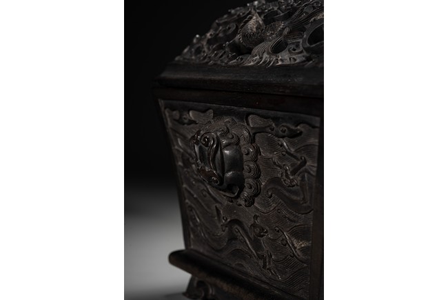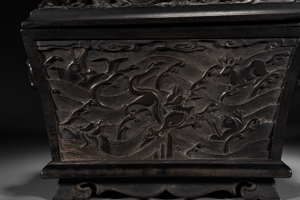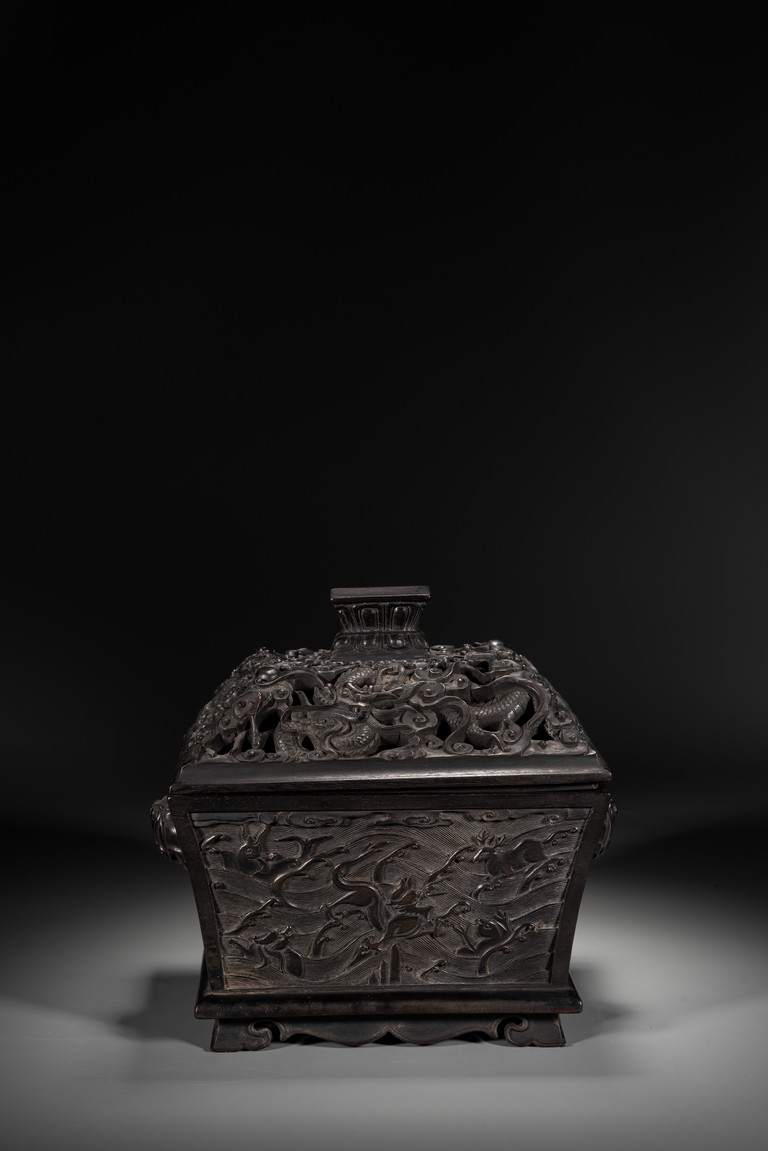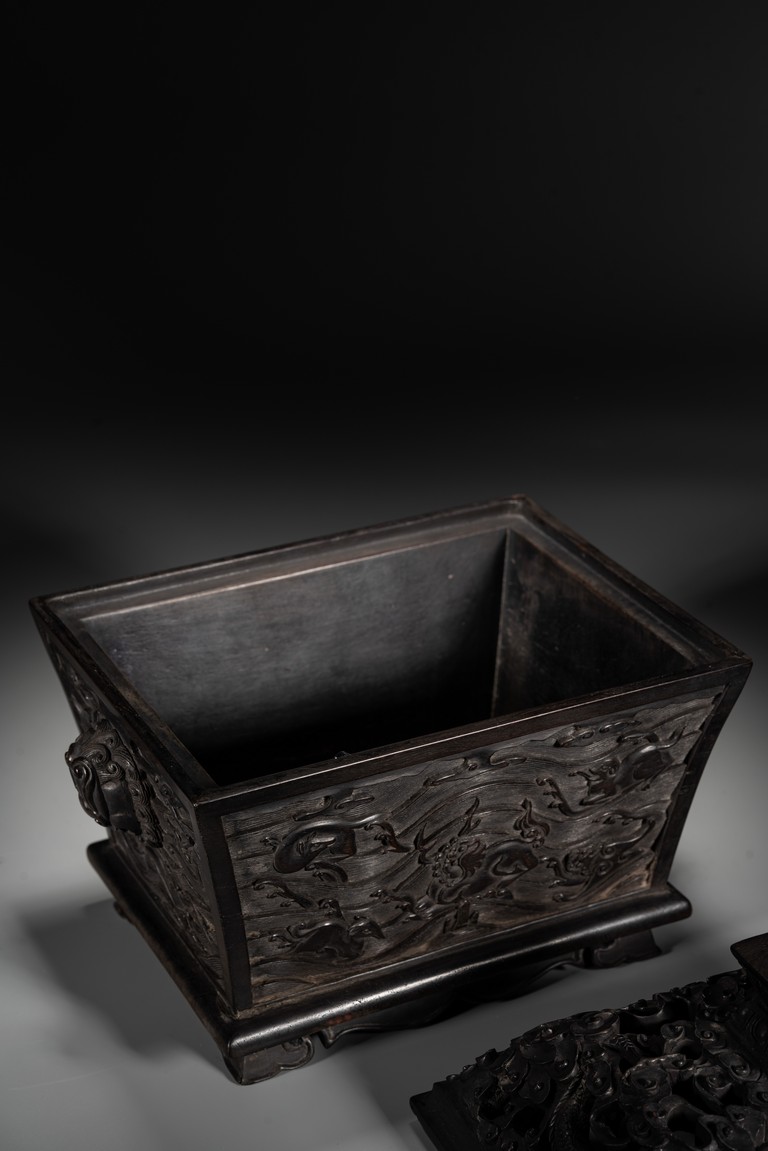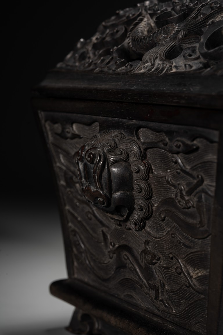 of rectangular section, the flaring sides supported on four feet and flanked by a pair of lion-mask handles, carved to the sides in relief with rectangular panels enclosing mythical beasts diving and splashing amid cresting, roiling waves, the reticulated cover with a pair of dragons in high relief darting among scrolling clouds, surmounted by a flaring cylindrical knop.