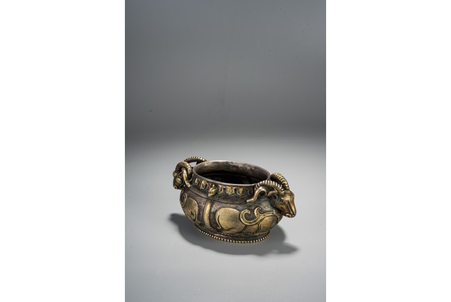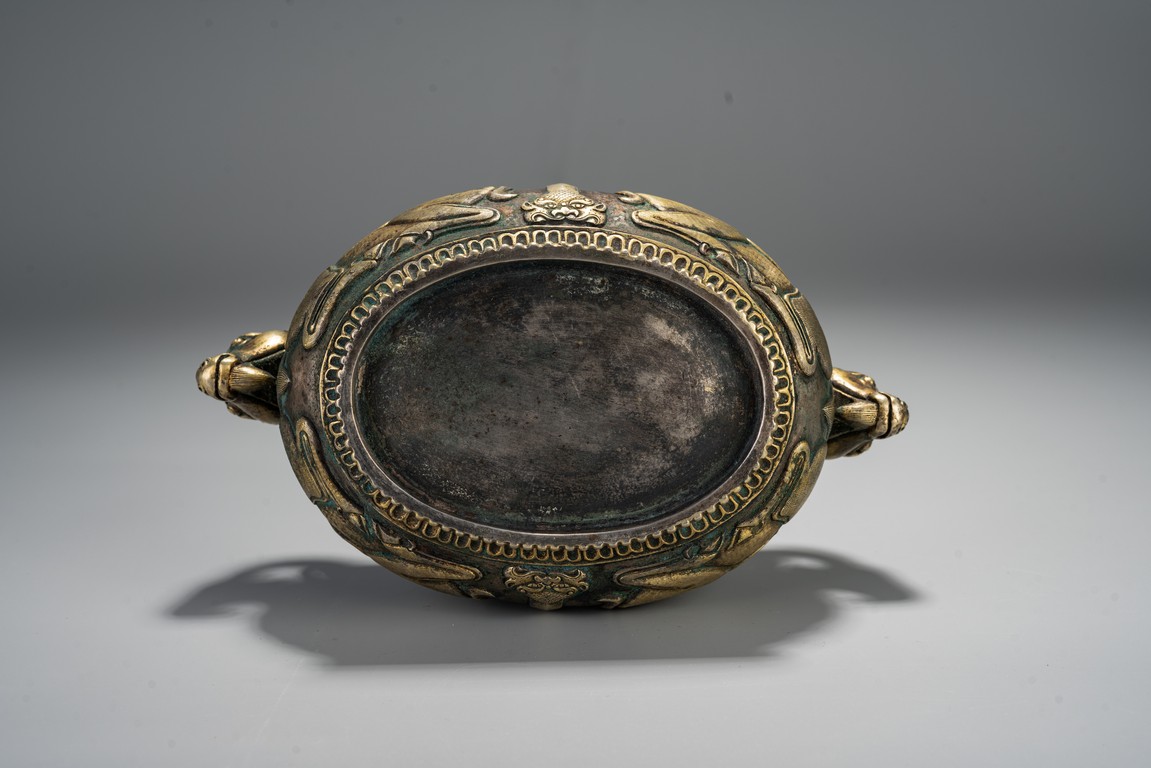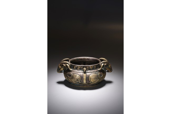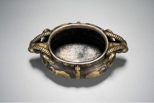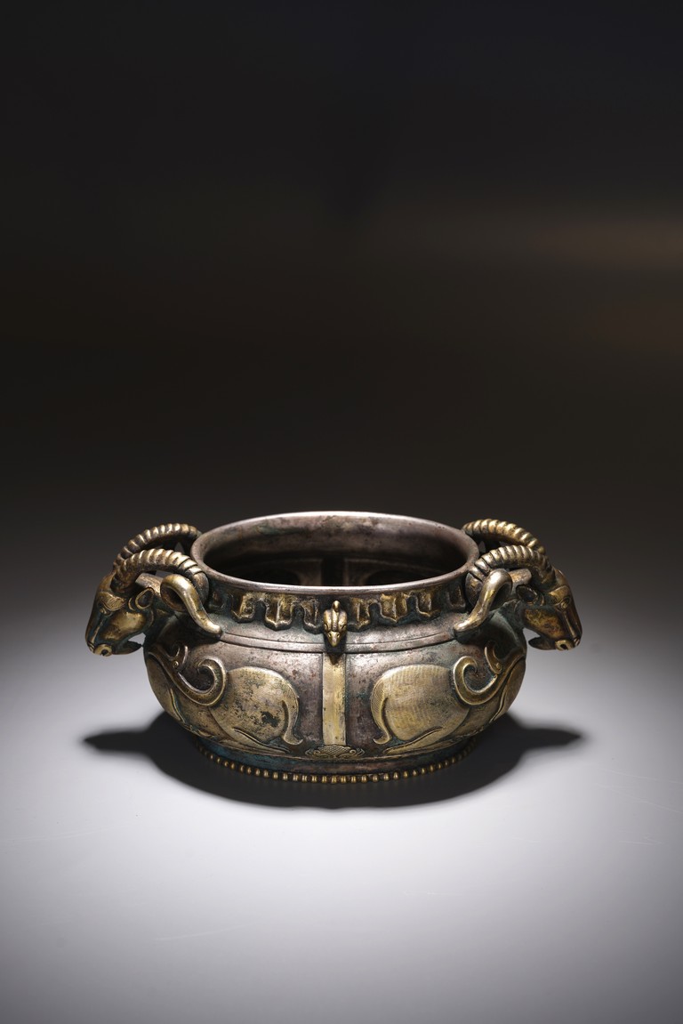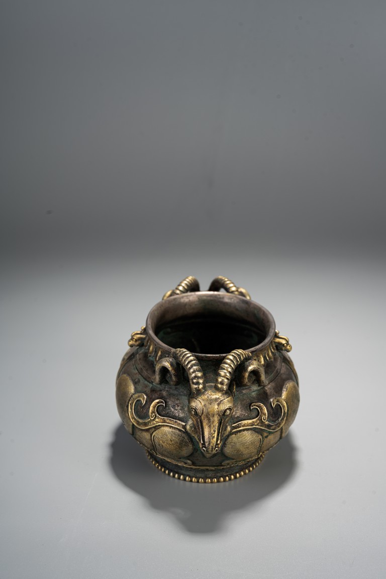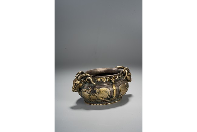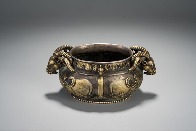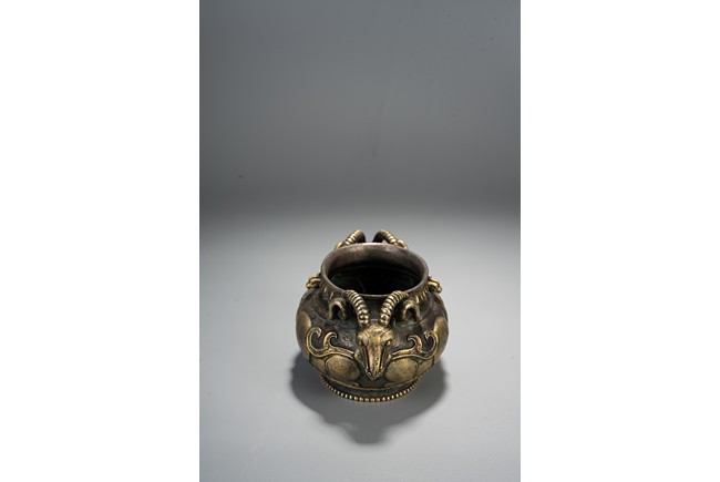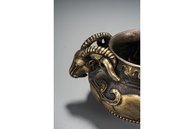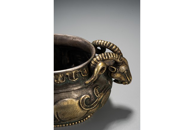 此件藏品純銀材質,局部鎏金工藝,扁圓形、唇口、鼓腹、圈足帶滾珠紋,雙羊獸耳,比例俊美,大氣磅礴,羊與祥同形,故有吉祥之寓意,賞玩、陳設及收藏均屬佳品。