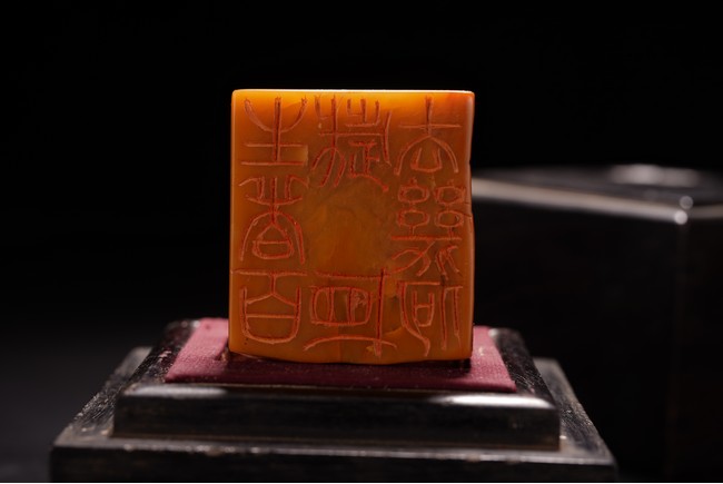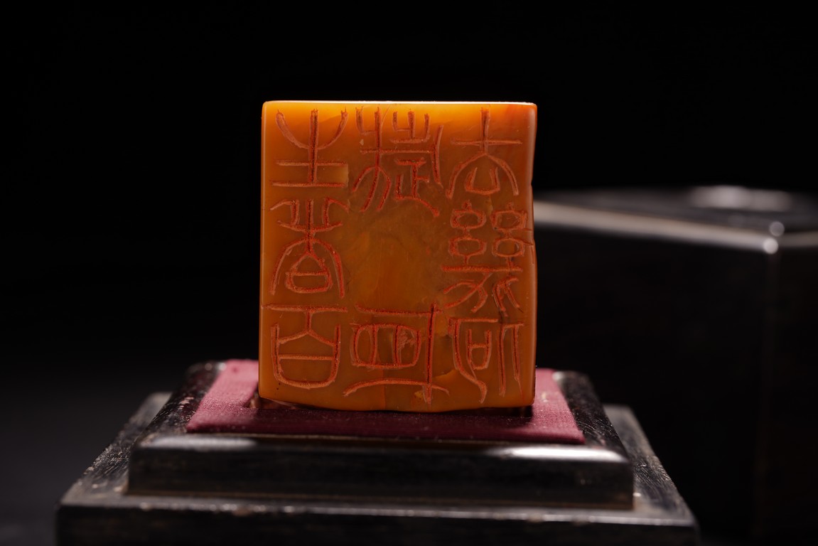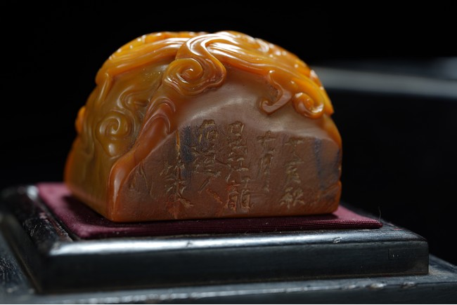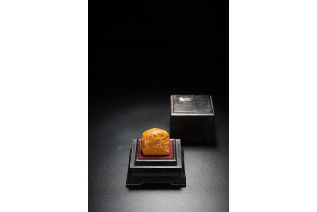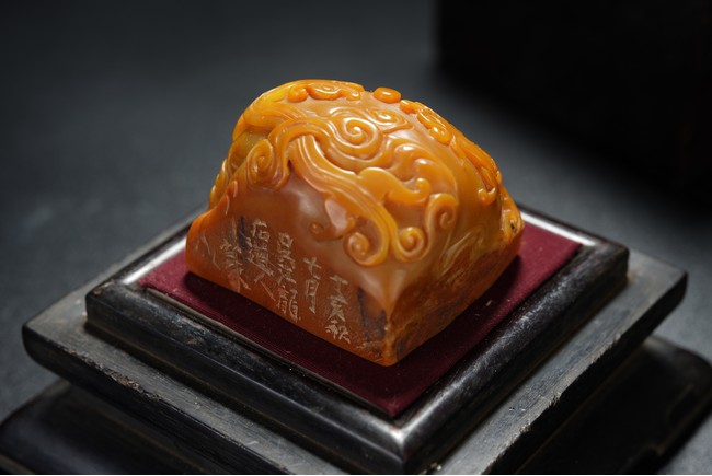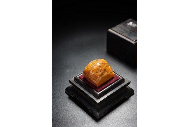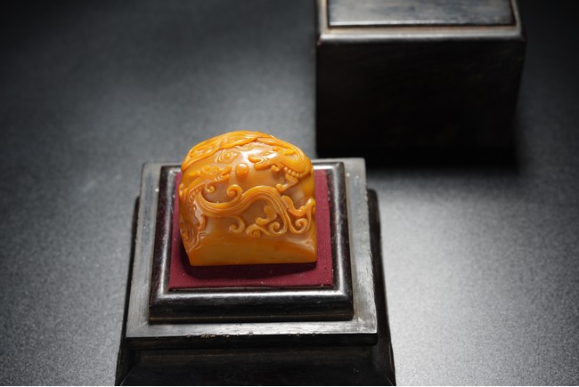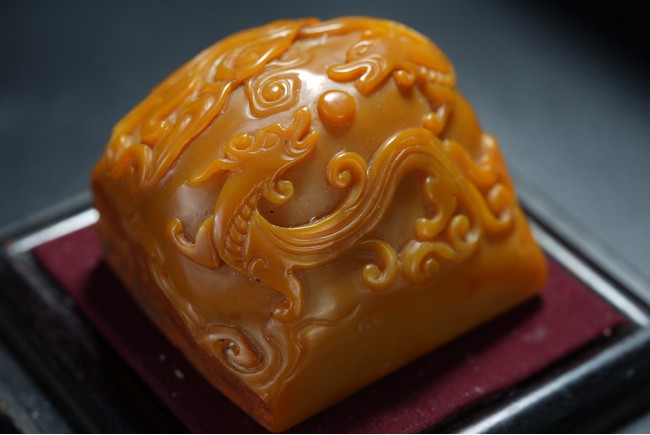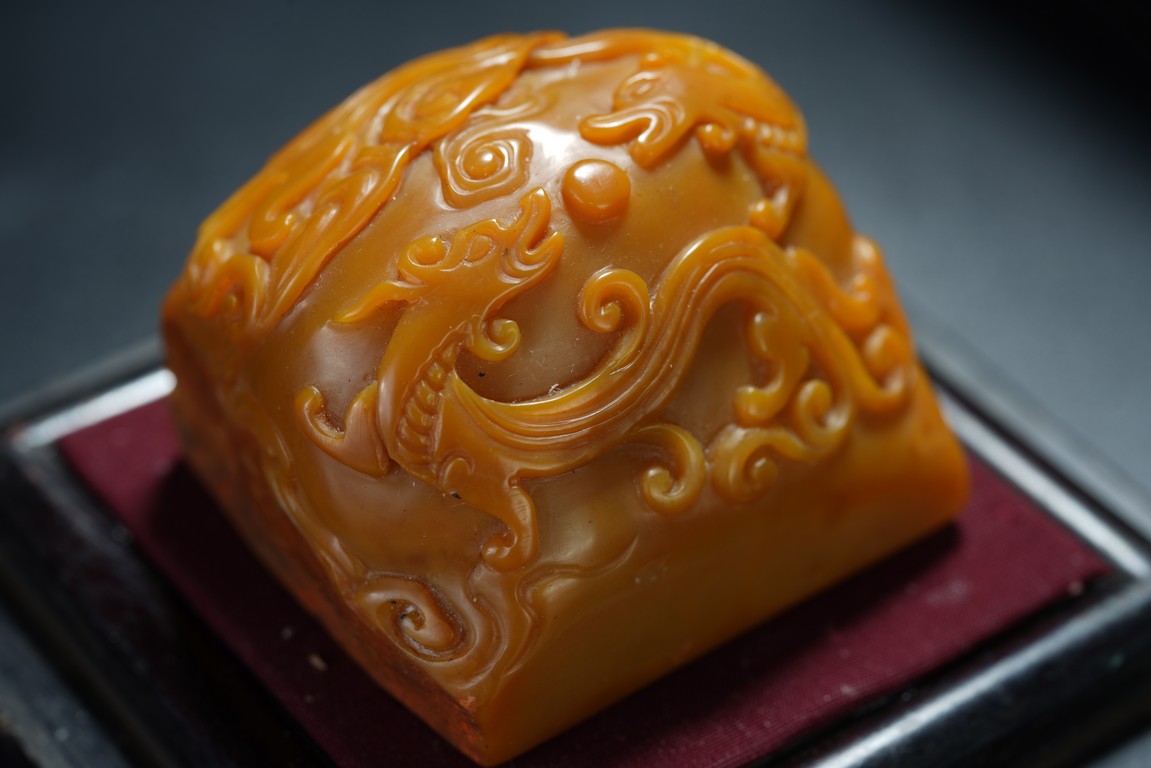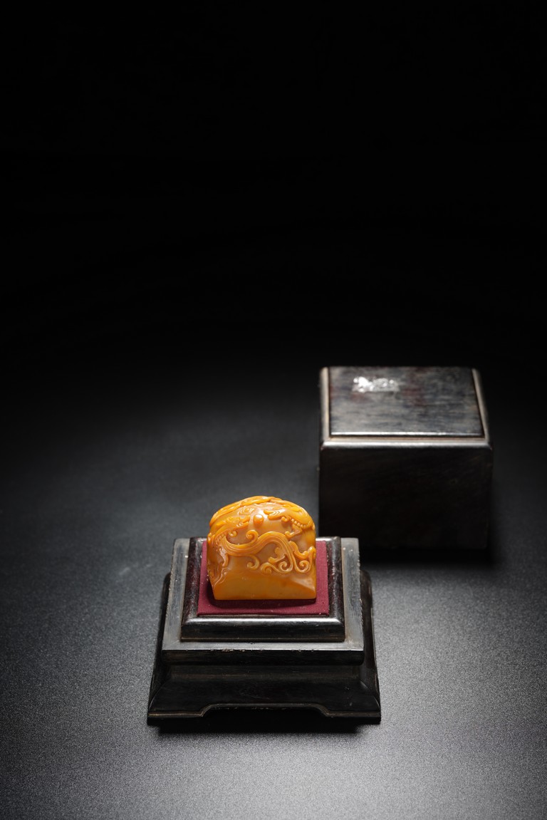 The naturalistically carved seal carved in shallow relief with sinuous chi dragons, with wood stand and box cover.