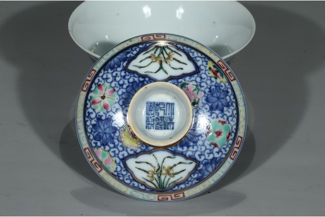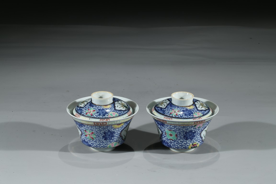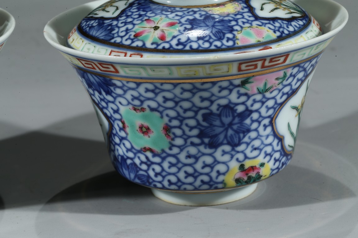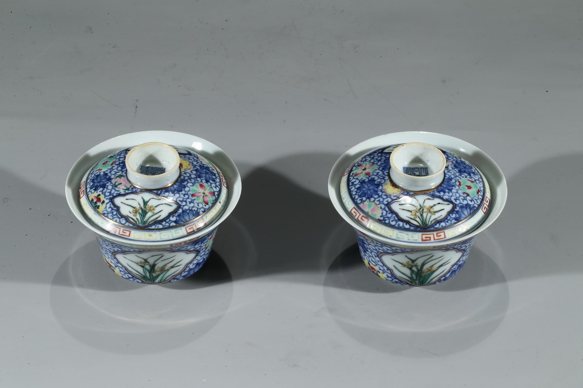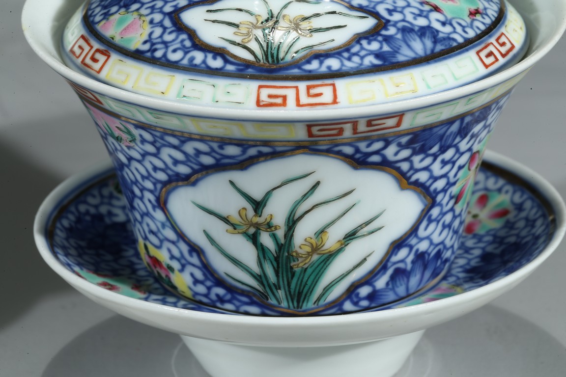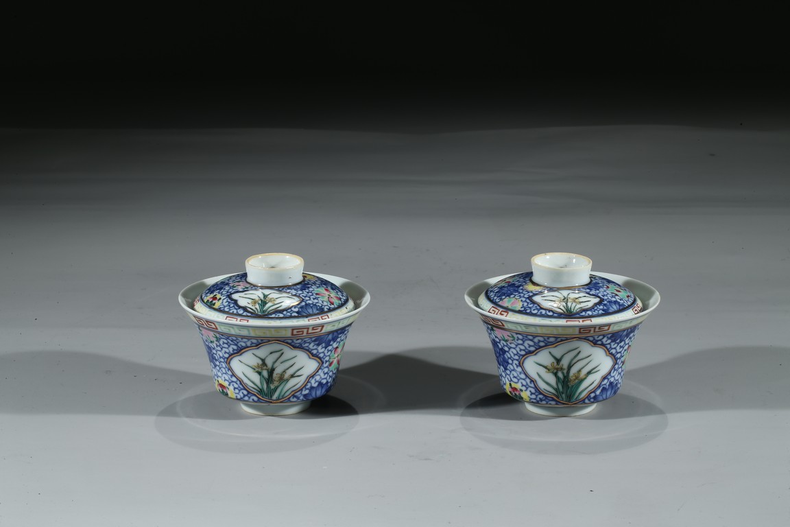 Each bowl is decorated with orchids within a shaped cartouche interrupted by 'flower-balls' within underglaze blue scrolled background, the cover enamelled with similar design, the cover finial inscribed with six character Qianlong mark, with stands. Qing Dynasty period.