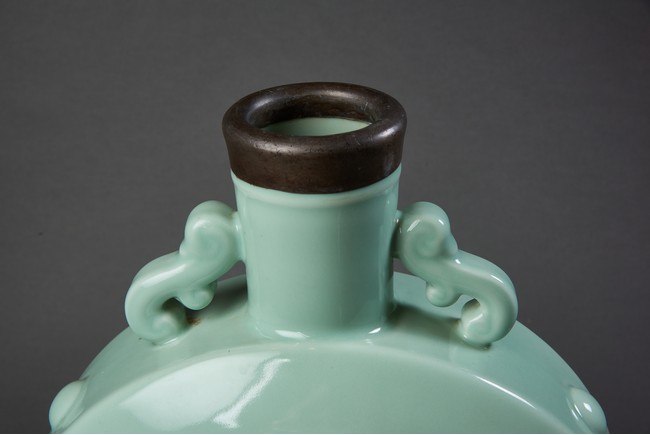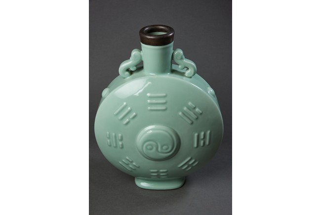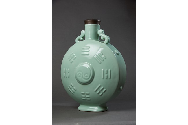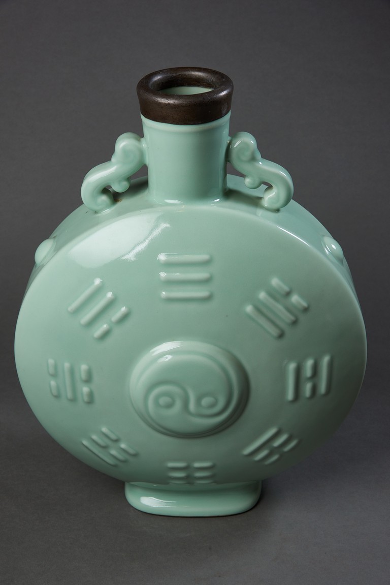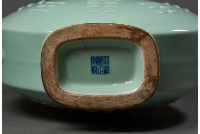 Modelled after the Islamic metal prototype, of flattened globular form, rising from a splayed rounded square foot to a cylindrical neck set with a pair of archaistic animal scroll handles, the body moulded in relief on each side with a large central yin-yang boss encircled by eight trigrams, the flat sides moulded with bosses resembling rivets, covered overall in a attractive celadon green glaze, the recessed base similarly glazed and inscribed with a six-character seal mark in underglaze blue. Qing Dynasty period.