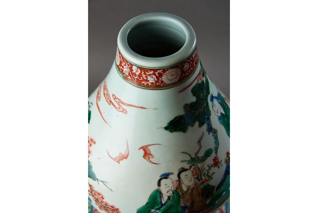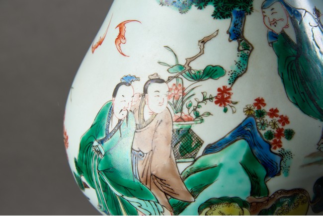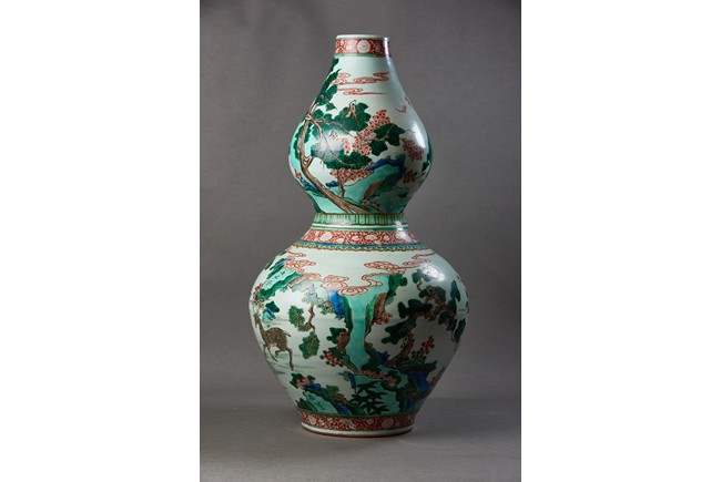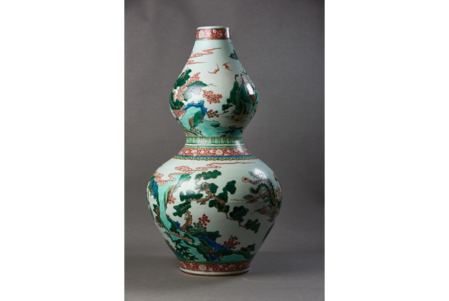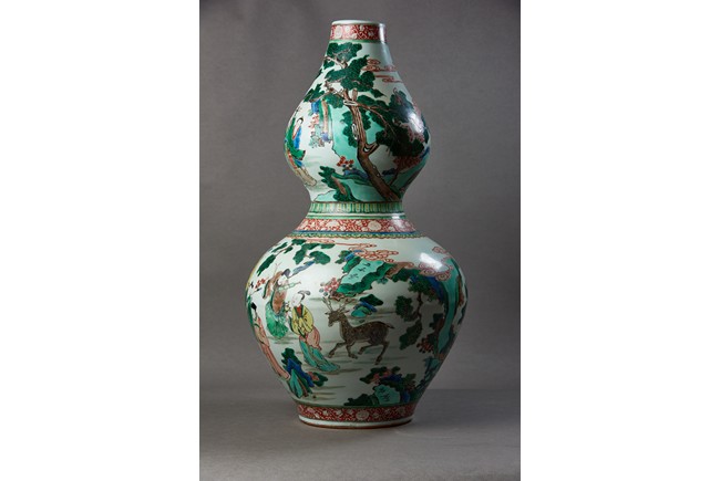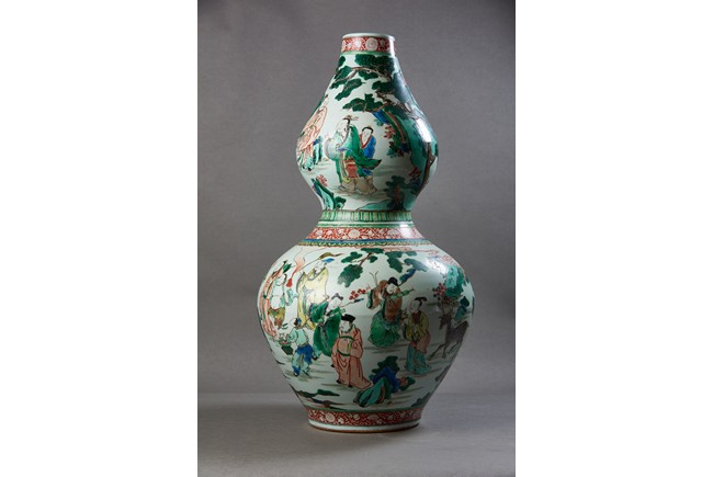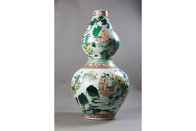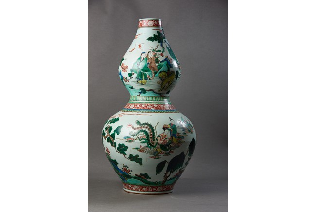 The larger lower bulb brightly painted with the Eight Immortals welcoming the descent of Queen Mother of the West and Taoist immortals, the waisted shoulder encircled by floral scrolls and ruyi heads, the upper gourd decorated with figures and mythical beast, the rim encircled by a wide floral band, base unglazed. Qing Dynasty period.