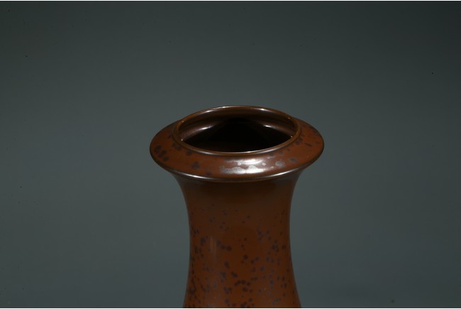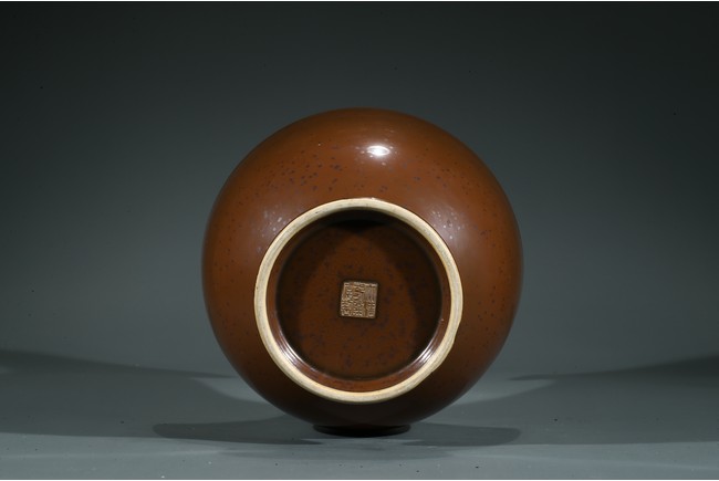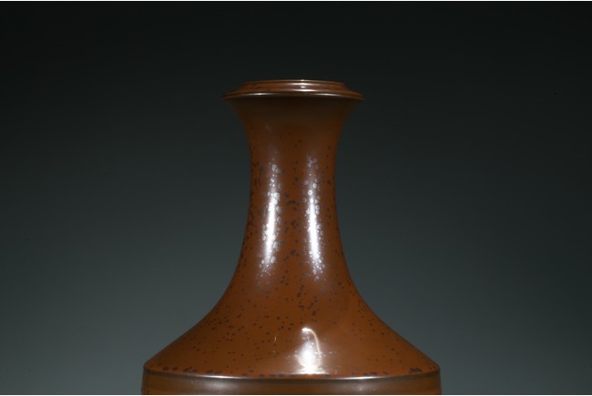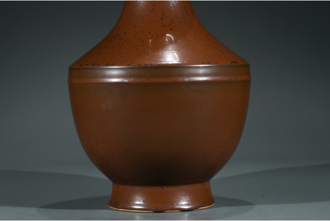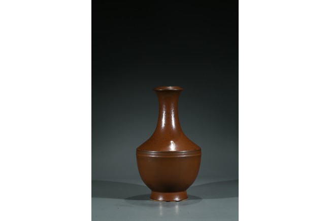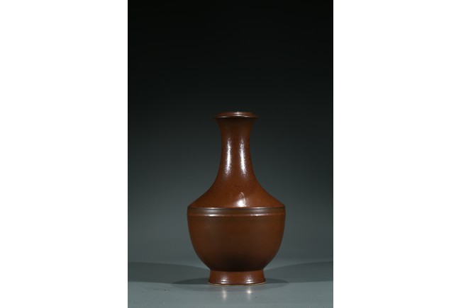 醬色釉,簡稱「醬釉」,是以鐵為著色劑的高溫釉。釉色如柿黃色或芝麻醬色。醬色釉早在商代後期原始青瓷上即偶有出現,東漢時期開始流行,一直延續至明清。清代康熙、雍正、乾隆時期醬色釉面較前朝更為潤澤,閃爍金屬般的光澤,似紫金包鑲一般,亦被稱為紫金釉。收口,細頸,折肩,弧腹,撇足,頸腹及近足處分別凸起弦紋作裝飾。通體施醬釉,色沉而亮,觀之,釉彩肥厚,澤光瑩瑩,金屬質感頗強。“大清乾隆年制”款識。