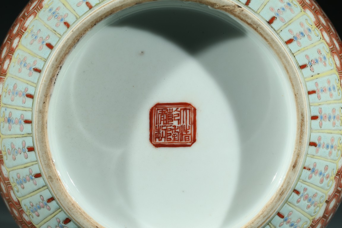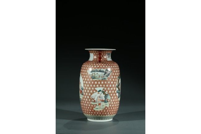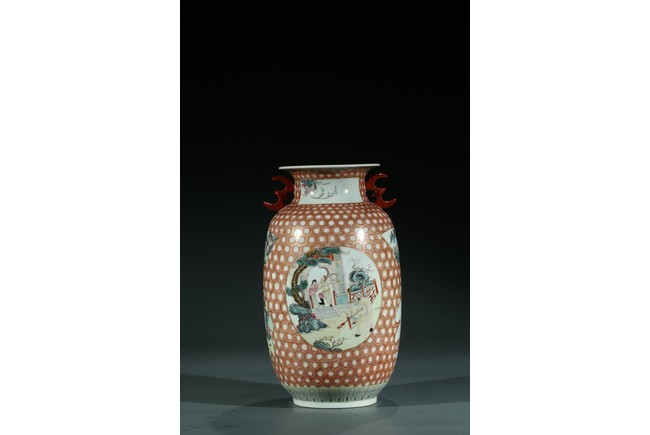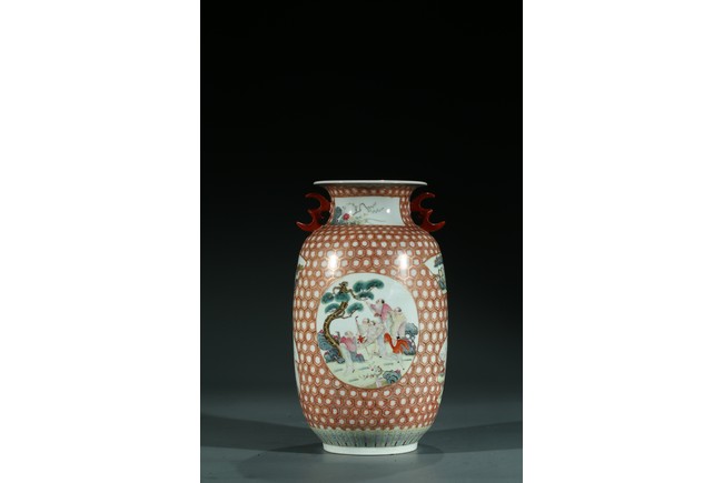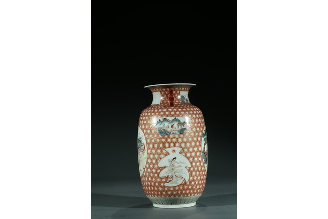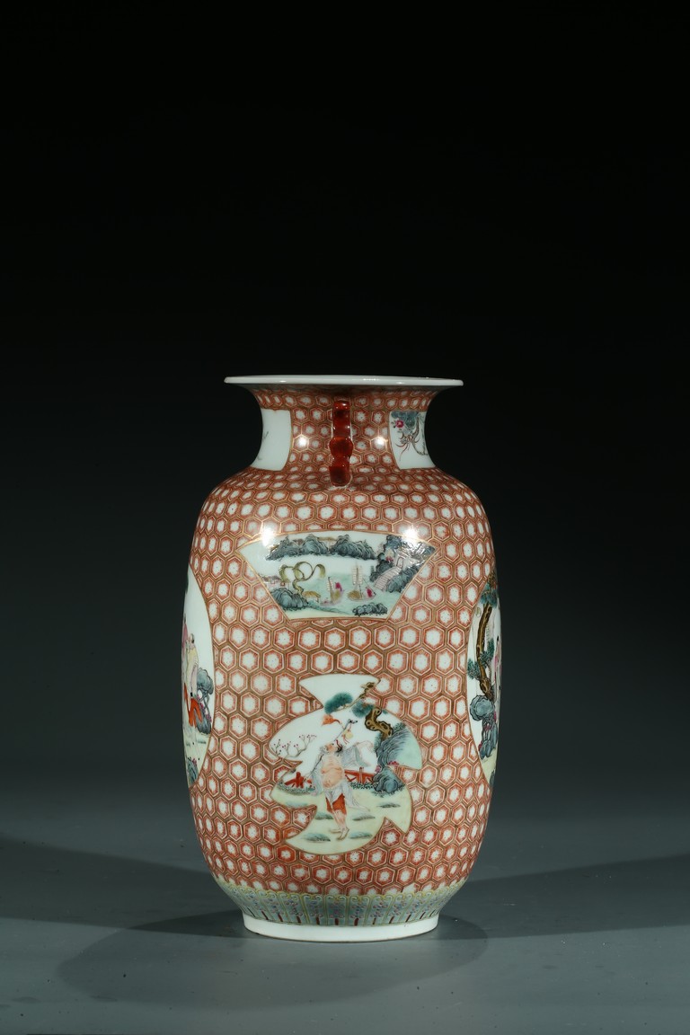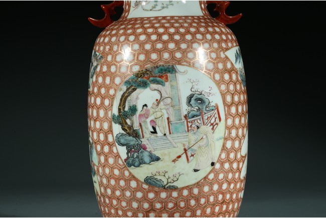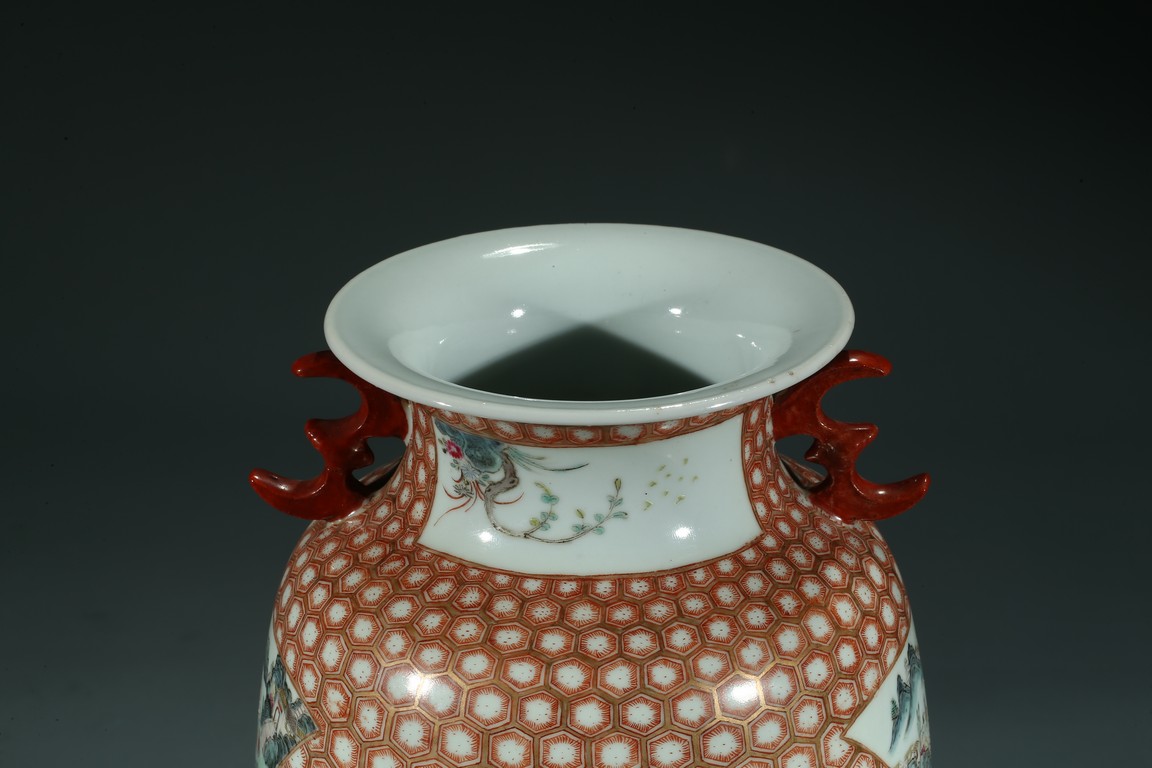 此瓶撇口、頸束頸、溜肩、長弧腹、下腹漸收、圈足,肩頸部飾雙蝠耳。口沿以素三彩繪如意雲紋一週,足脛處以素三彩繪蓮瓣紋一週,器身通體以礬紅彩繪六方幾何紋飾,頸部開光以粉彩繪花卉紋,腹部開光以粉彩繪五老觀畫等紋飾。繪製精細,構圖飽滿,佈局合理。整體器形別緻周正,修胎規整,胎質細膩,釉面瑩亮,施彩艷麗,頗為難得。