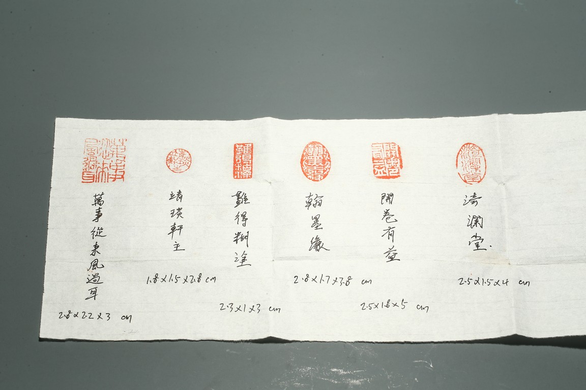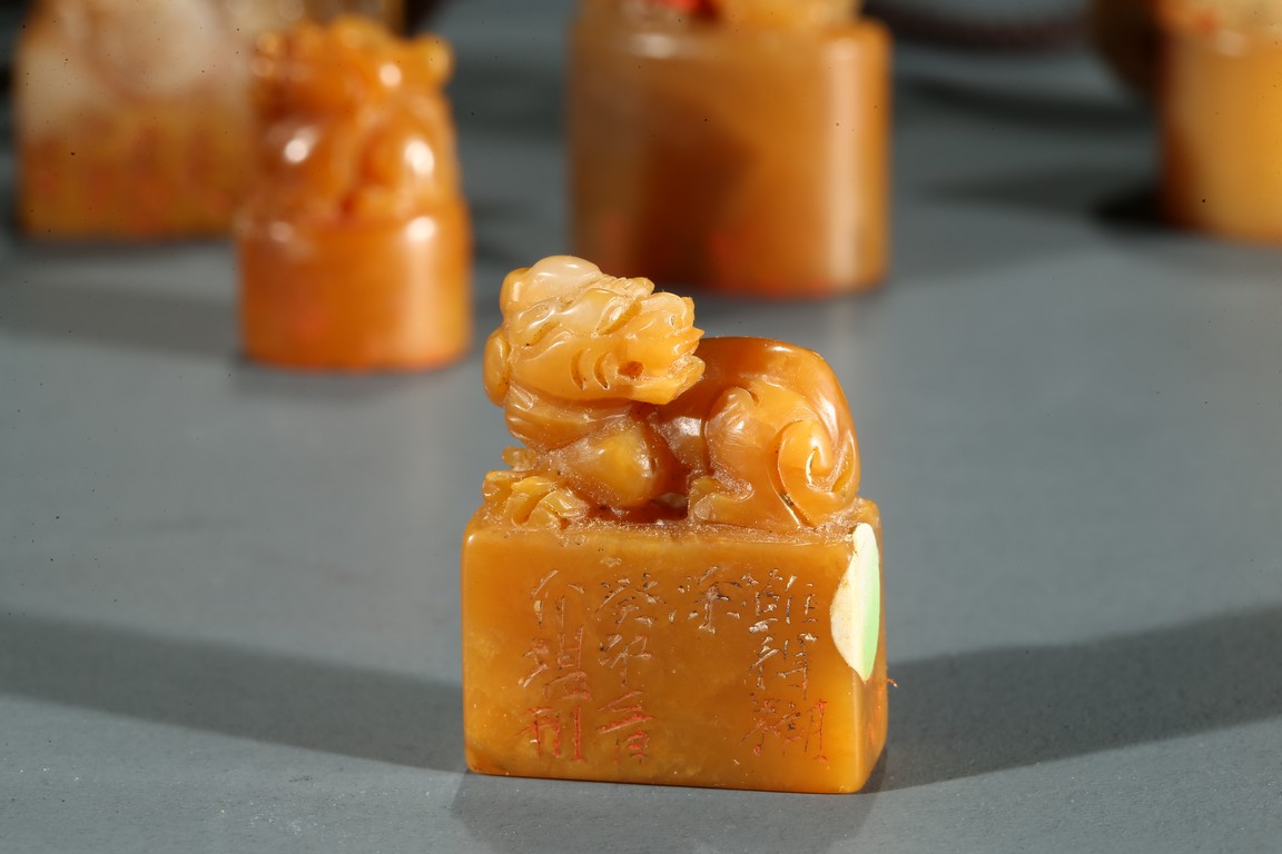 Comprising of six shoushan stone seals, each surmounted with a mythical beast finial, seal face carved.