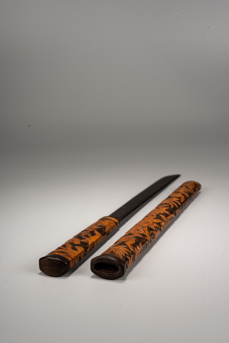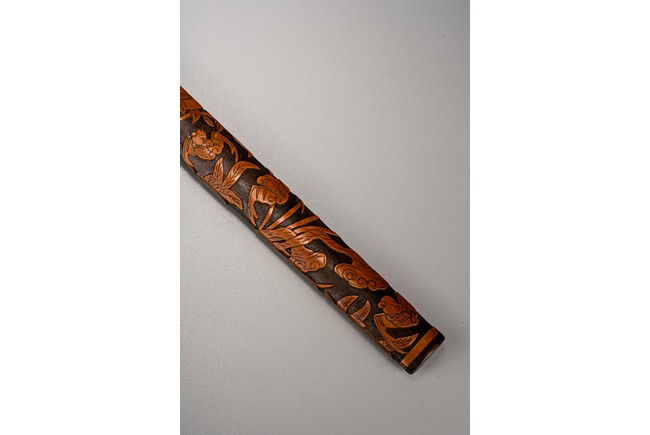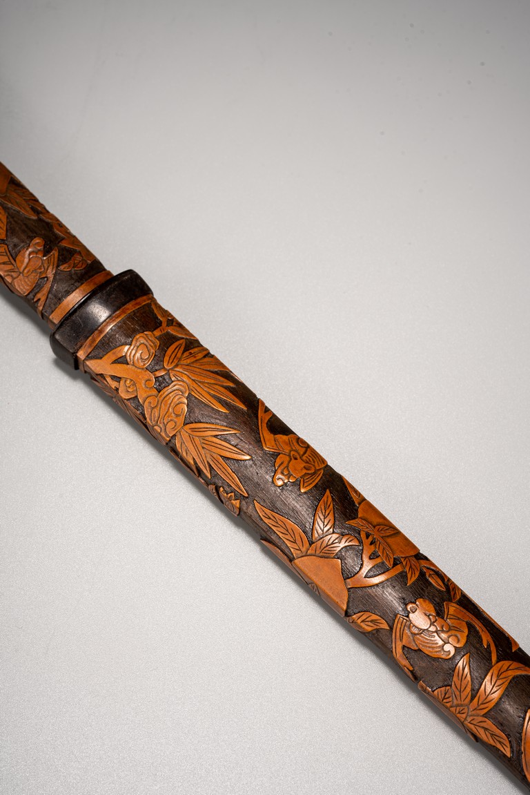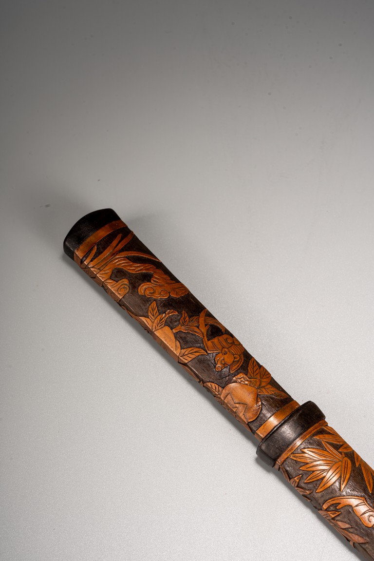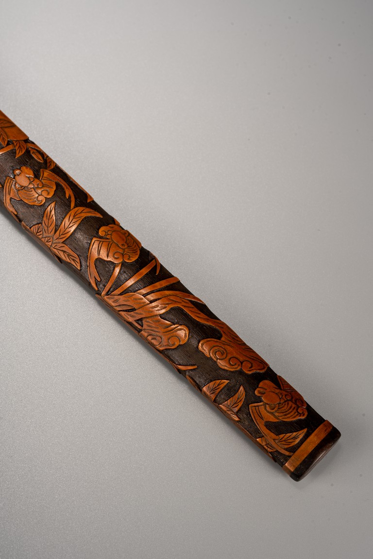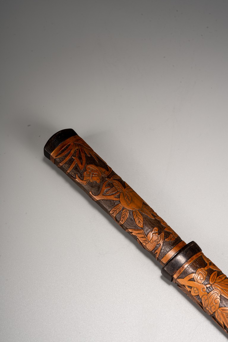 Qing Dynasty period. The handle and scabbard finely inset with bamboo veneer over zitan wood depicting leafy peaches and flying bats.