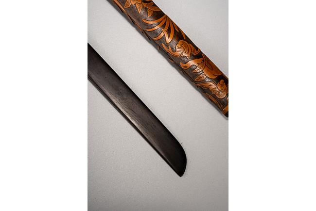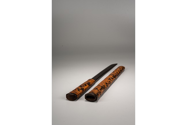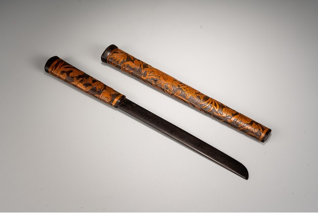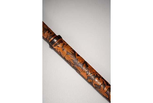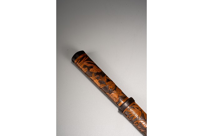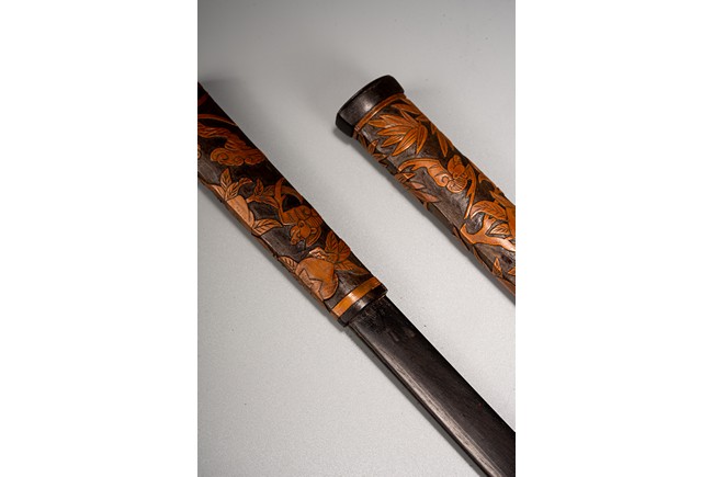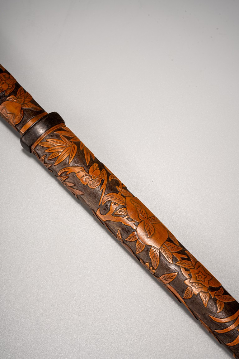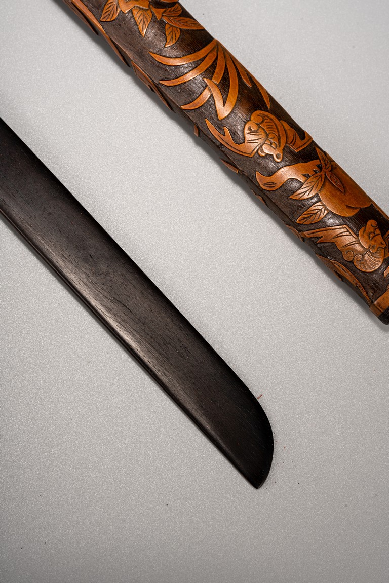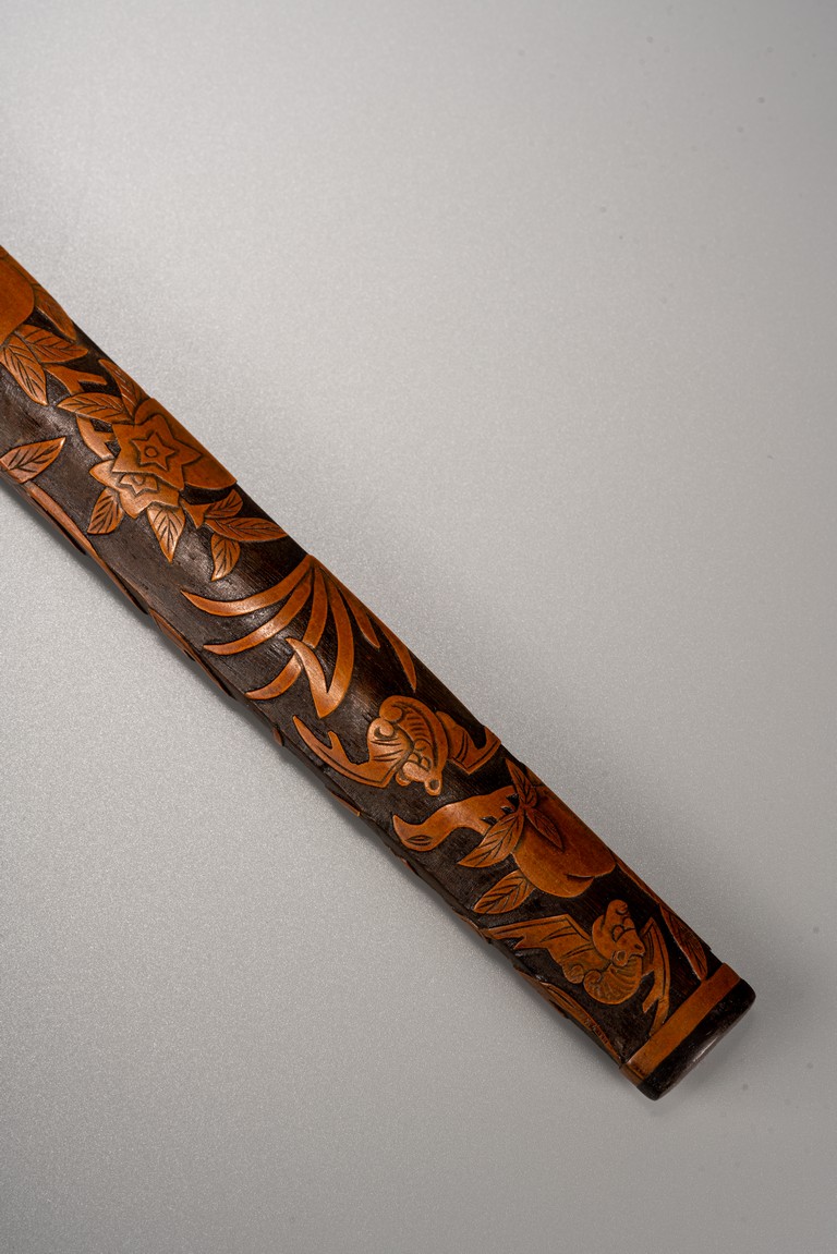 Qing Dynasty period. The handle and scabbard finely inset with bamboo veneer over zitan wood depicting leafy peaches and flying bats.
