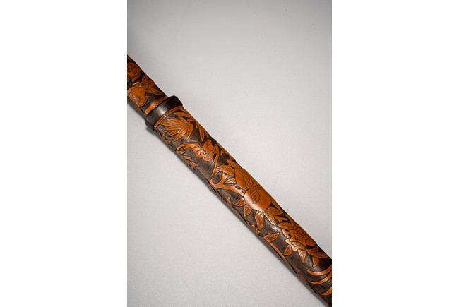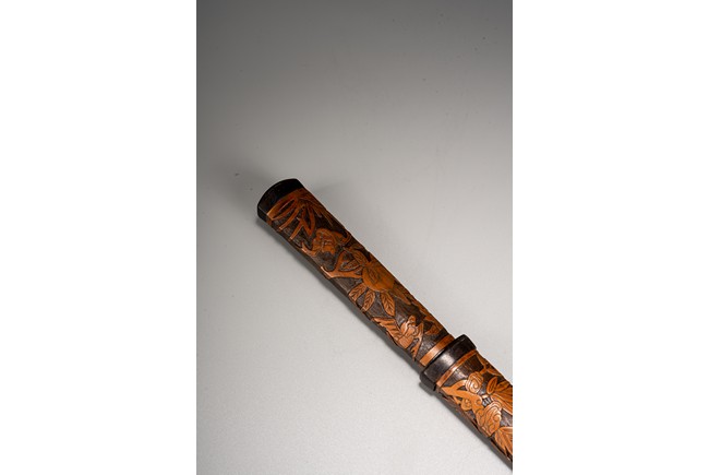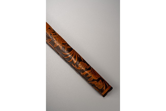 此宣紙刀為竹貼黃材質,刀壁通直,刀鋒鋒利,端莊平穩,簡約大方,刀柄帶鞘,扣契密合,整器小巧俊秀,惹人喜愛。刀首柄身及刀格為貼黃福壽紋飾,紋飾精美,剔刻精細,工藝精湛,耀眼奪目,繁縟奢華又不失幽雅清秀之氣,包漿自然老到,匠心獨運,值得收藏。