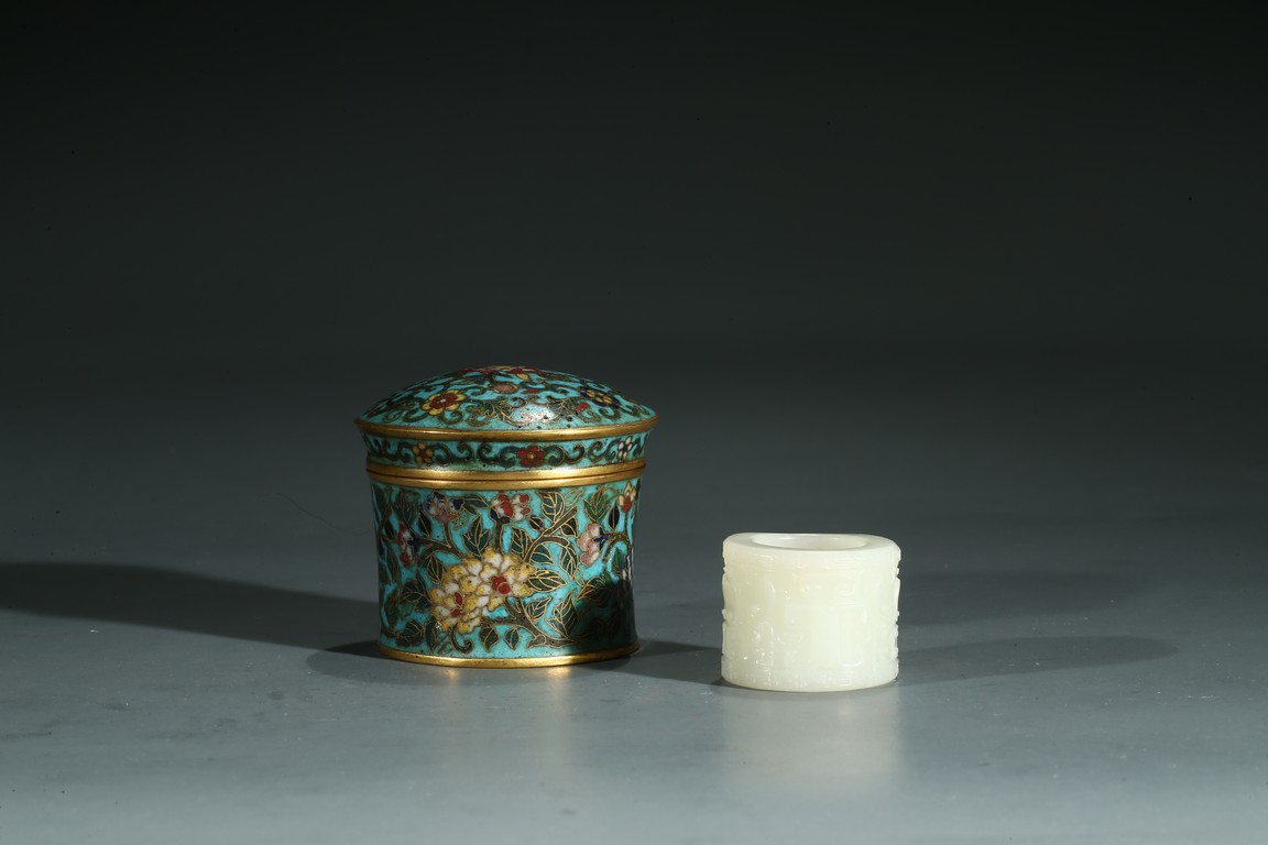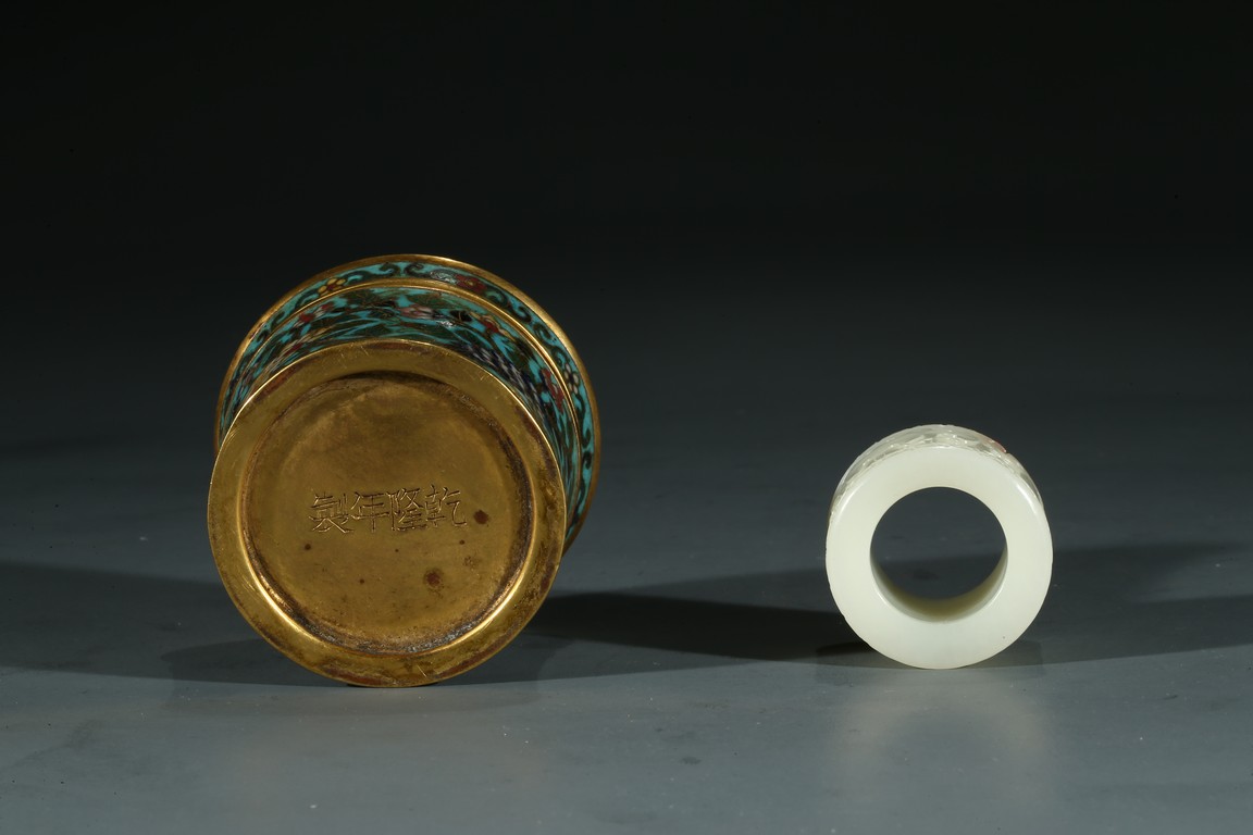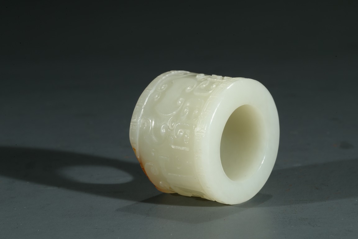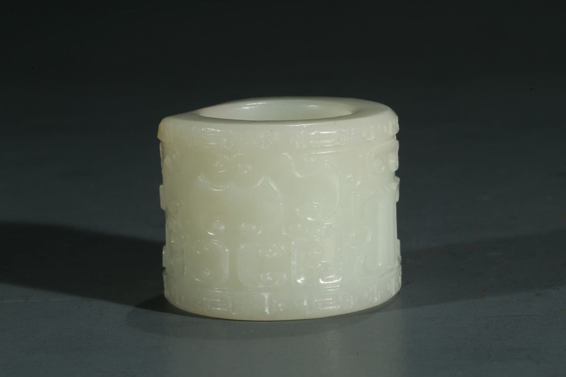The white jade archer's ring carved with archaistic taotie mask, accompanied with a fitted cloisonne enamel case, the base with four character Qianlong mark.