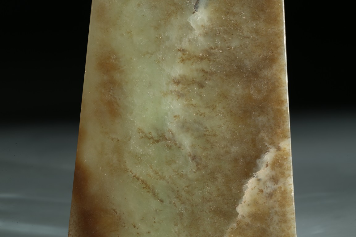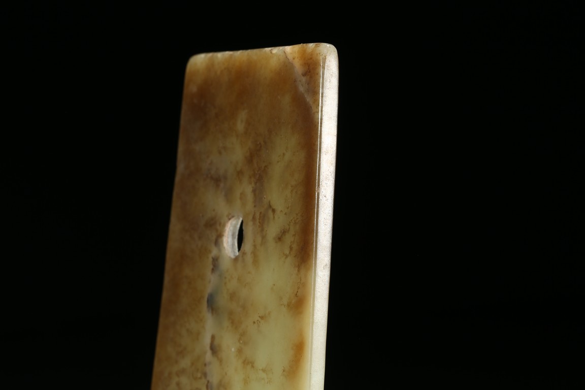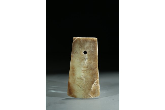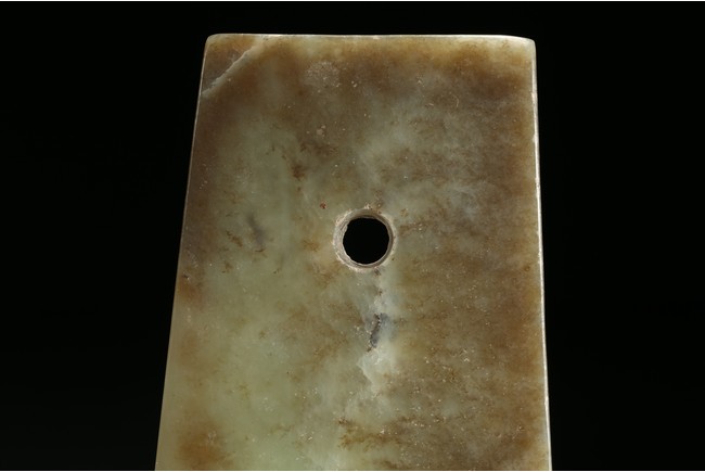 青白玉製成,光素無紋,器身黑褐色沁色,上有穿孔,應為固定玉斧之用。