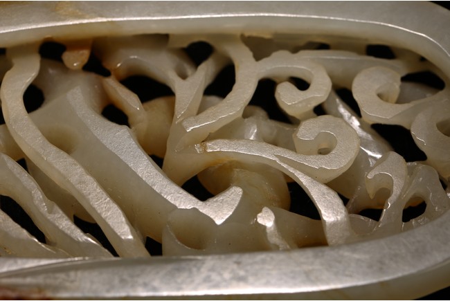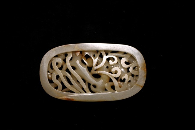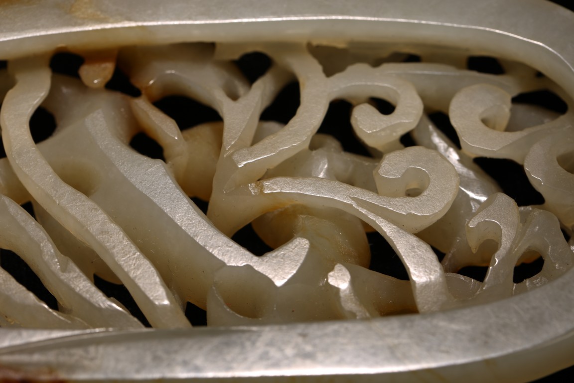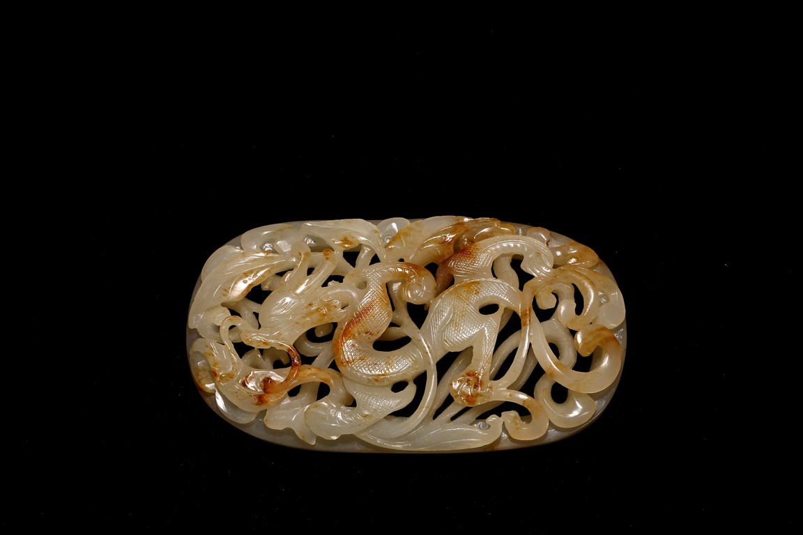 白玉制成,略有灰褐色沁,橢圓形,鏤雕龍紋穿梭於雲草之中。高額突出、圓眼、如意鼻、短唇,龍身矯健,身飾菱角形鱗紋,形象生動。來源: 北加州聖河西私人藏家收藏 Provenance: Private collection, San Jose, California