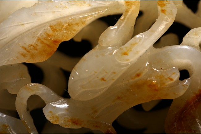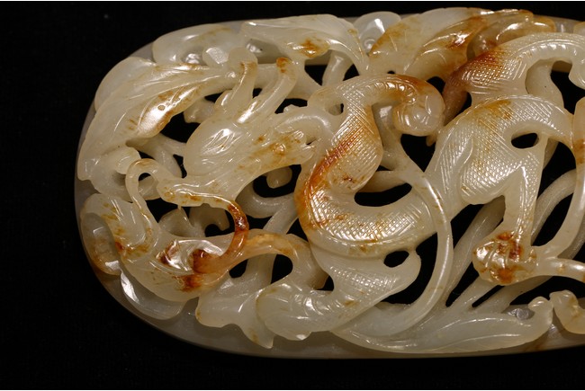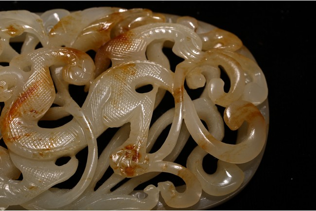 Qing Dynasty period. of ovoid form, skilfully worked and reticulated with a scaly dragon leaping amidst meandering scrolls, the stone is of white tone with russet inclusions.