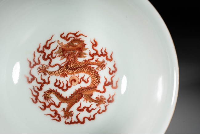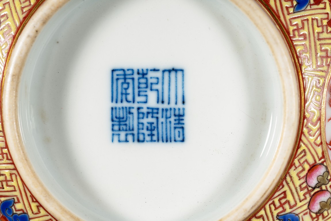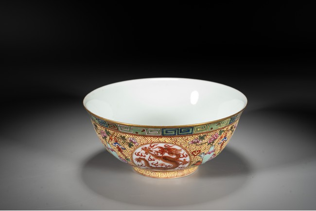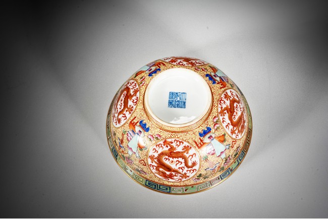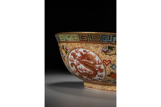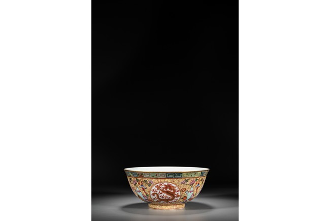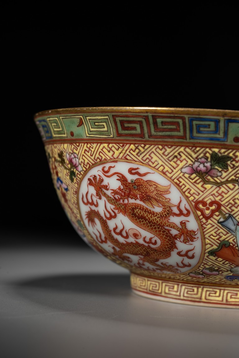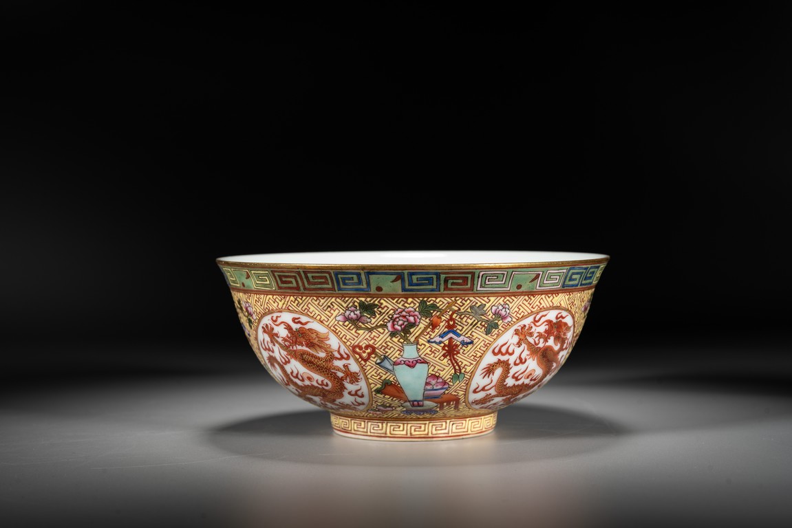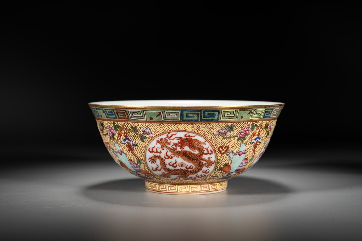 Rising from a short circle foot ring, the bowl exterior finely and alternatively painted antiques and medallions enclosing dragon, all reserved on key-fret ground, the interior further enamelled with a leaping dragon roundel, base with reign mark.