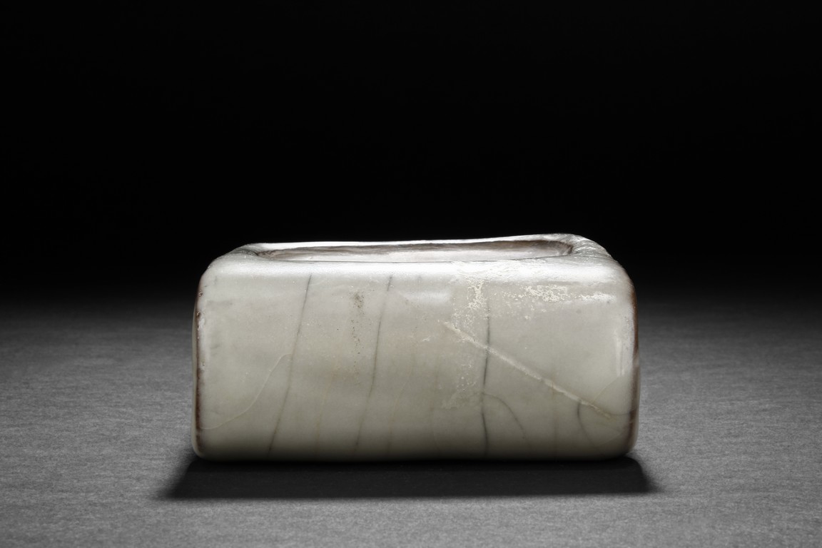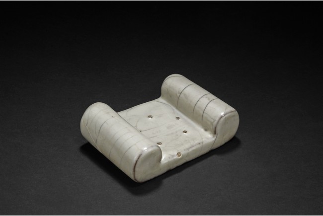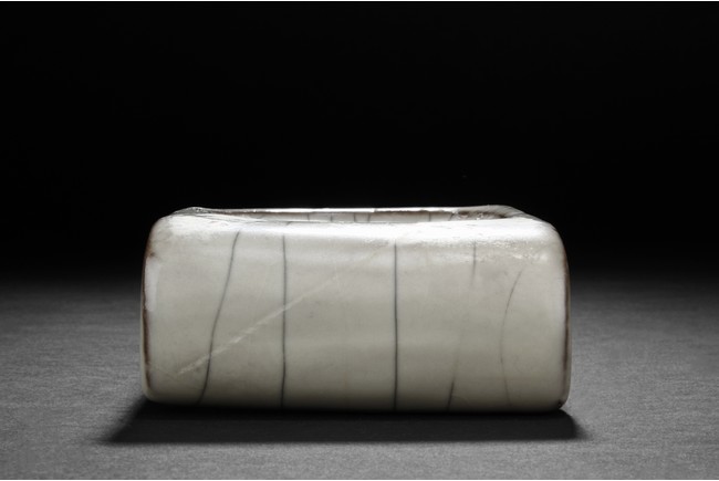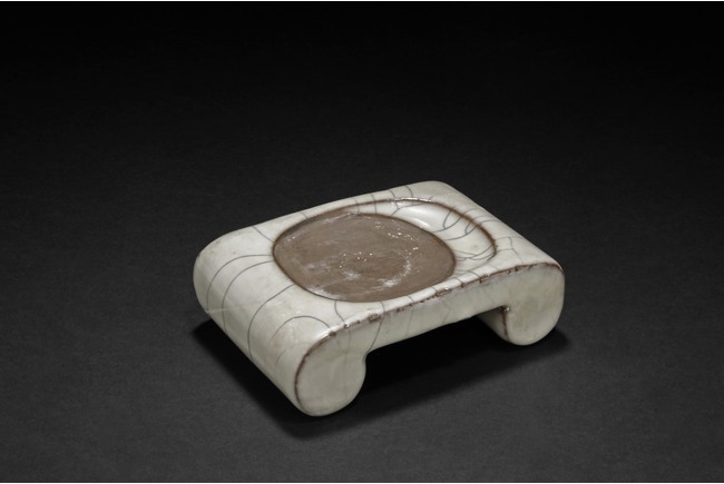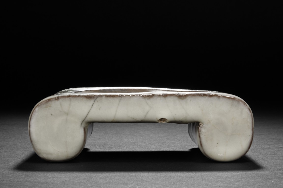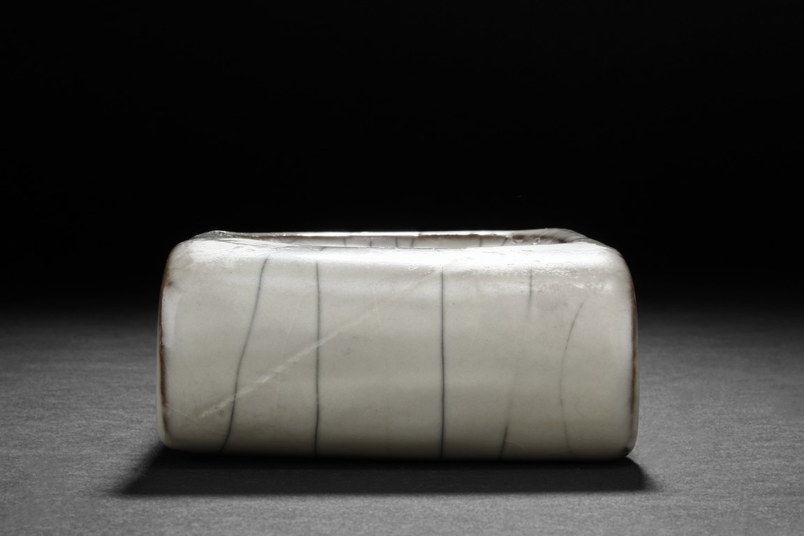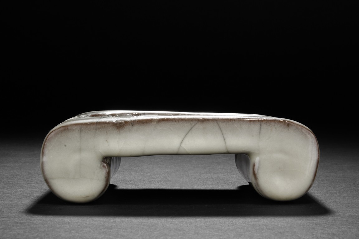 Qing Dynasty period. Of the shape of a wood stand with rectangular top and scrolled ends that form the supports, the Ge-type brush mixer is covered overall in a crackled glaze of white tone.