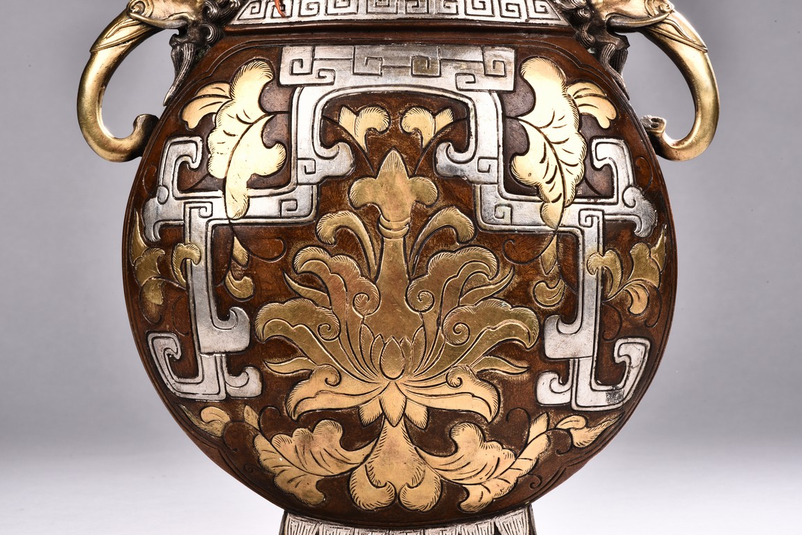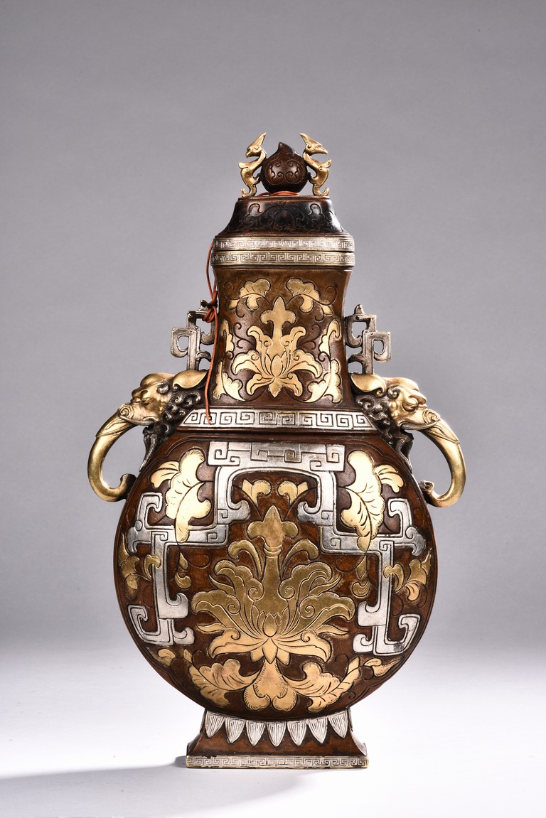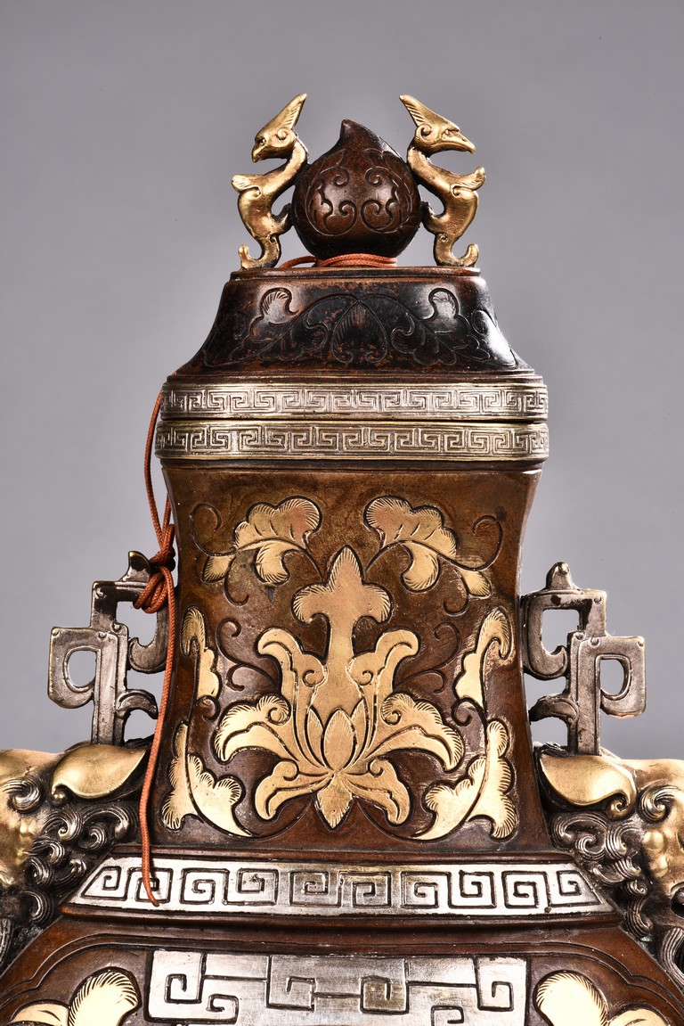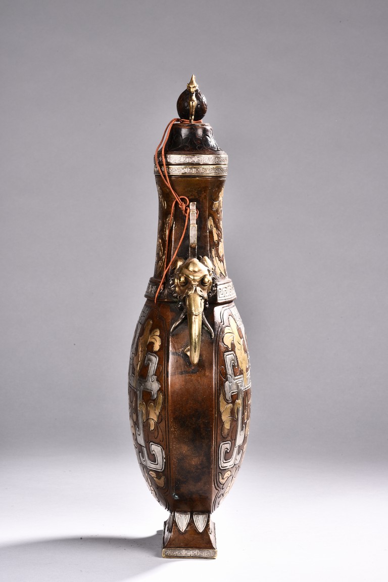 Raising from a splayed feet, the rounded body inlaid with floral decoration in silver and gold, the straight neck flanked by two elephant mask loop handles, the cover surmounted with a peach-formed finial flanked by two stylized mythical beasts.