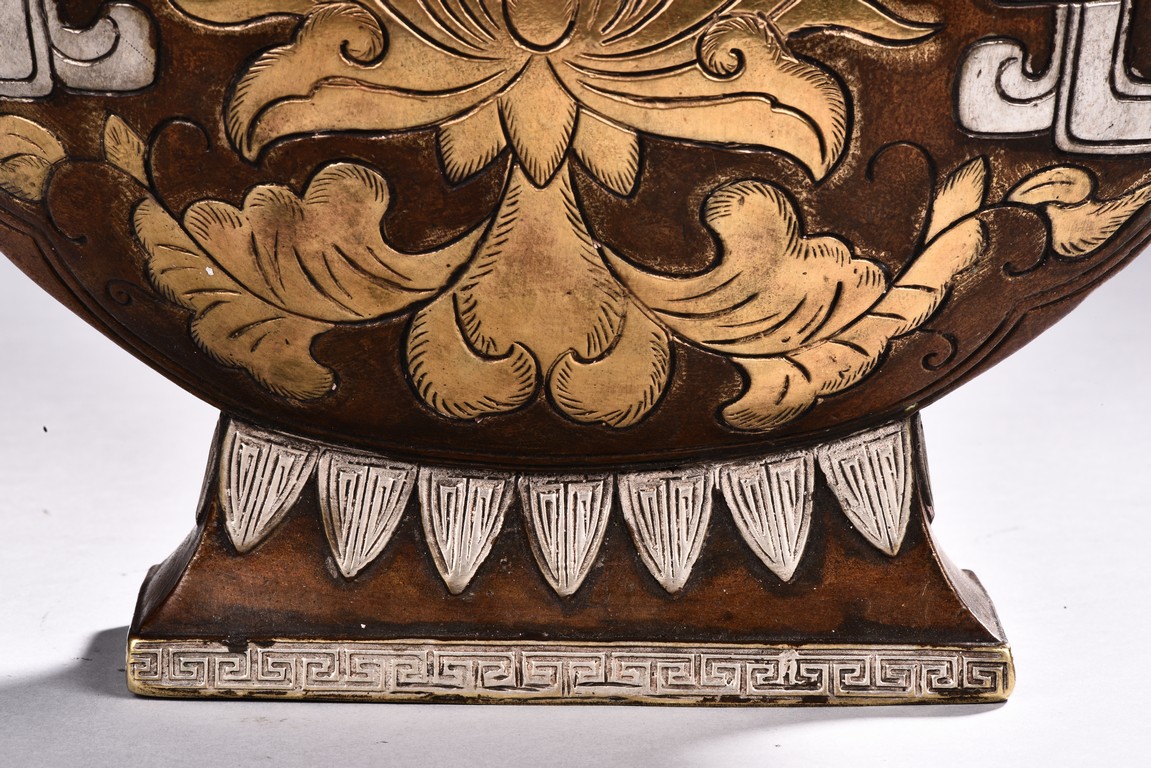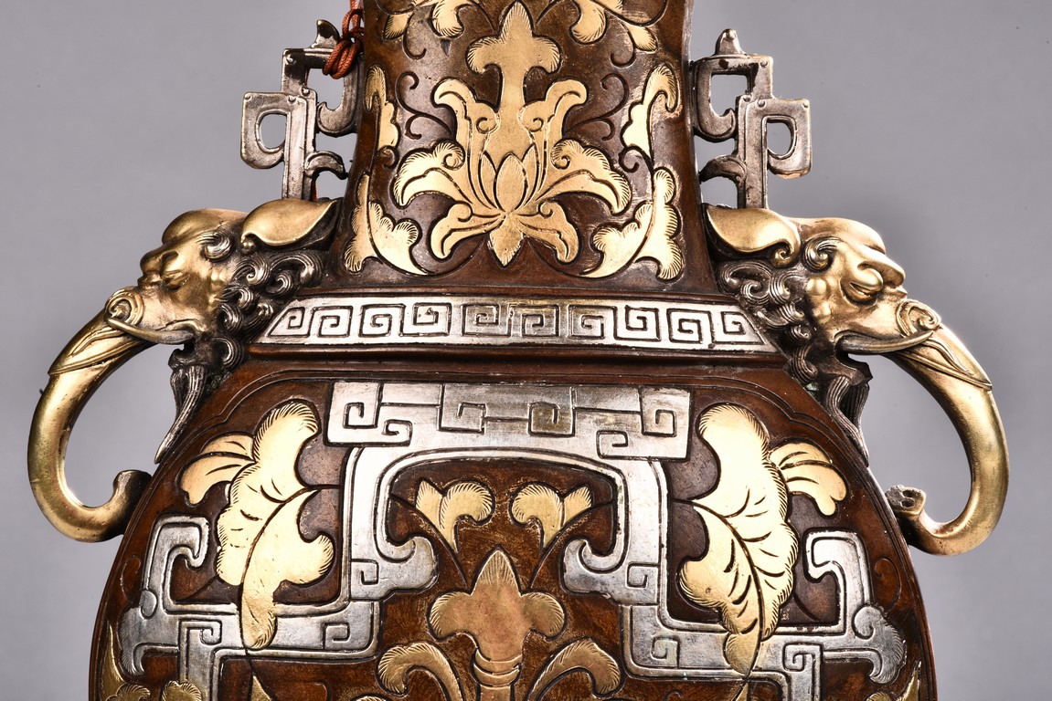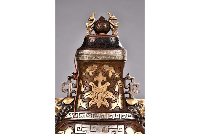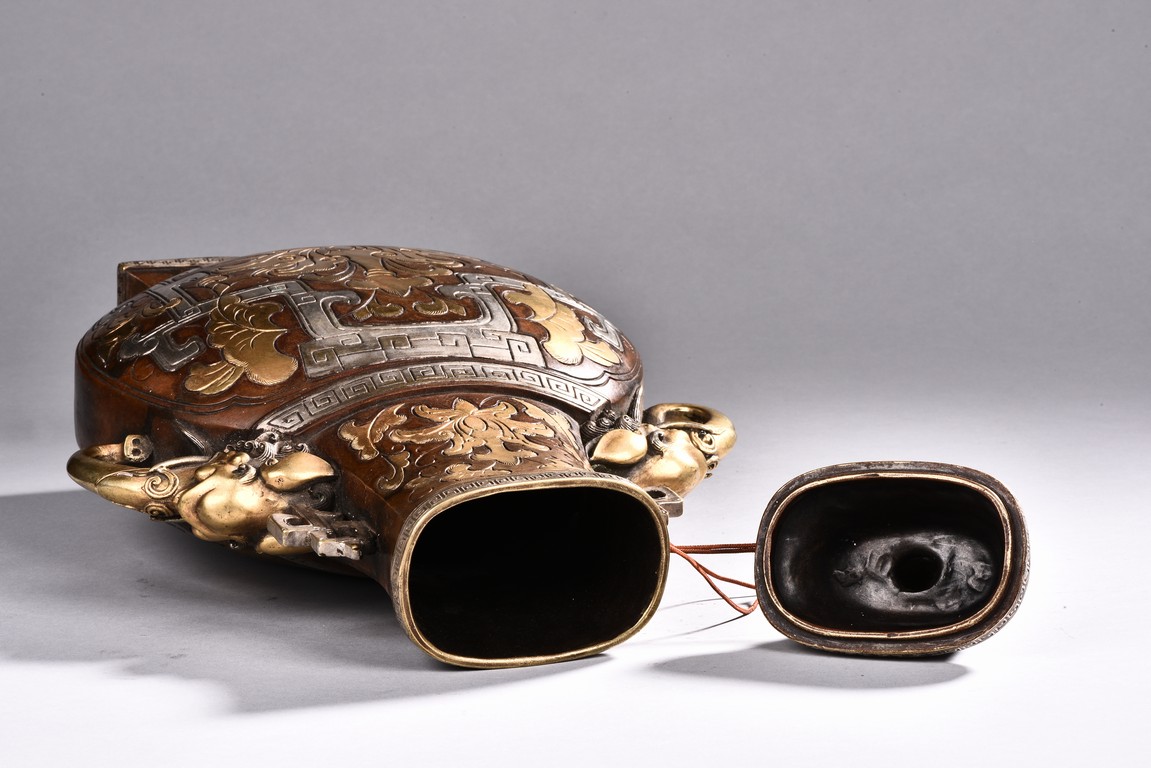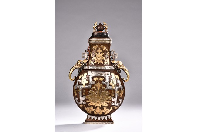 Raising from a splayed feet, the rounded body inlaid with floral decoration in silver and gold, the straight neck flanked by two elephant mask loop handles, the cover surmounted with a peach-formed finial flanked by two stylized mythical beasts.