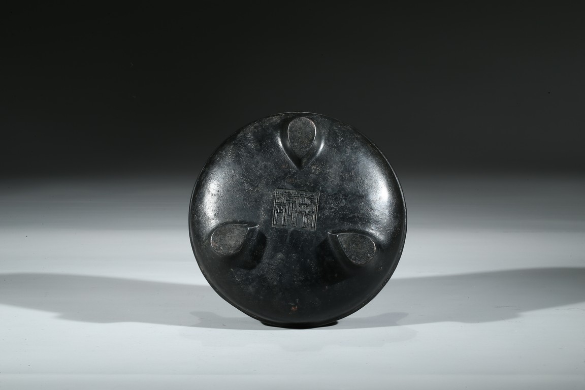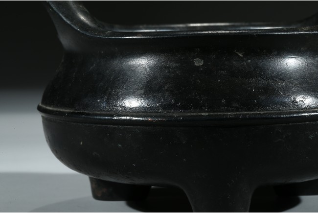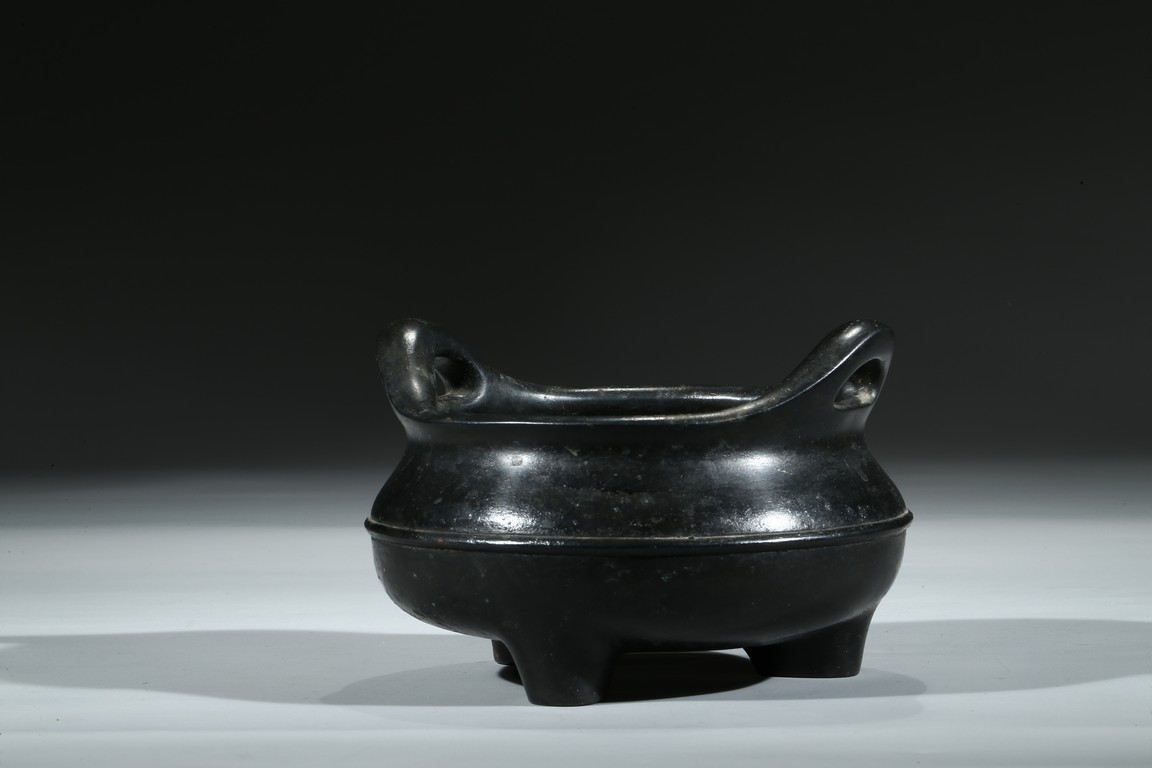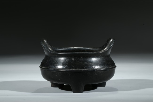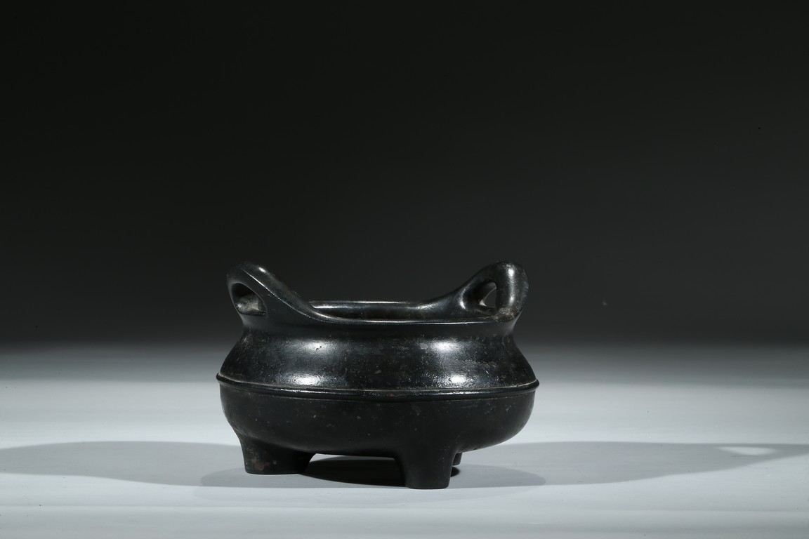 爐為橋耳,扁寬,雙耳窈窕,耳孔扁圓,口薄壁薄,膛底稍厚,腹圓垂,足精巧,無處不工,皮色呈黑漆古,實蘊藏經,寶光溢彩,珠瑩玉潤,銅質優良,為混合精煉銅也,柔綿如絨,細密膩實,“宣德年製”款識。整器包漿沉厚,入手沉穩,實屬難得。