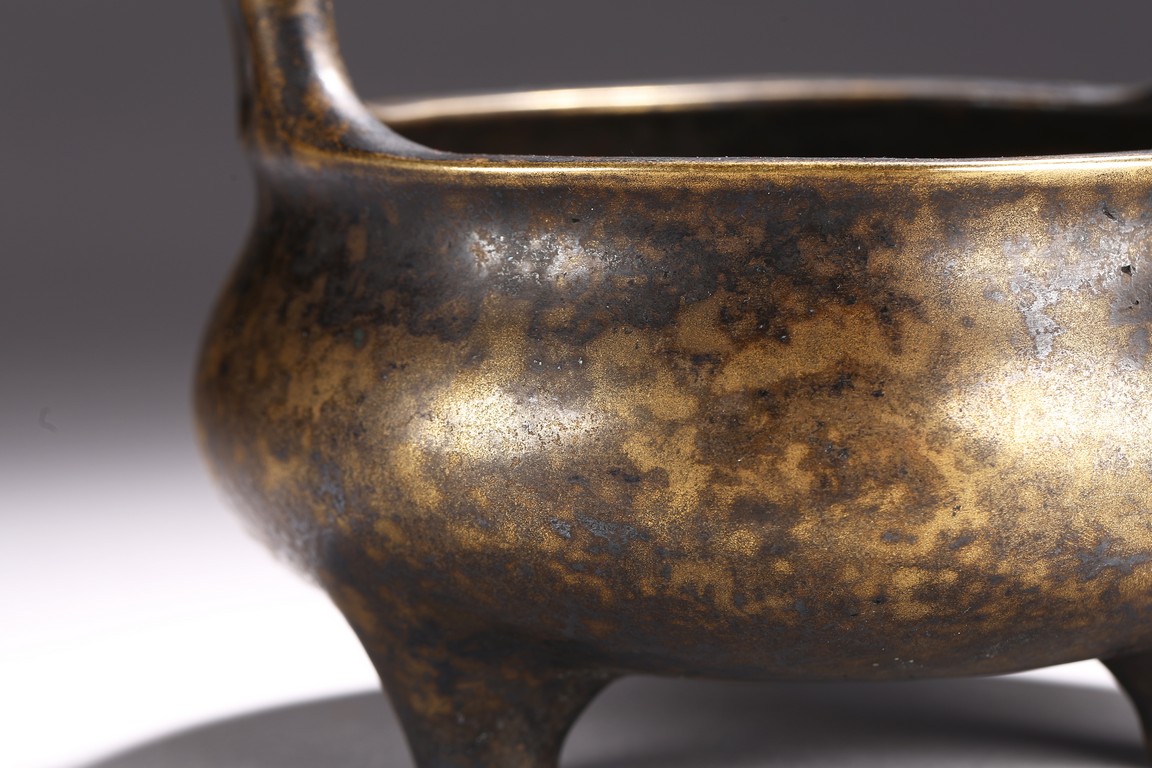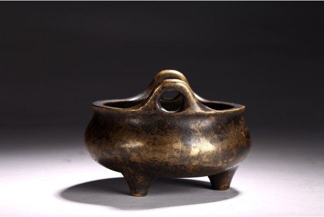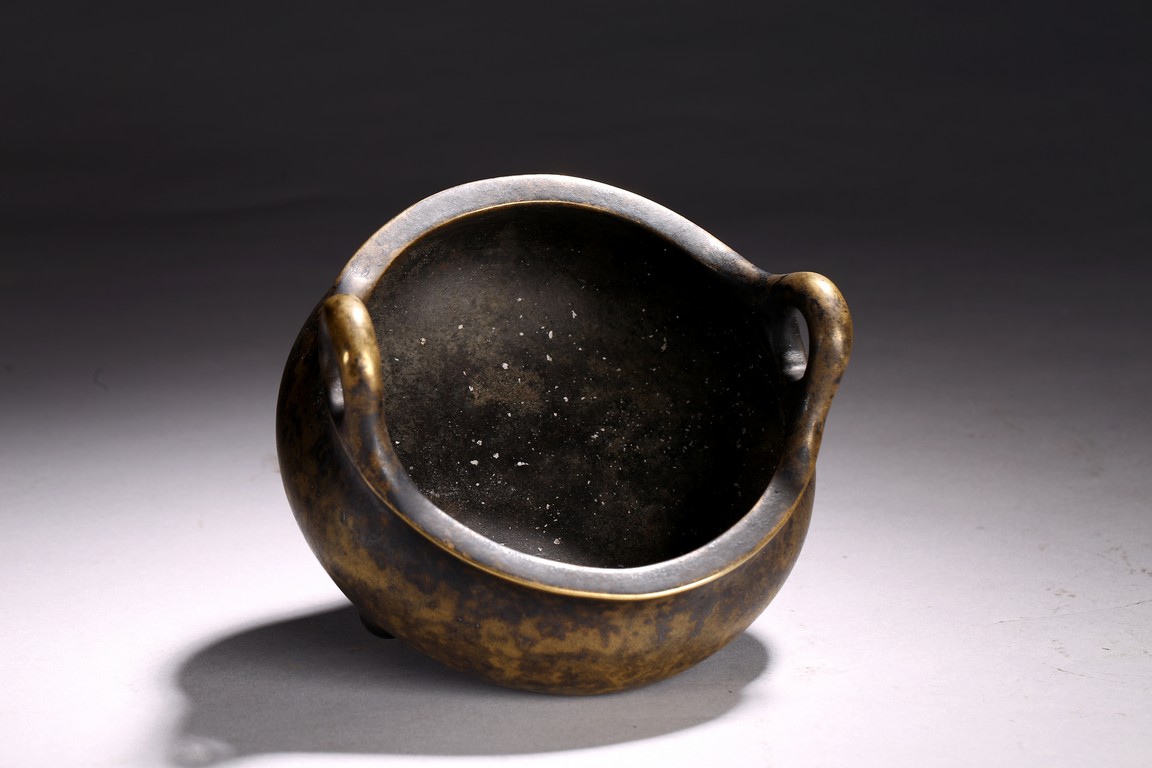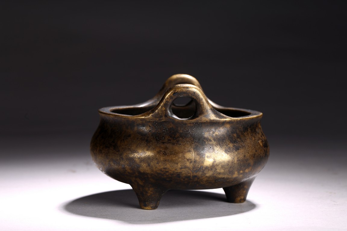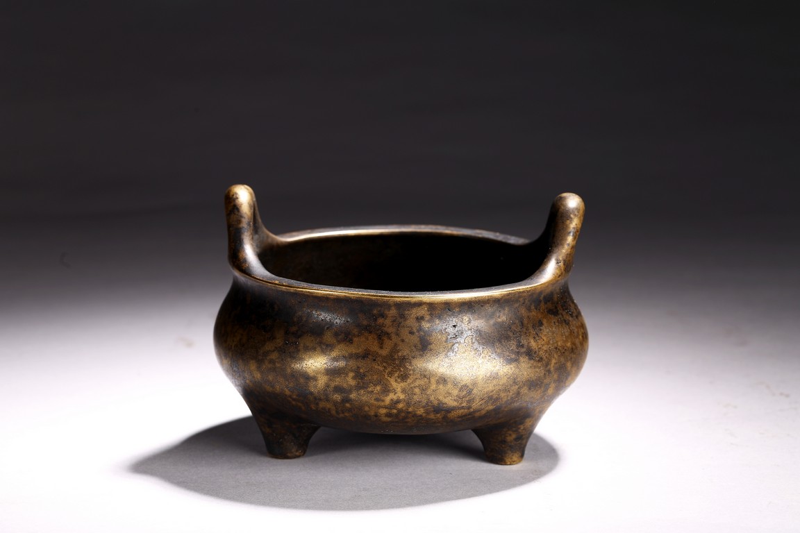 The patinated bronze tripod censer raised on three short feet, mouth rim cast with two raised upright handles, base with apocryphal six character Longqing mark.