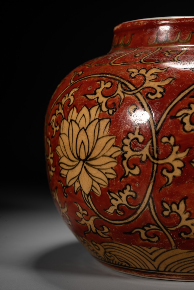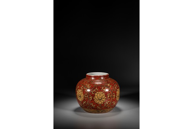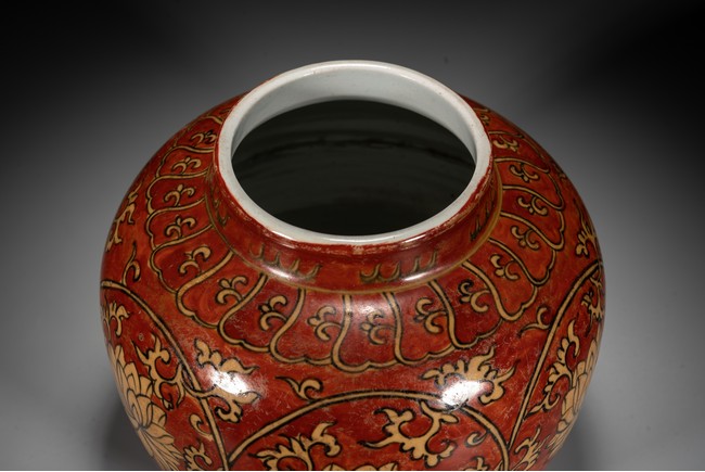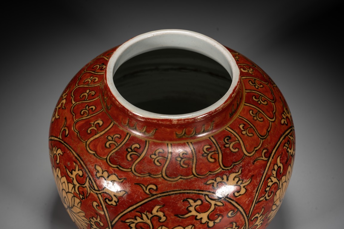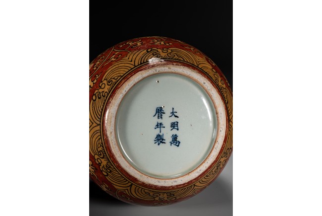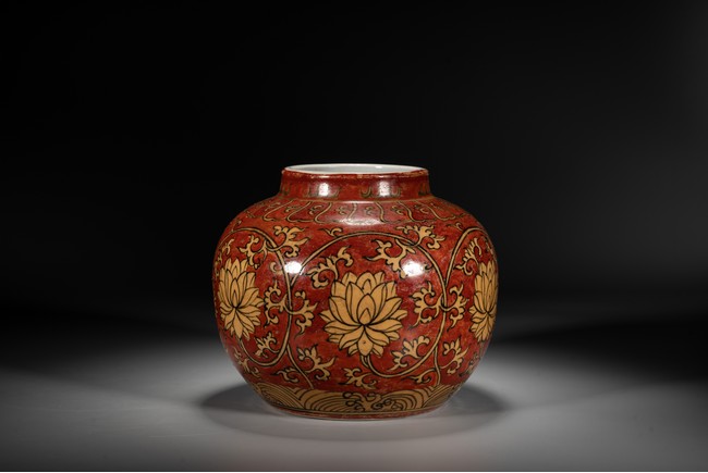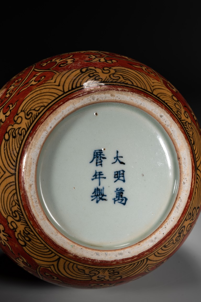 紅地黃彩製作需先以1300 攝氏溫度燒好白瓷,再於外壁釉上施以黃彩以較低的溫度入窯覆燒,並以礬紅彩塗地,然後第三次入窯燒造。因過程繁覆,難度極高,故傳世品數量稀罕。本品短頸,鼓腹,腹漸下收,圈足,器型端正,古樸大方。本品彩繪製作工藝極為覆雜,以低溫礬紅為底色,以黃釉填充“纏枝花卉紋”,所飾之紅彩色澤鮮妍,華麗凝重,塗施勻凈厚潤,雖然歷經過往四百餘年的風霜,表面留下無數細細碎碎的磨損痕,卻絲毫不減其風韻。“大明萬歷年制”款識。