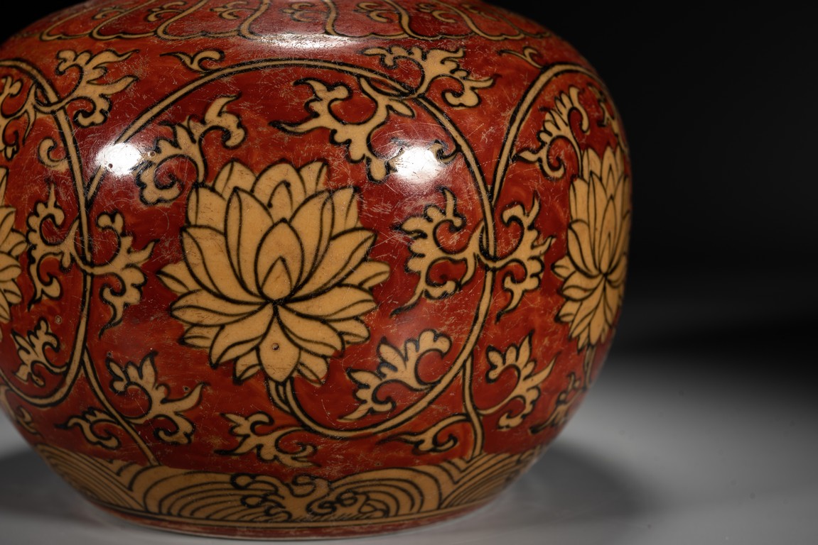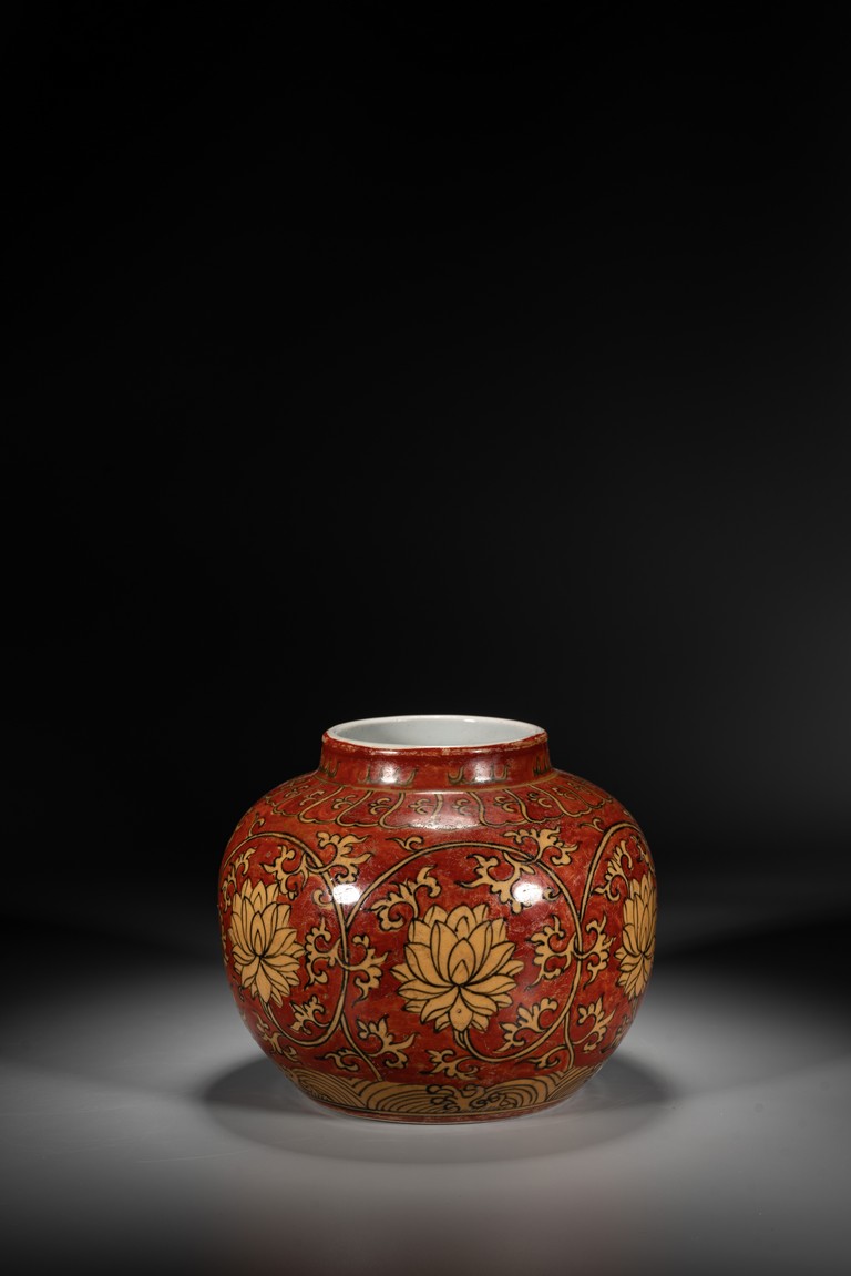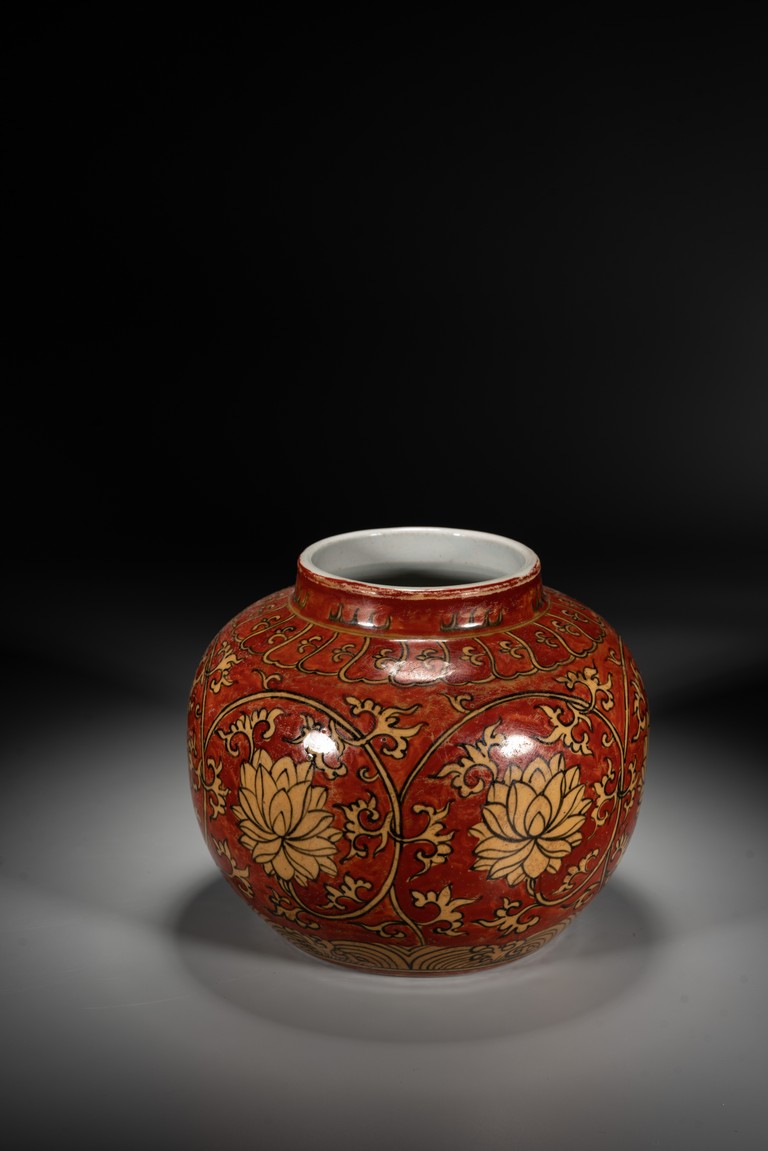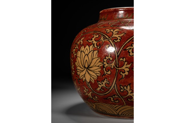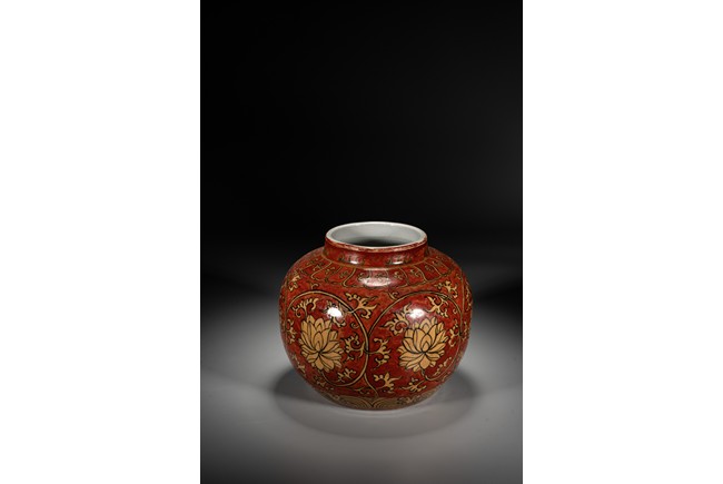 紅地黃彩製作需先以1300 攝氏溫度燒好白瓷,再於外壁釉上施以黃彩以較低的溫度入窯覆燒,並以礬紅彩塗地,然後第三次入窯燒造。因過程繁覆,難度極高,故傳世品數量稀罕。本品短頸,鼓腹,腹漸下收,圈足,器型端正,古樸大方。本品彩繪製作工藝極為覆雜,以低溫礬紅為底色,以黃釉填充“纏枝花卉紋”,所飾之紅彩色澤鮮妍,華麗凝重,塗施勻凈厚潤,雖然歷經過往四百餘年的風霜,表面留下無數細細碎碎的磨損痕,卻絲毫不減其風韻。“大明萬歷年制”款識。