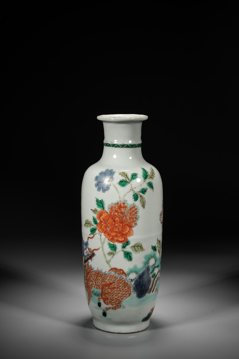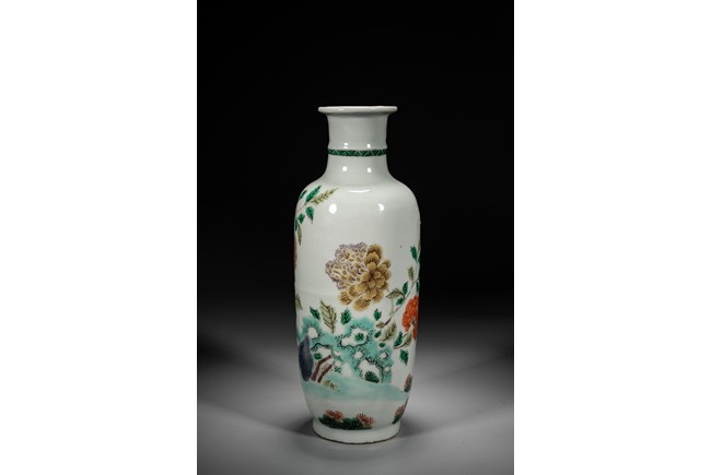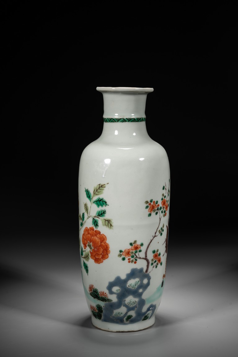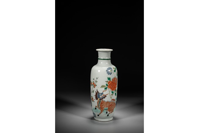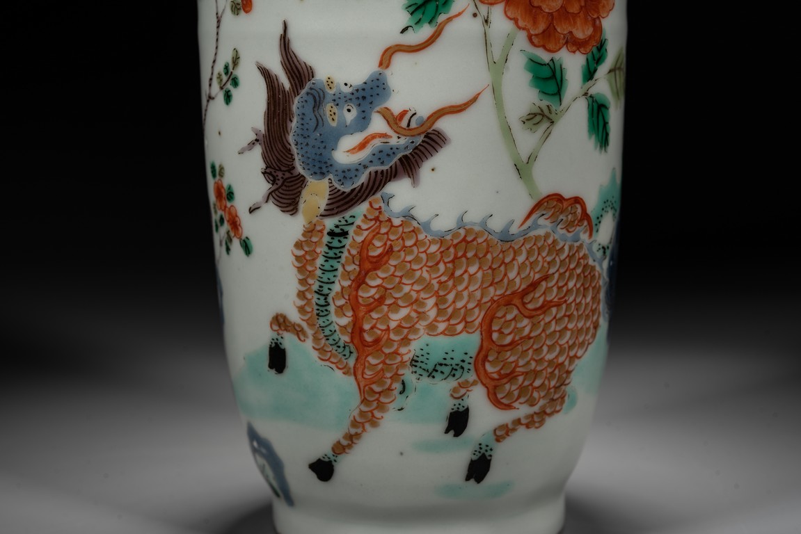 此瓶圈口外撇,直頸,溜肩,筒腹,圈足。頸部一圈綠彩幾何紋,腹部通體以五彩繪制麒麟花卉紋飾,紋樣精美,繪制精細,構圖疏密有致,寓意吉祥。整體器型秀美端莊,修胎規整,胎質細膩堅實,釉面潔凈亮潤,施彩艷麗不失淡雅,保存完好,時代特征明顯,收藏佳器。