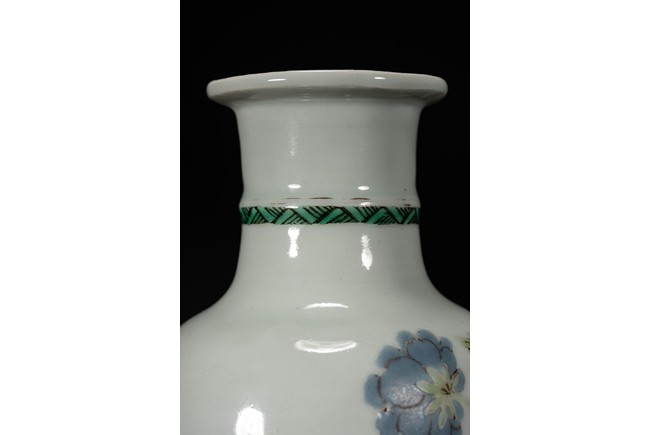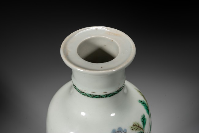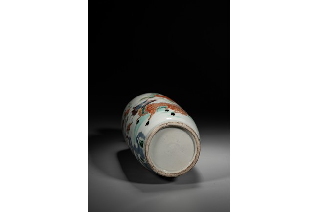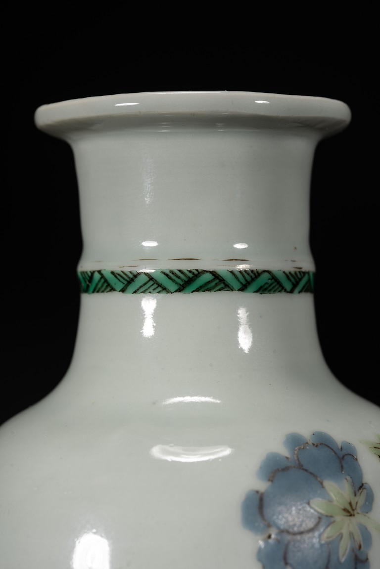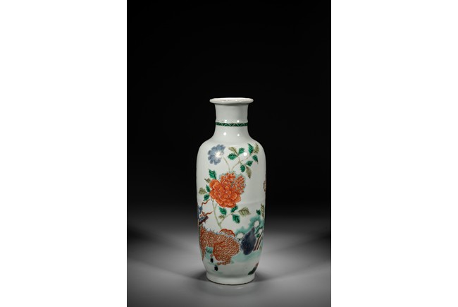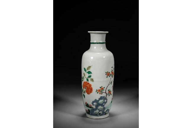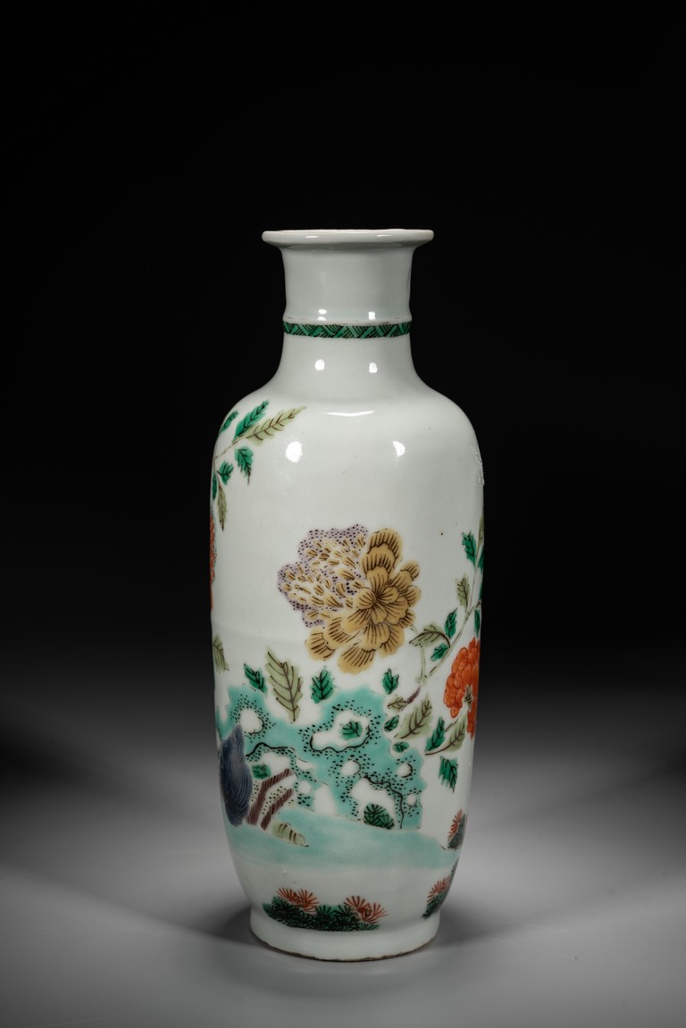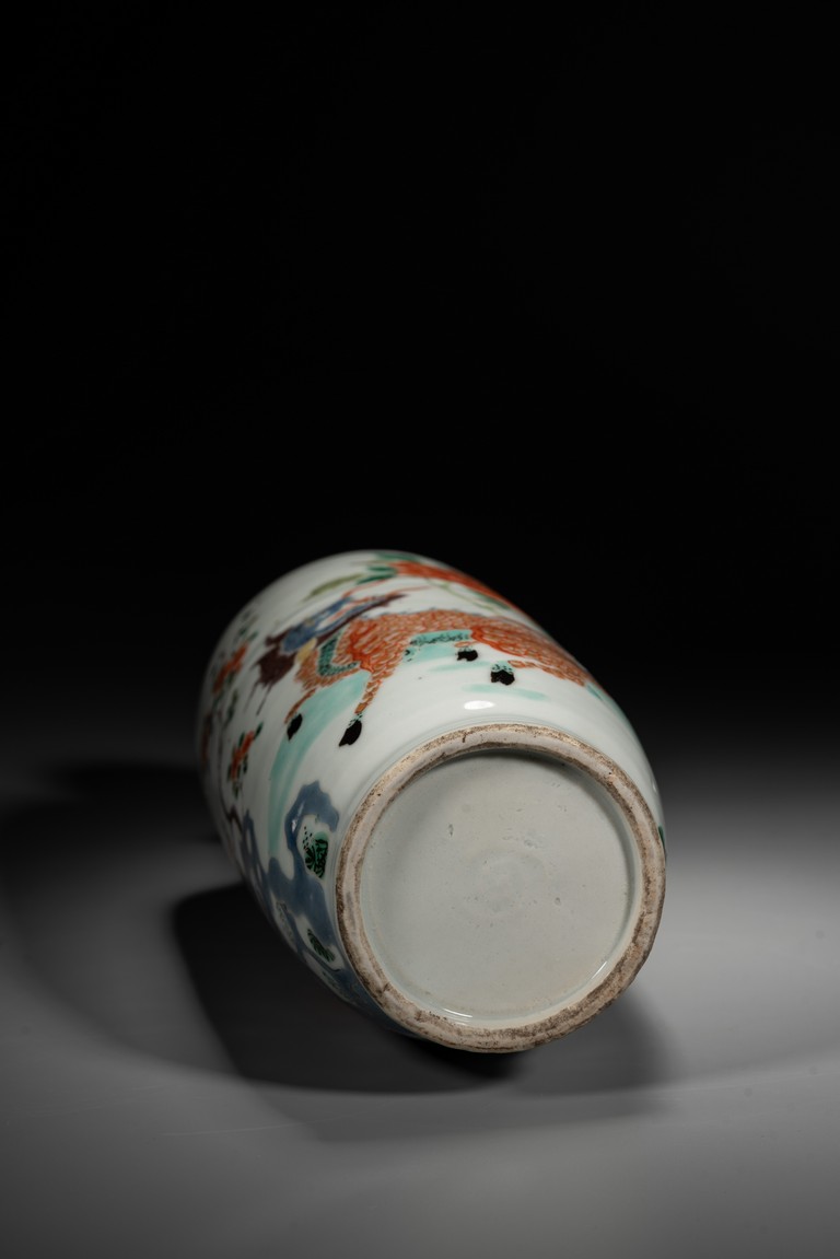 此瓶圈口外撇,直頸,溜肩,筒腹,圈足。頸部一圈綠彩幾何紋,腹部通體以五彩繪制麒麟花卉紋飾,紋樣精美,繪制精細,構圖疏密有致,寓意吉祥。整體器型秀美端莊,修胎規整,胎質細膩堅實,釉面潔凈亮潤,施彩艷麗不失淡雅,保存完好,時代特征明顯,收藏佳器。