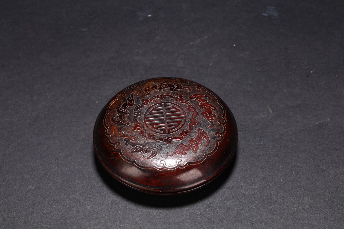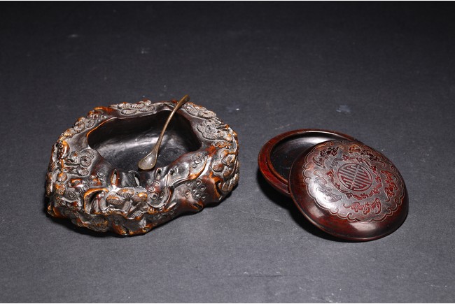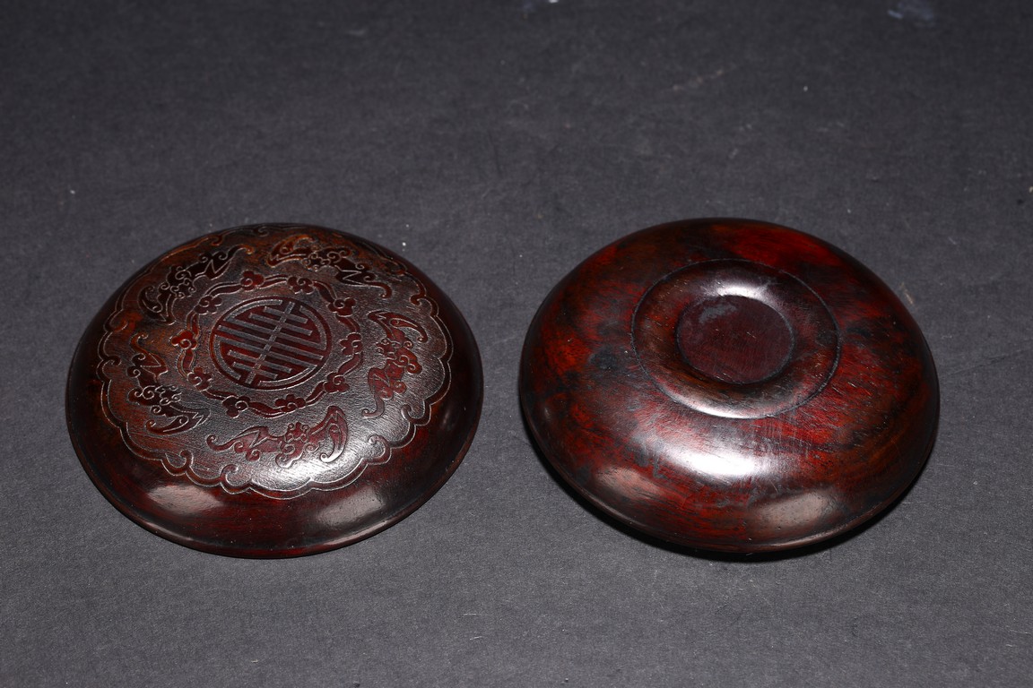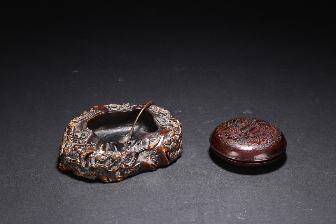 Qing Dynasty period. Consisting of circular ink box with stylized shou design on the cover, and naturalistically carved washer in the form of a shallow tree trunk, interior hollowed and exterior carved with gnarled pine branches and leaves.