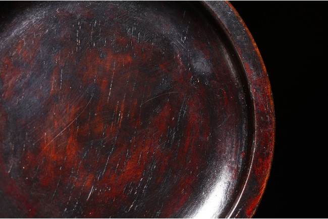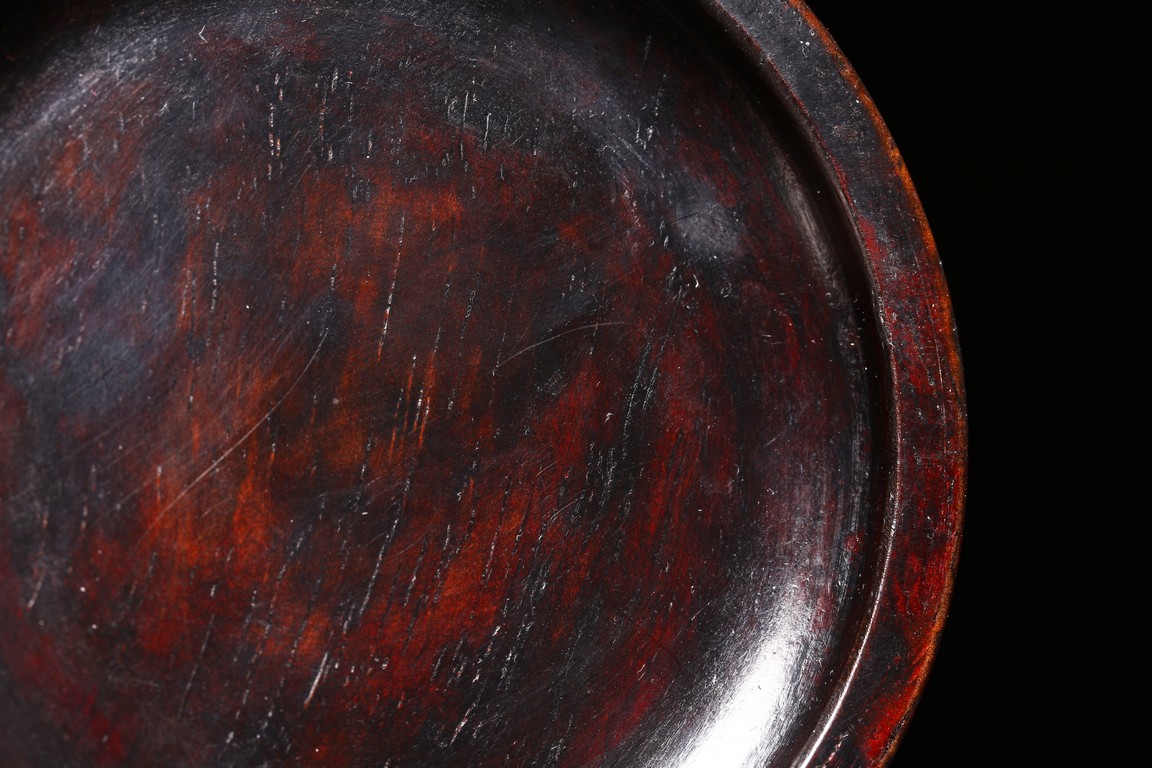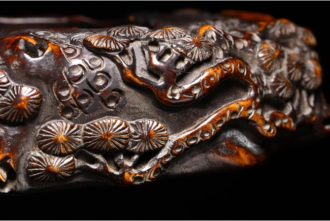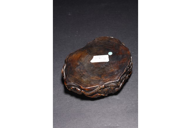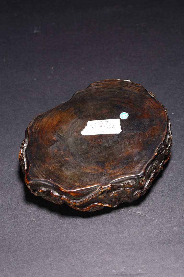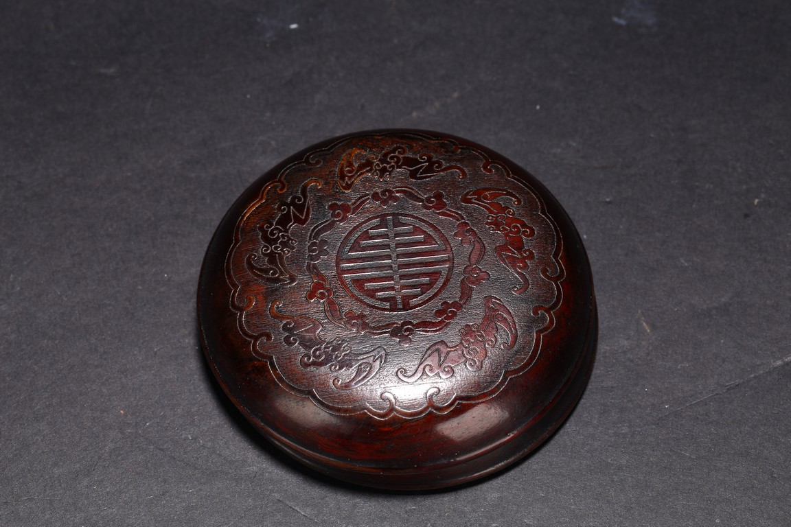 Qing Dynasty period. Consisting of circular ink box with stylized shou design on the cover, and naturalistically carved washer in the form of a shallow tree trunk, interior hollowed and exterior carved with gnarled pine branches and leaves.