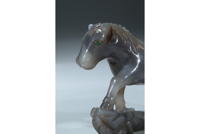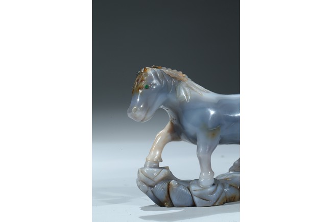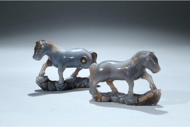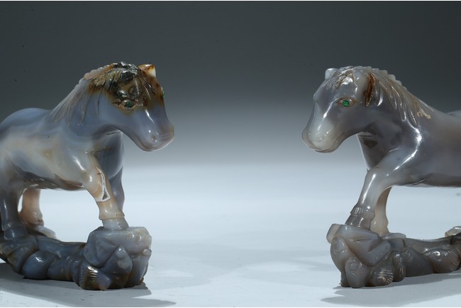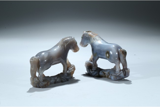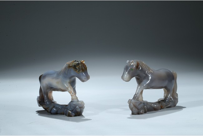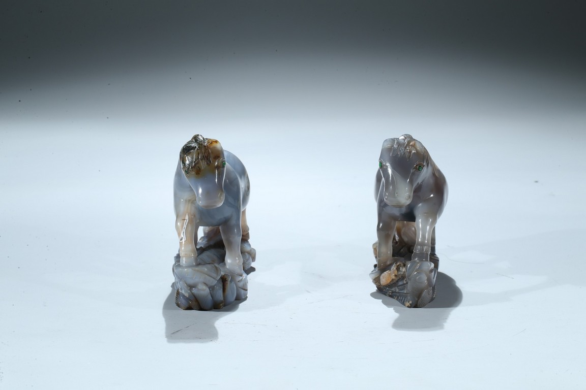 Qing Dynasty period. Each is shown standing on a rockwork, mane and tail detailed with incised lines.