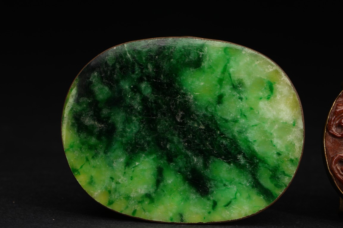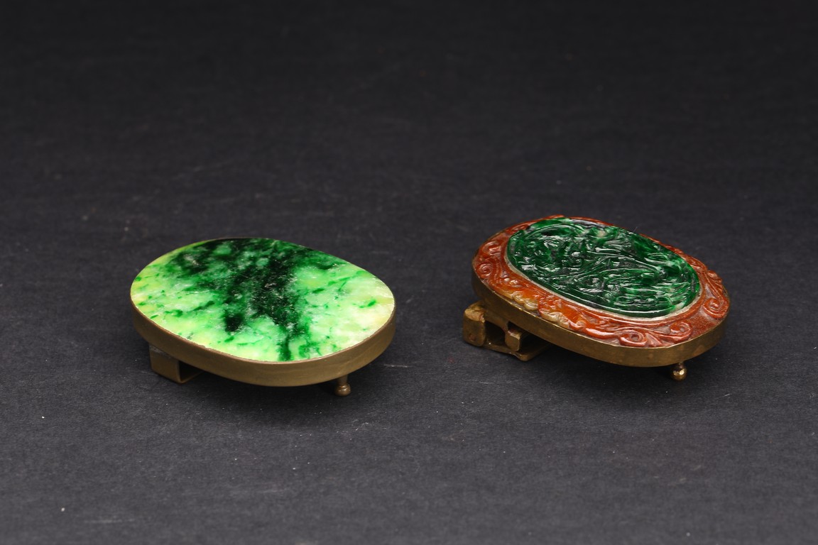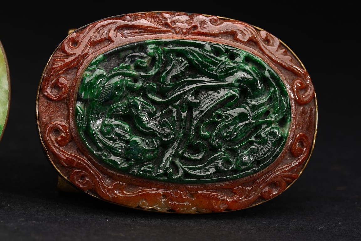 A GROUP OF TWO JADEITE AND DYED ORGANIC BROOCHES 清 翡翠, 虯角帶飾两件