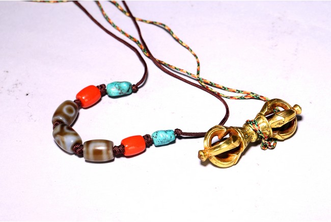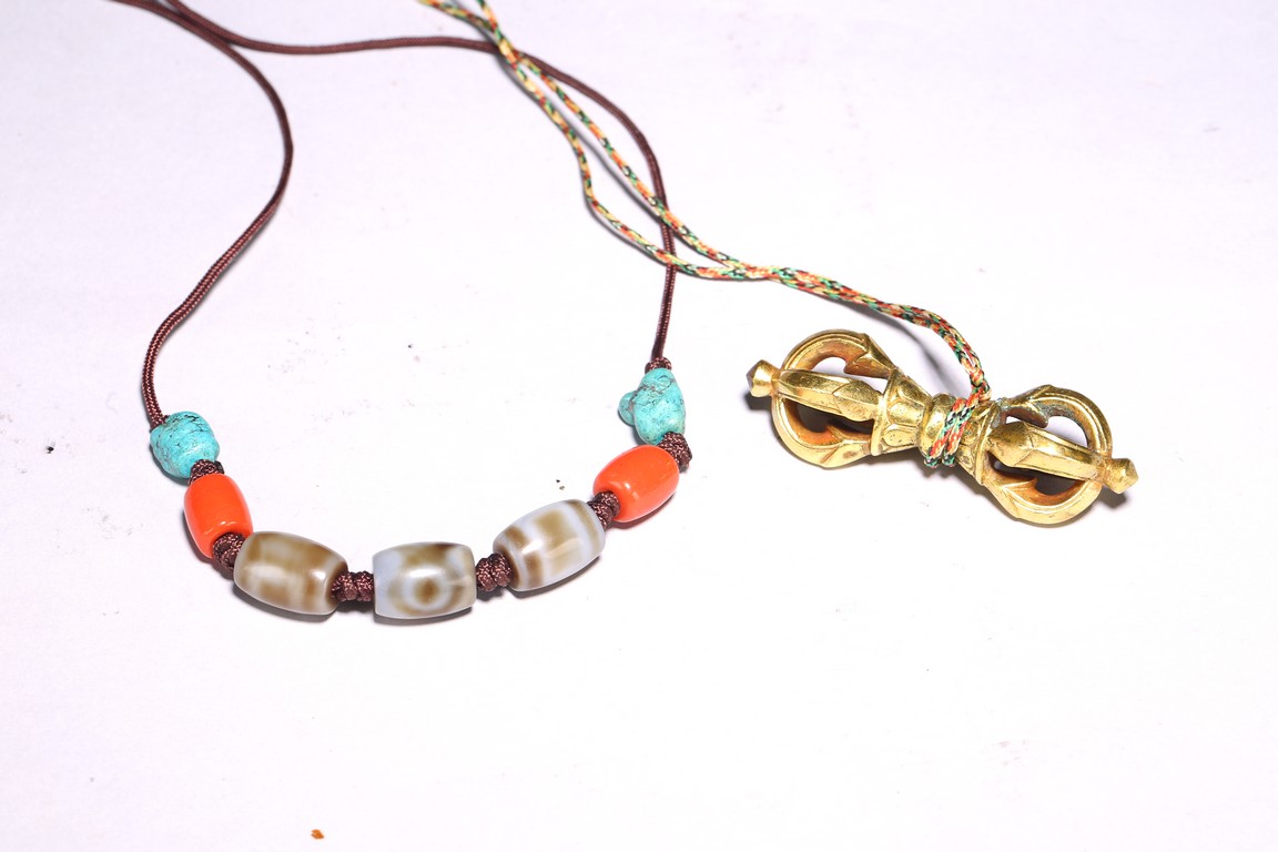 A Dzi bead necklace and gilt bronze vajra