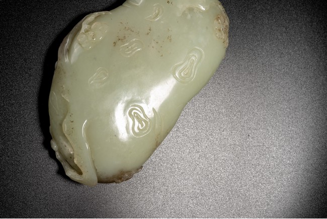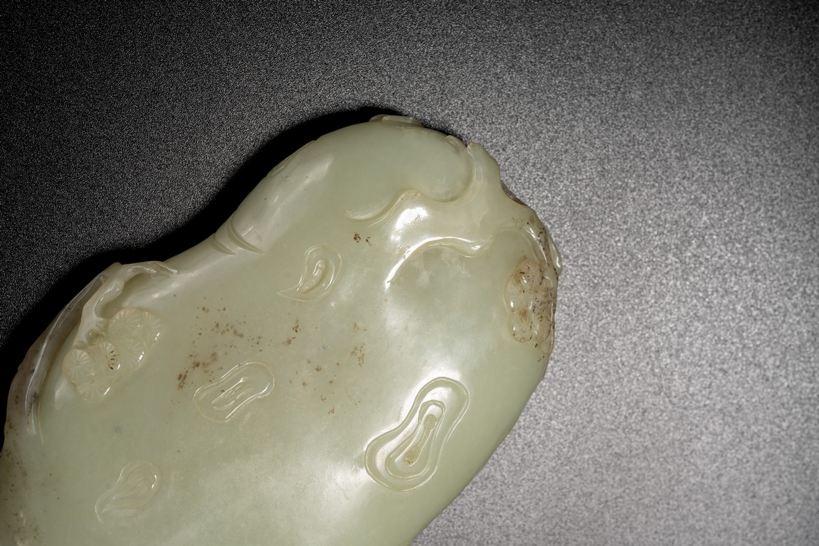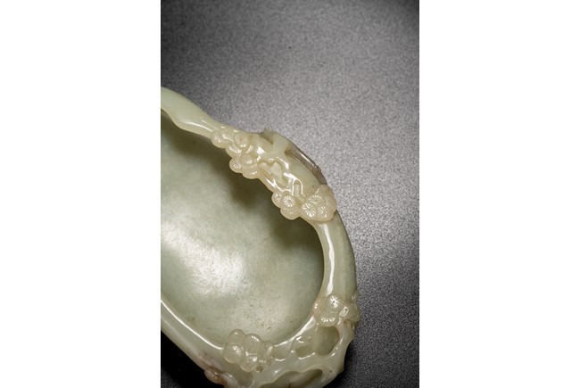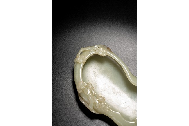 此筆洗形制規整,造型精美典雅,線條流暢而富有張力。作者以和田白玉鏤出洗池,以幾株勁松分部於兩側,交相呼應,勁松的遒勁與玉器隨型之靈動,形成對比,卻又和諧統一,表現文人之風骨柔情,回味無窮。
