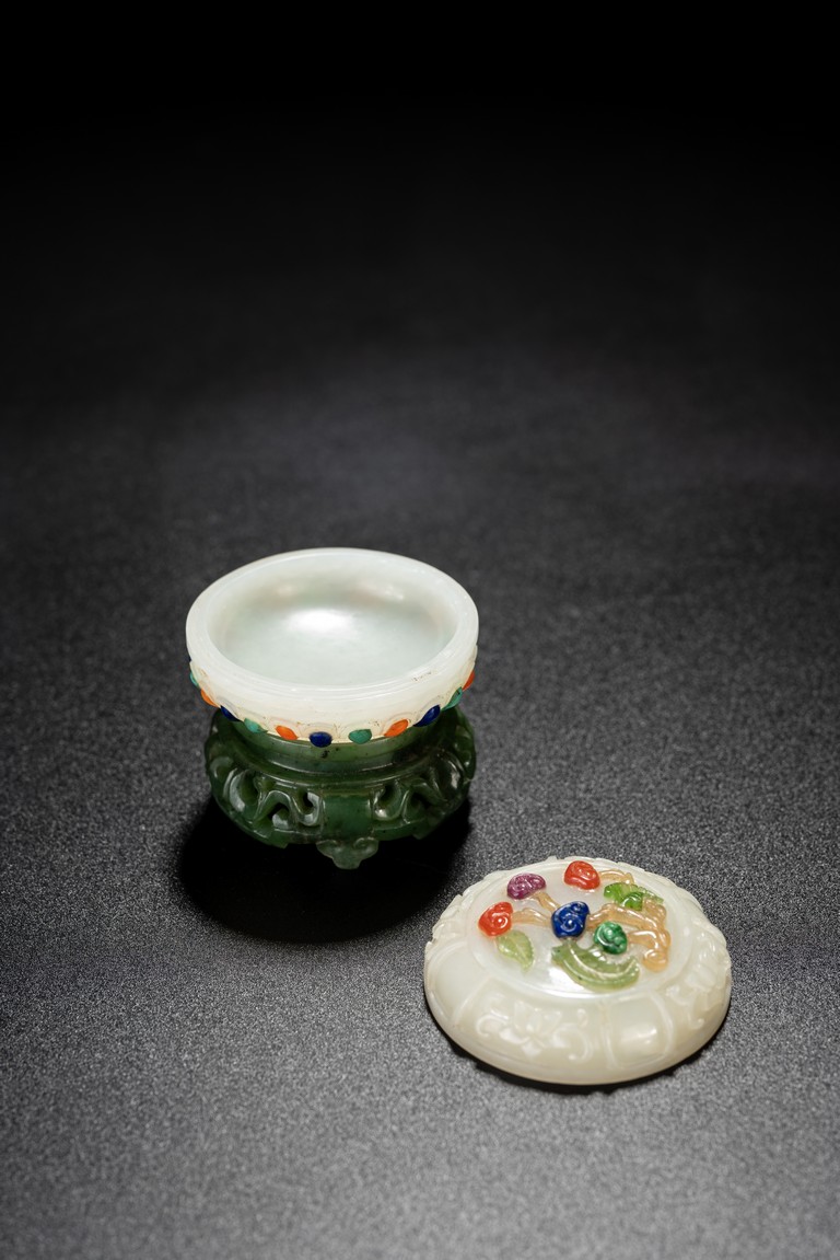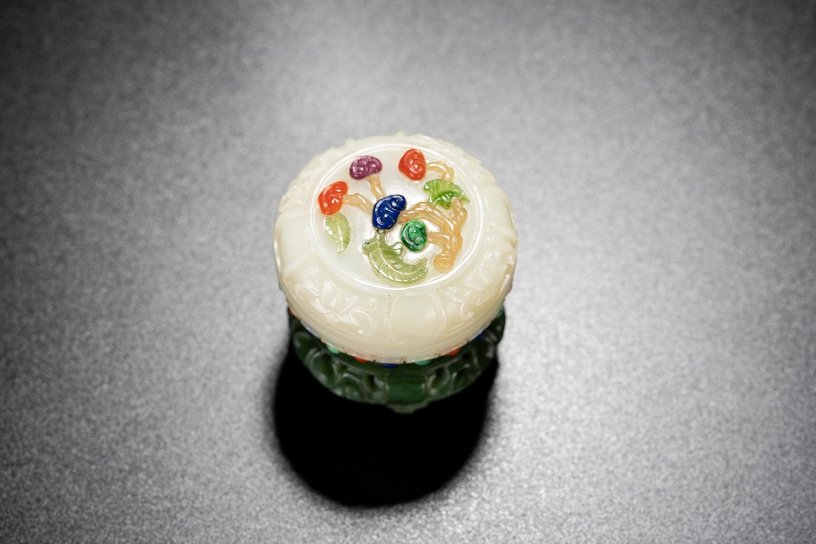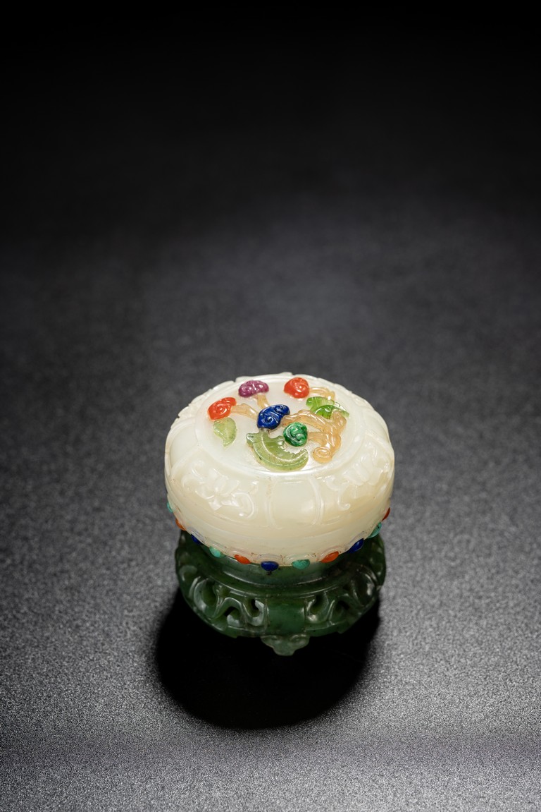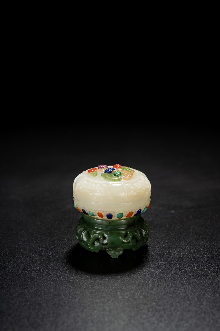 盒為子母口,和田玉材質,瑩潤細膩,蓋先雕琢花卉紋,後在其中以多寶鑲嵌,出靈芝紋飾,盒身亦鑲嵌多寶石,與蓋呼應,下呈和田碧玉纏枝蓮紋圓底座,整體保存完整,端莊典雅,乃文房雅器。