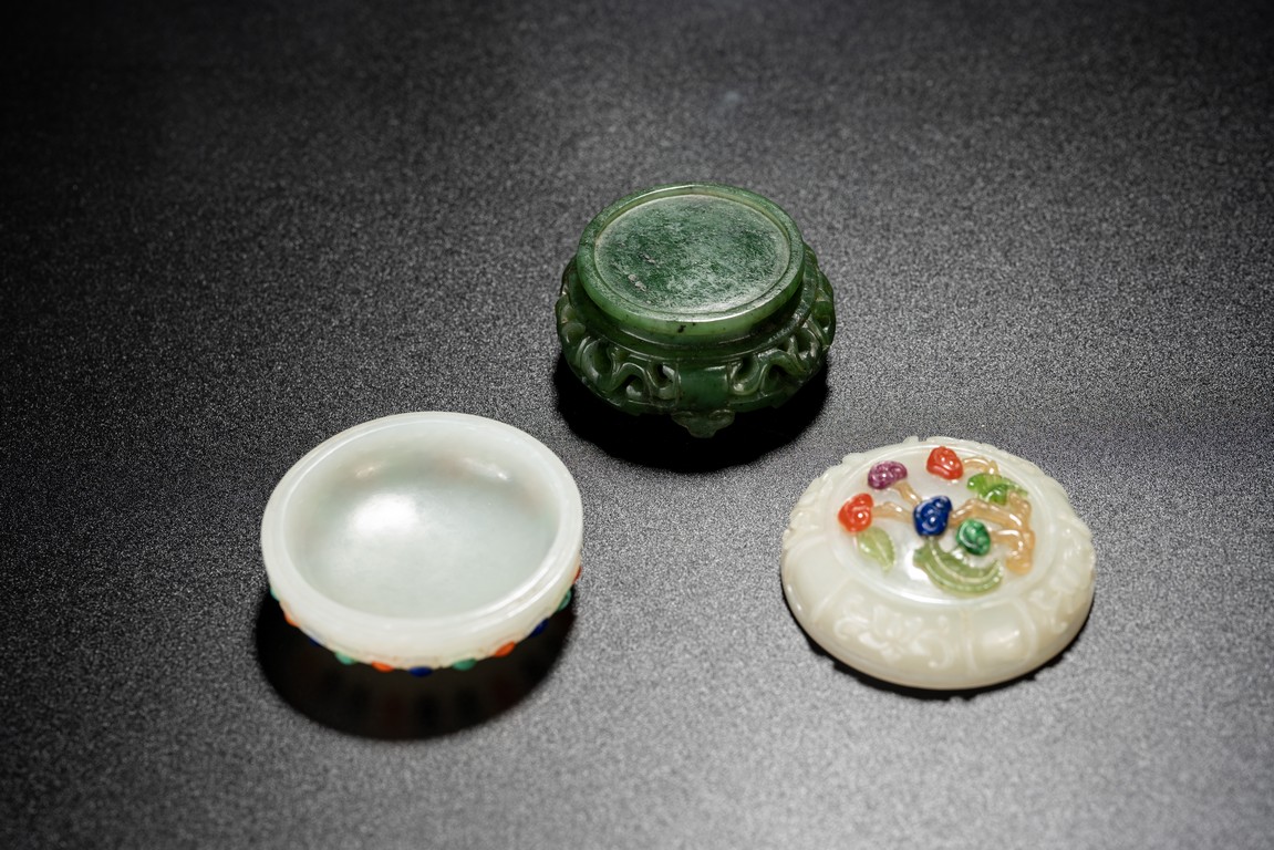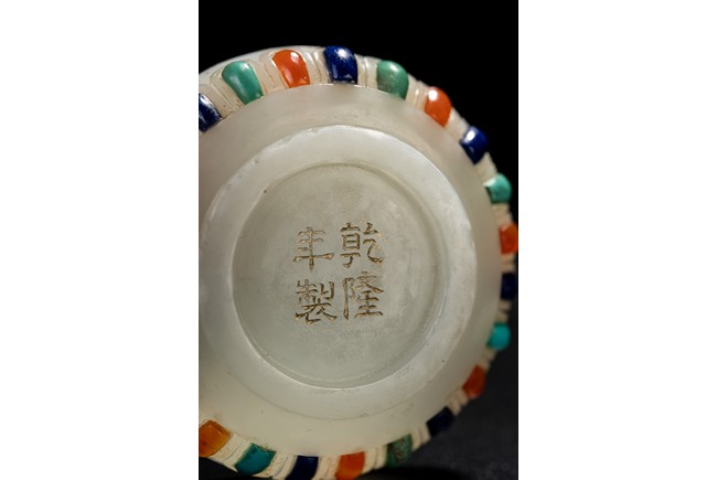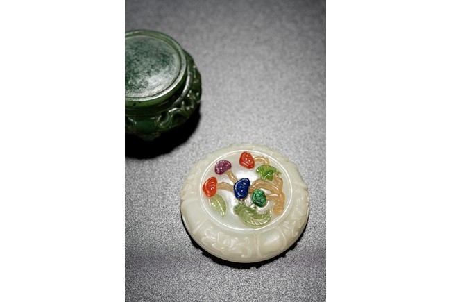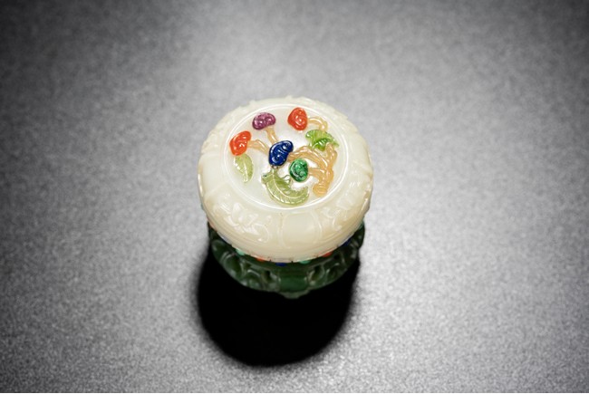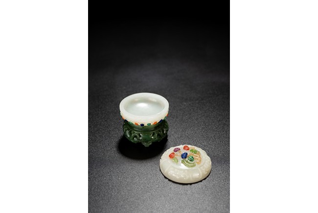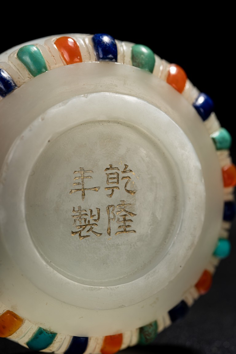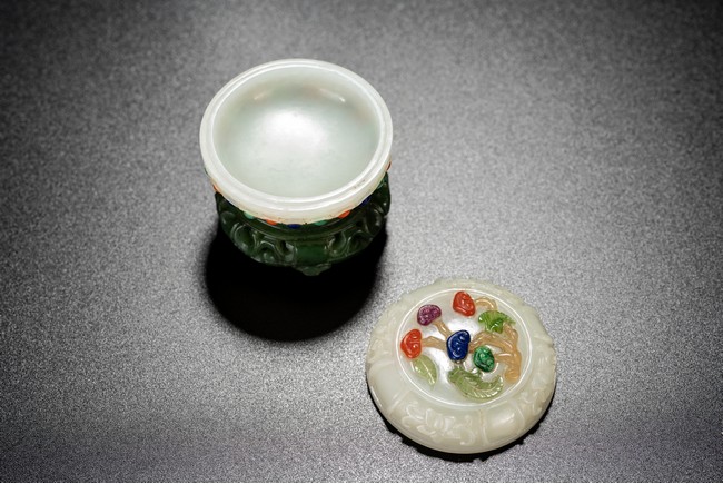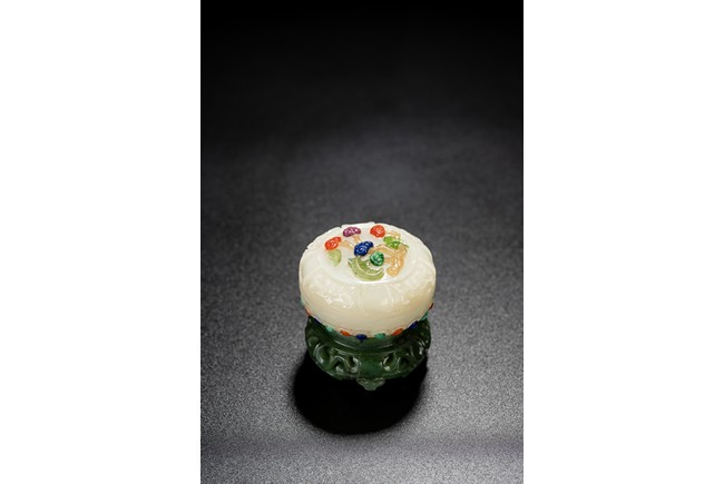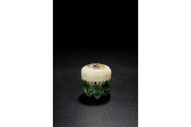 盒為子母口,和田玉材質,瑩潤細膩,蓋先雕琢花卉紋,後在其中以多寶鑲嵌,出靈芝紋飾,盒身亦鑲嵌多寶石,與蓋呼應,下呈和田碧玉纏枝蓮紋圓底座,整體保存完整,端莊典雅,乃文房雅器。
