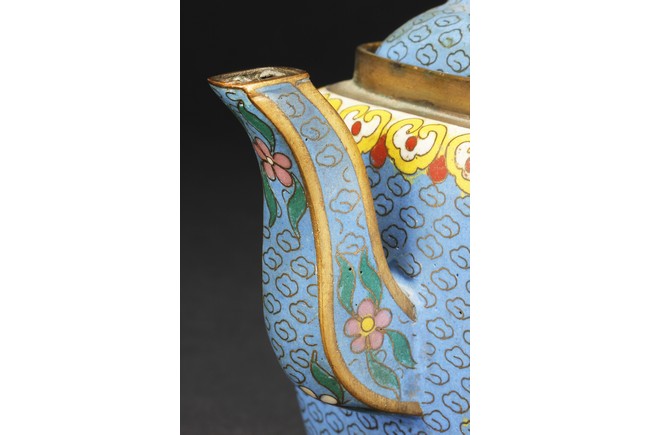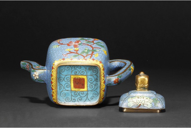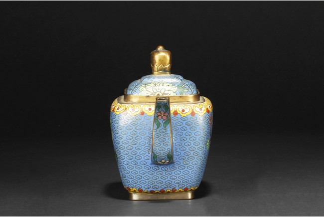 Republic period. Of round square form, the body supported by a square foot ring, with large handle extending from near base to shoulder, the spout curved slightly extending from the middle of body, the body depicts blossoming peony flowers, leaves, and branches on top of teal background filled with small cloud patterns, between scrolling ruyi-head band pattern and scrolling ruyi-head cloud pattern, the bottom bears four character 'KANGXI' mark.