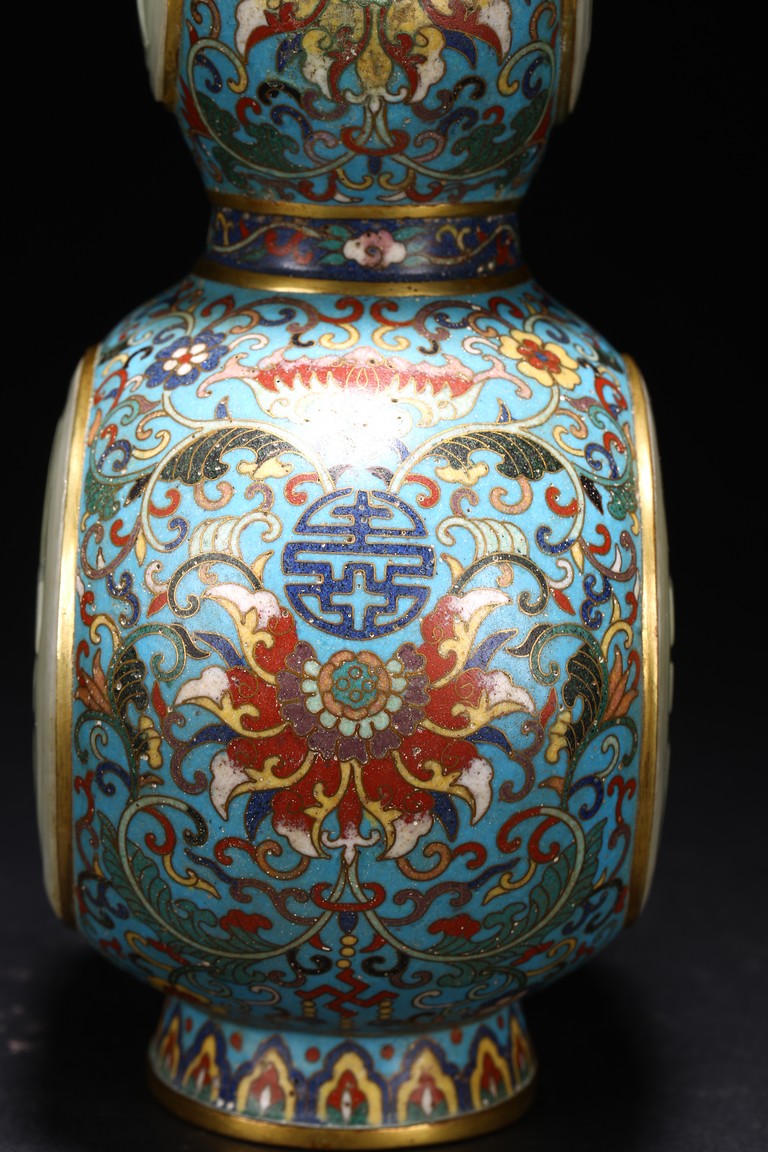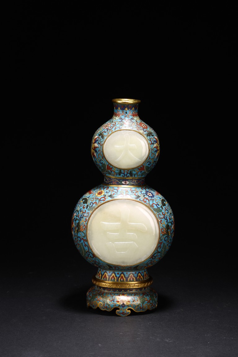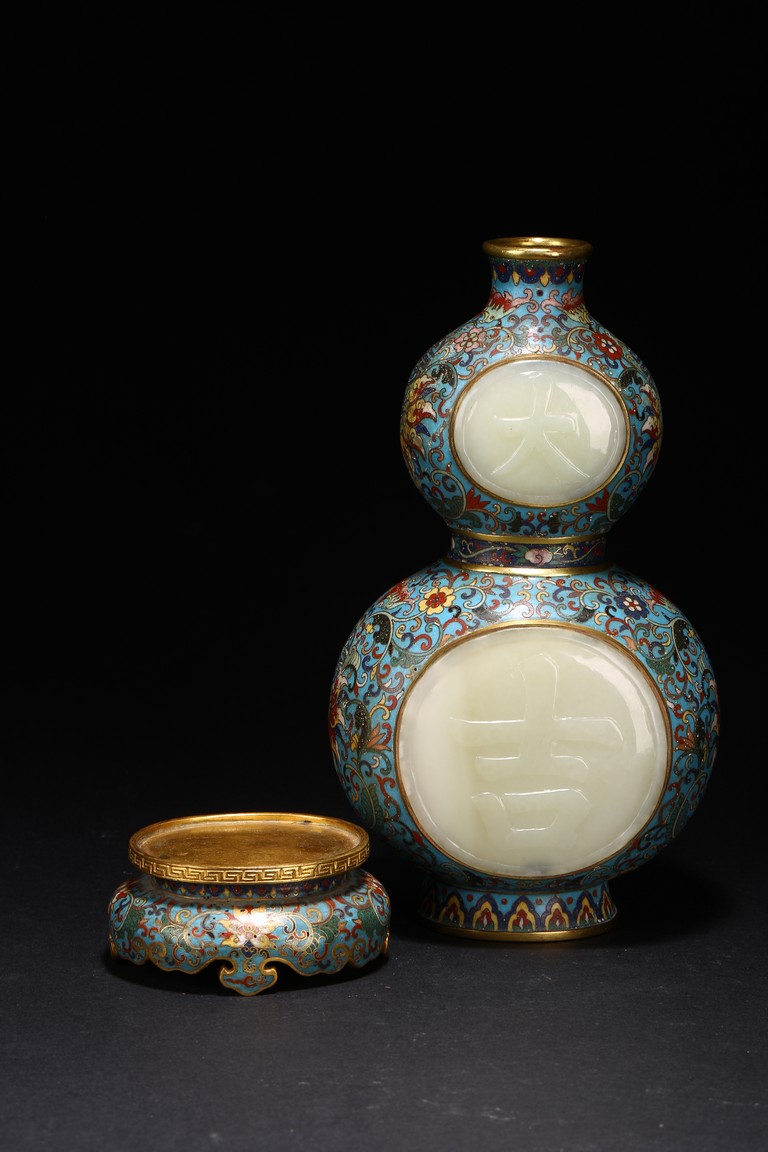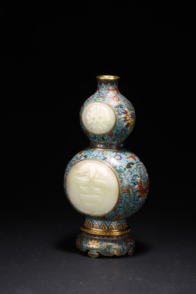 Qing Dynasty period. Of double gourd form, each gourd embellished with circular jade carved with 'da' and 'ji', the cloisonne enamel ground decorated with dense stylized lotus scrolls, the base carved with four character Qianlong mark.