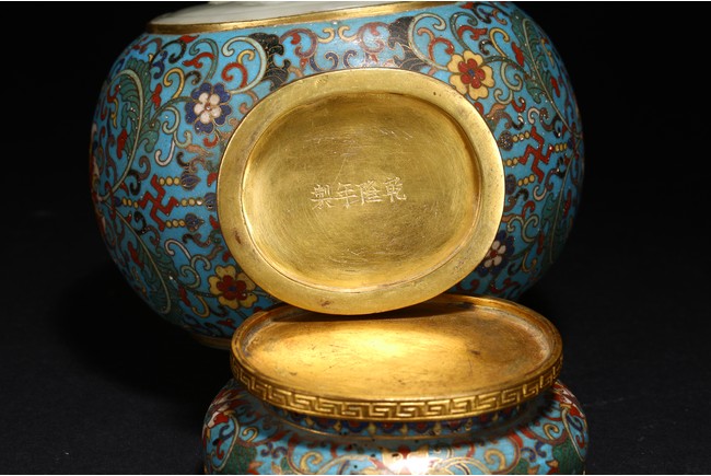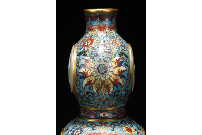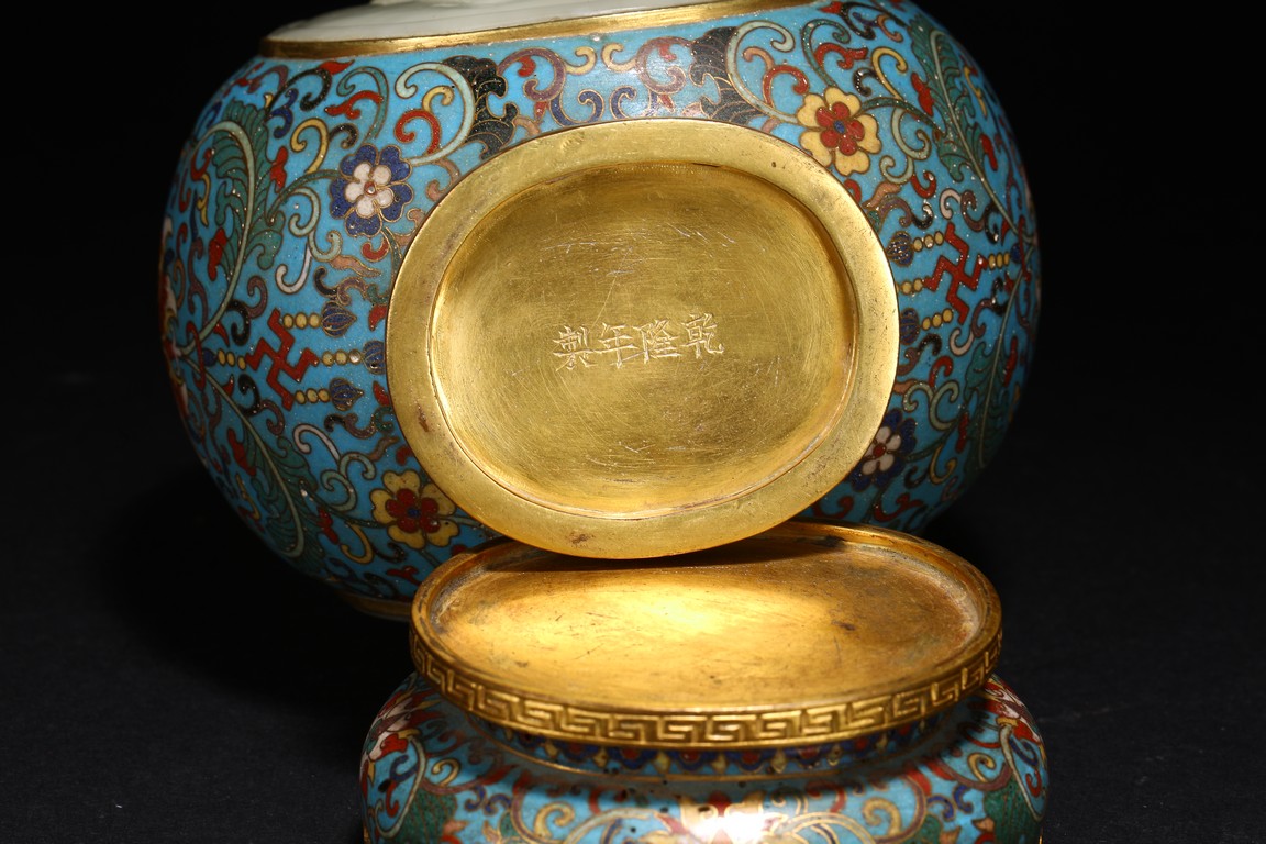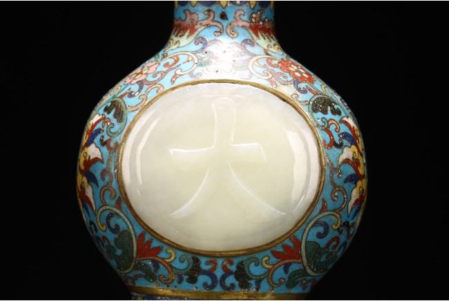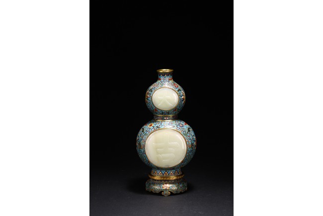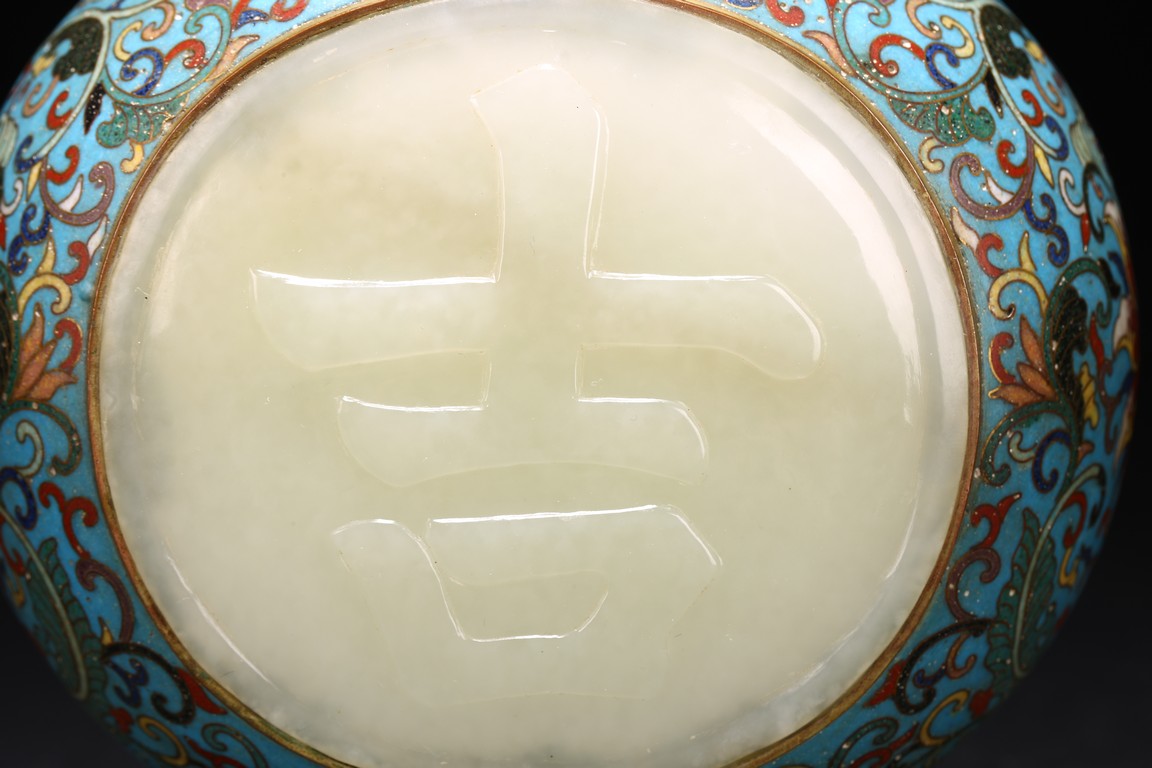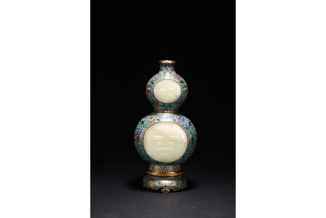 Qing Dynasty period. Of double gourd form, each gourd embellished with circular jade carved with 'da' and 'ji', the cloisonne enamel ground decorated with dense stylized lotus scrolls, the base carved with four character Qianlong mark.