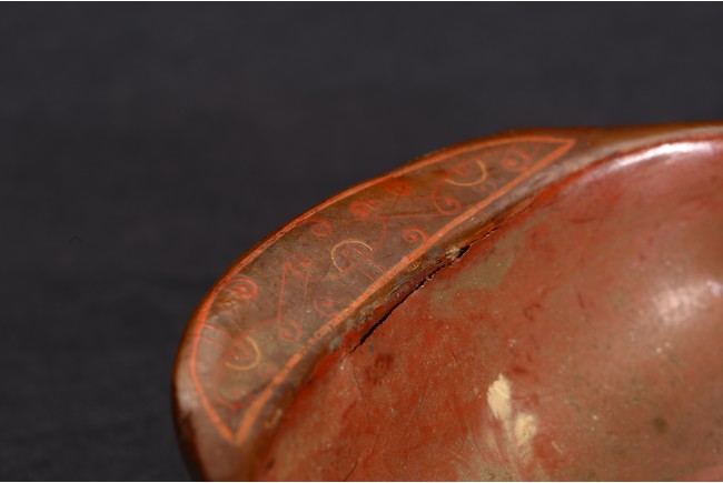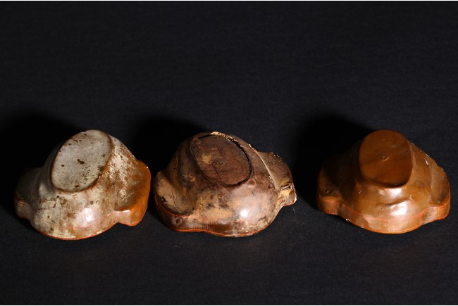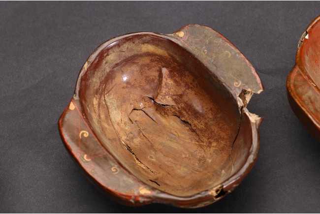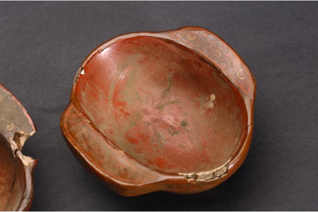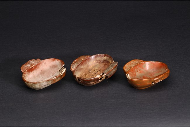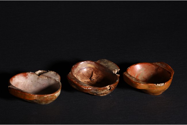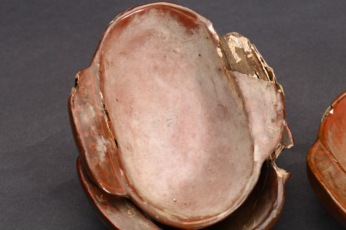 Han Dynasty period. Each with a pair of rounded 'ear'-shaped handles set at a slight angle, the delicate wood body covered with a brown lacquer.