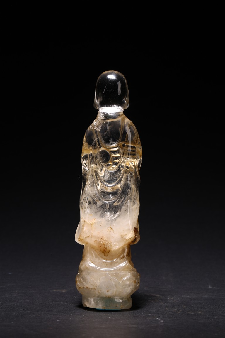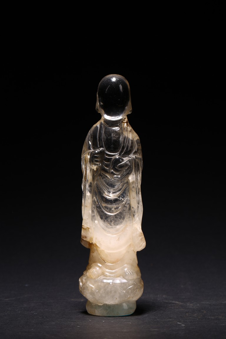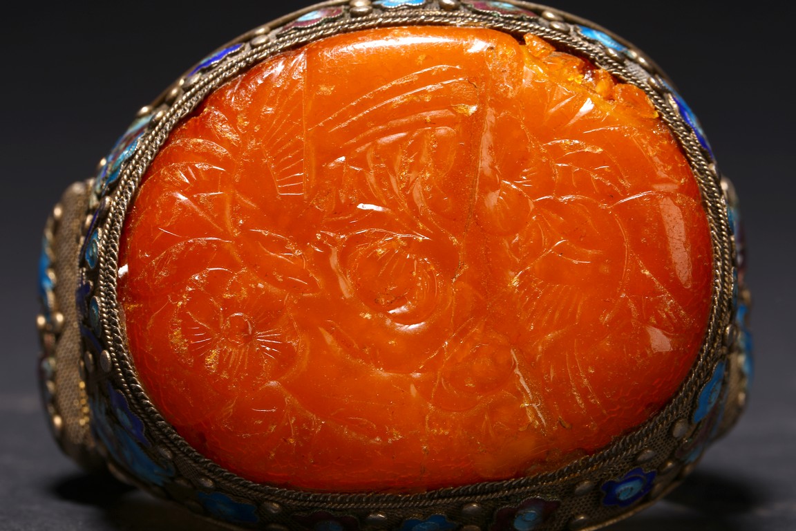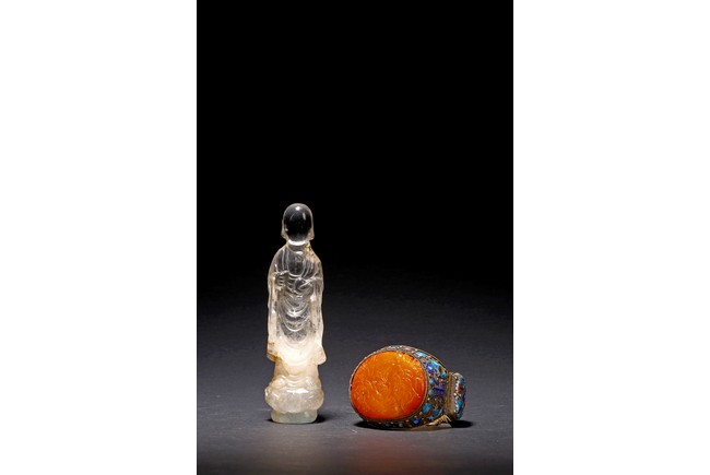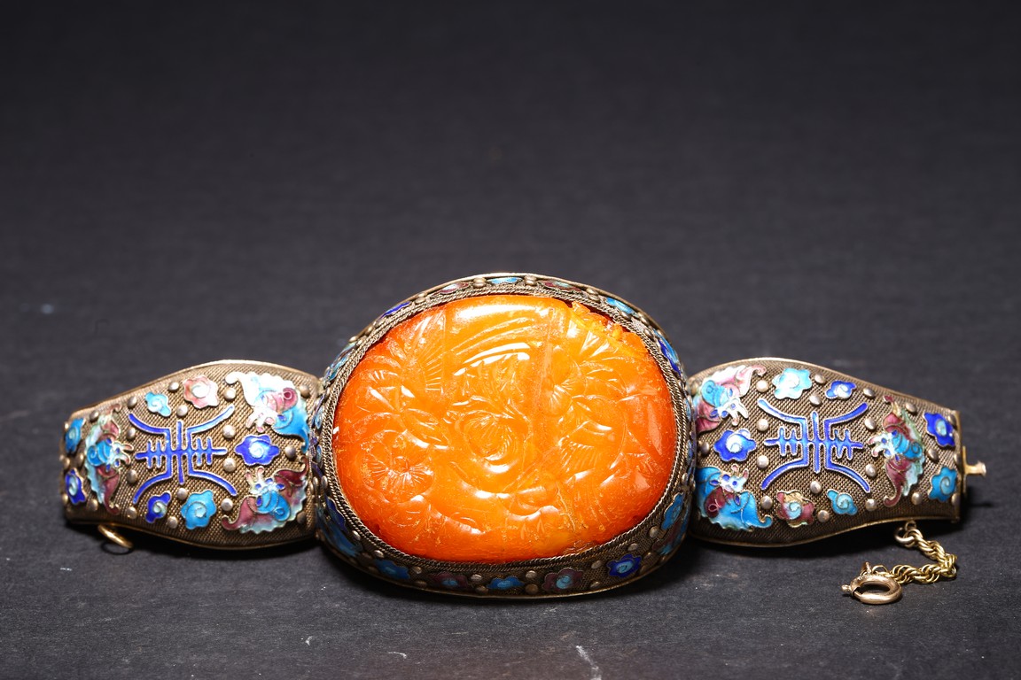 Qing Dynasty period. The silver enameled bracelet inset with a carved amber, along with a crystal carved standing monk figure.