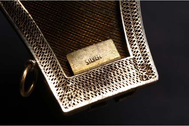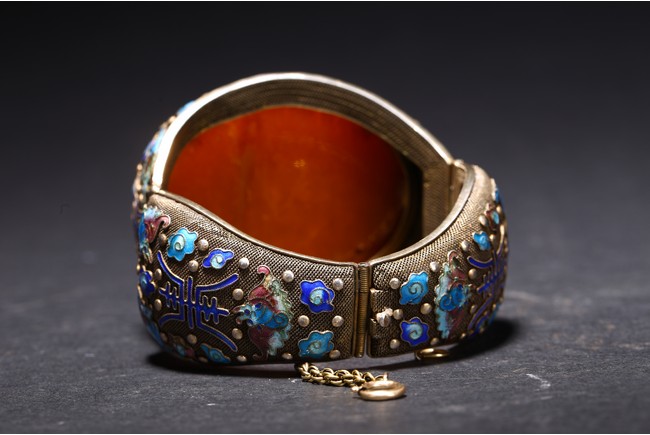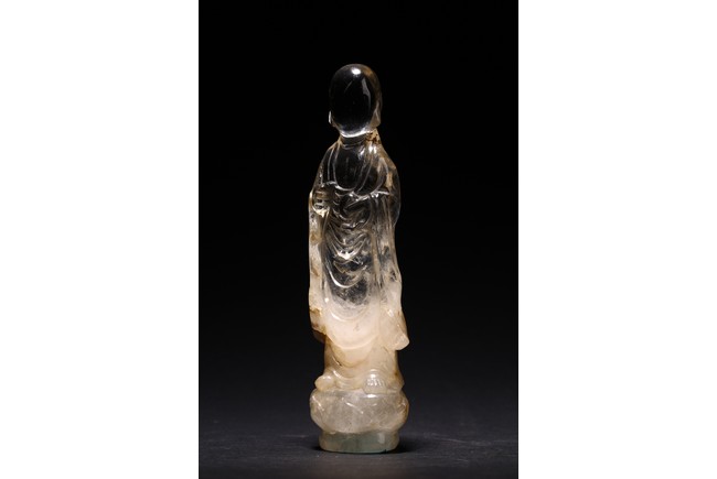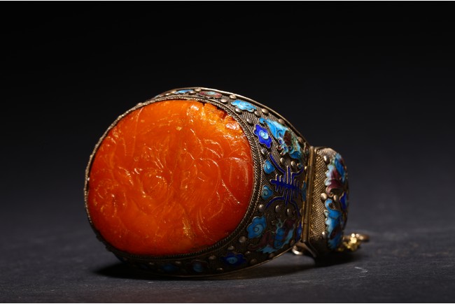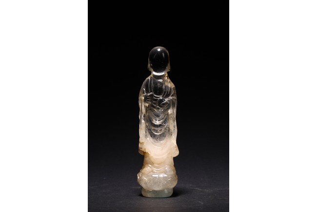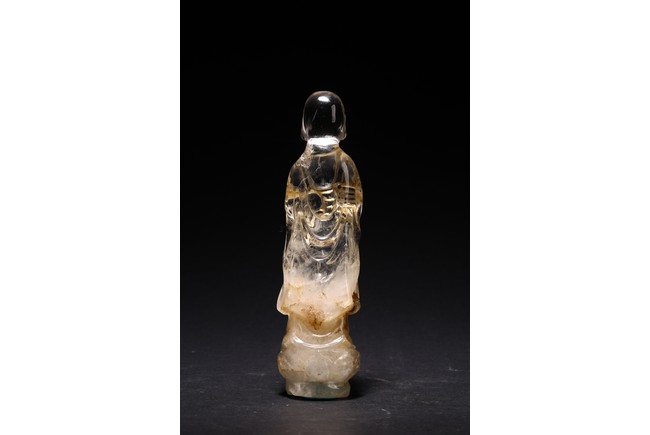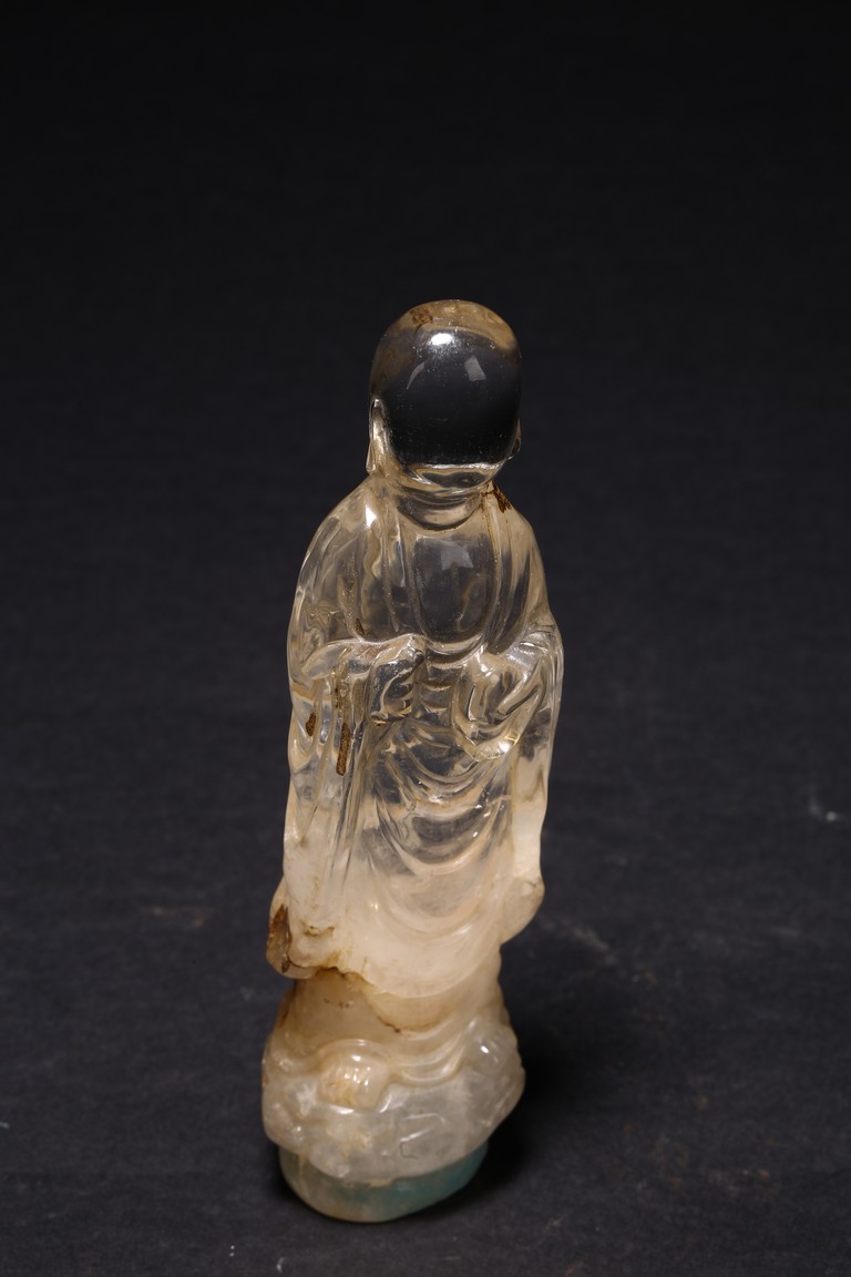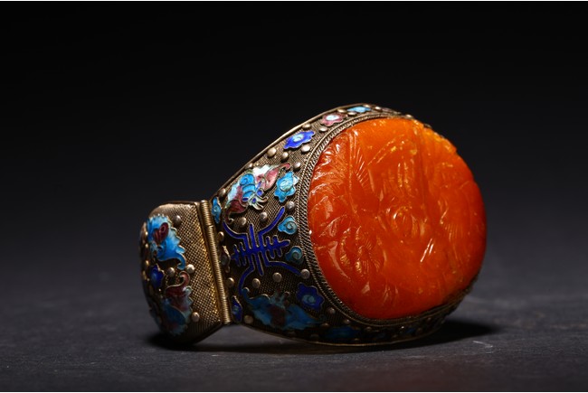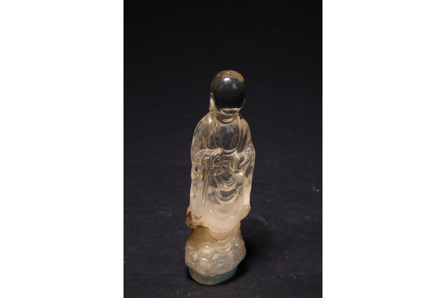 Qing Dynasty period. The silver enameled bracelet inset with a carved amber, along with a crystal carved standing monk figure.