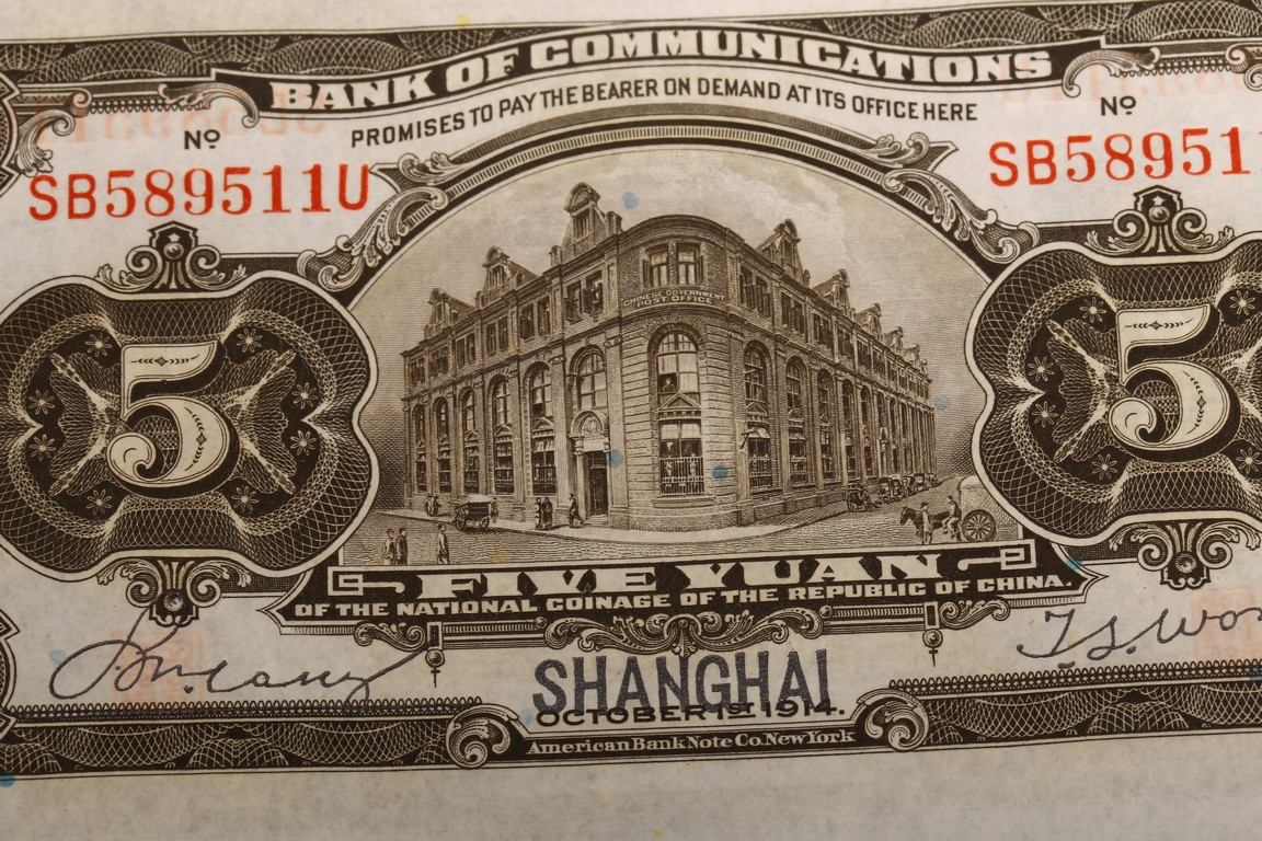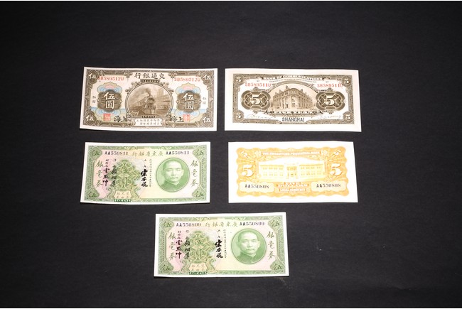 Republic period. Comprising of 5 five-Yuan bank notes issued by different banks.