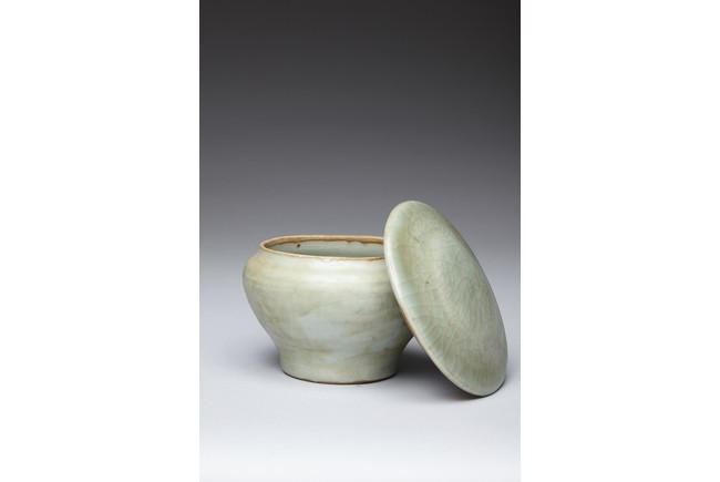 Song Dynasty period. With rounded shoulders tapering to the feet and leaf-form cover, overall glazed in celadon tone.