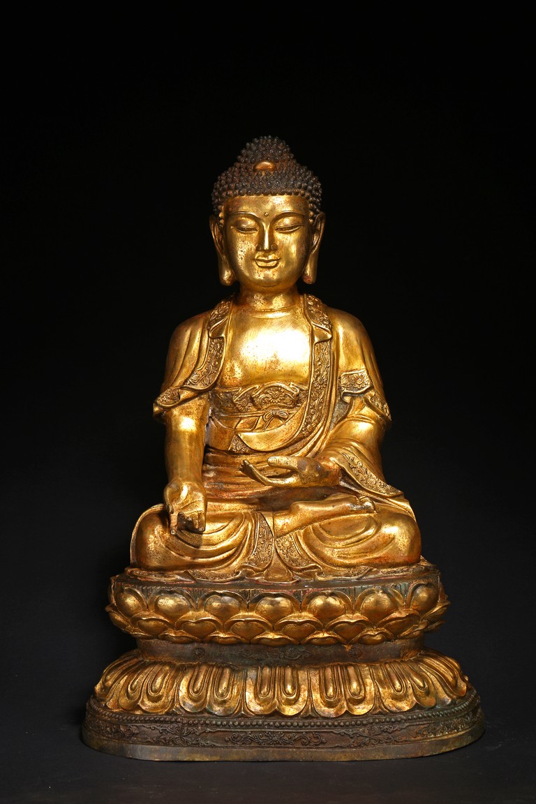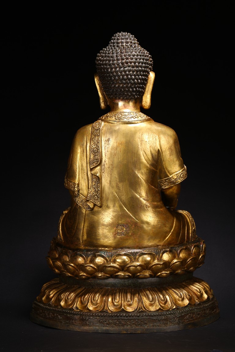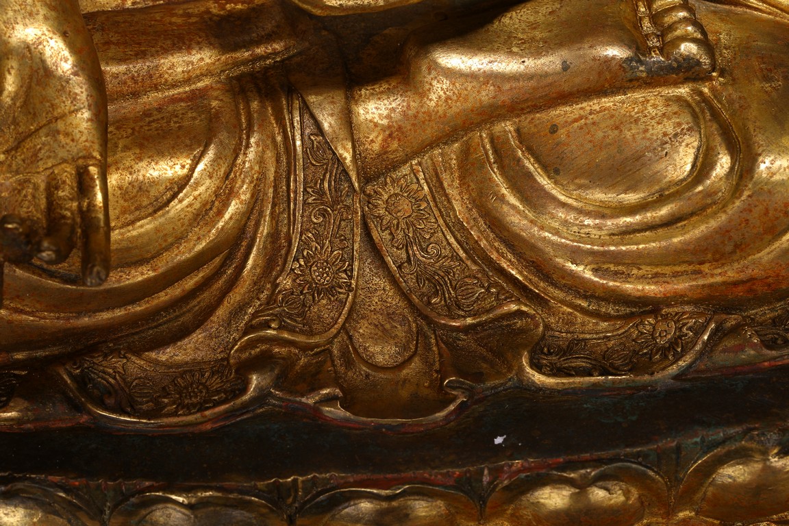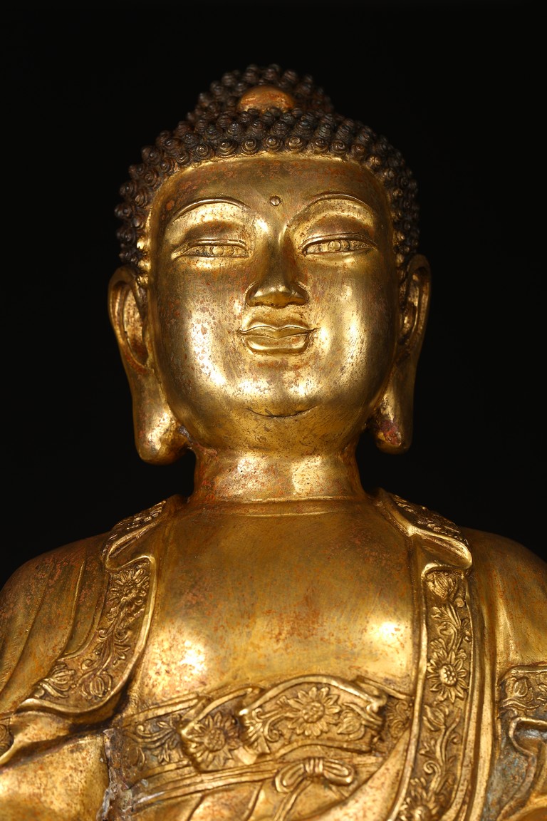此尊釋迦牟尼坐像,闊面高髻,五官比例精準,細眉垂目,雙唇微啟,大耳垂肩,儀態安詳沈靜。佛尊身著通肩式袈裟,胸前袒露,衣紋自然起伏。左手結禪定印,右手結說法印,自然平放於右膝之上,雙腿結跏趺坐,神態端莊。整器造型端莊,比例勻稱,肢體豐滿圓潤,鎏金厚實,金光熠熠,具有較高的藝術性。“宣德年制”款識。
