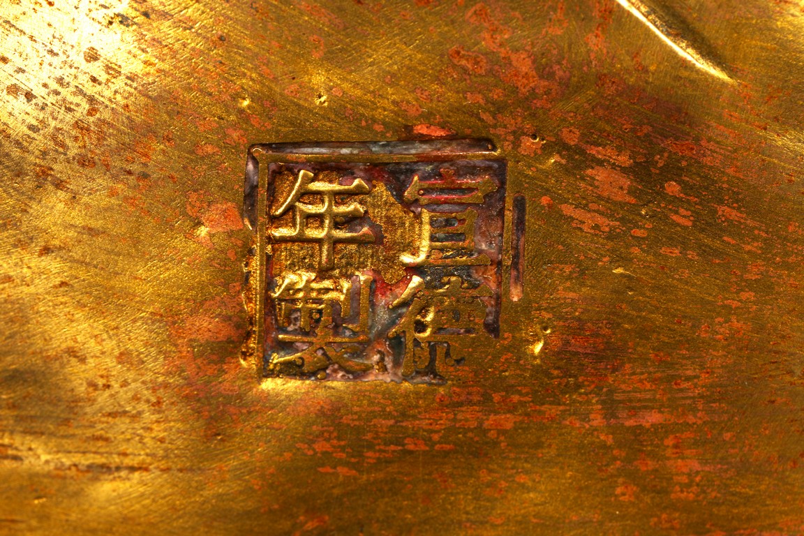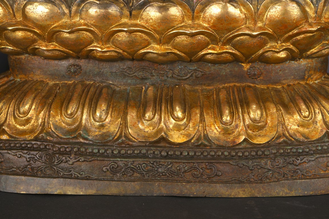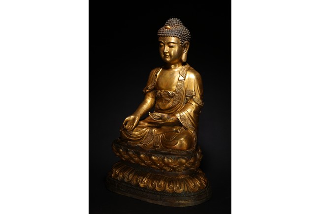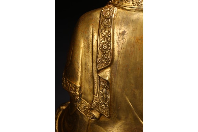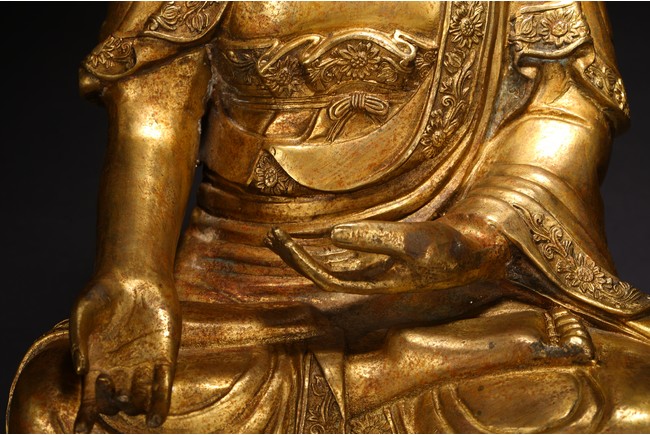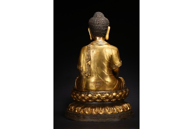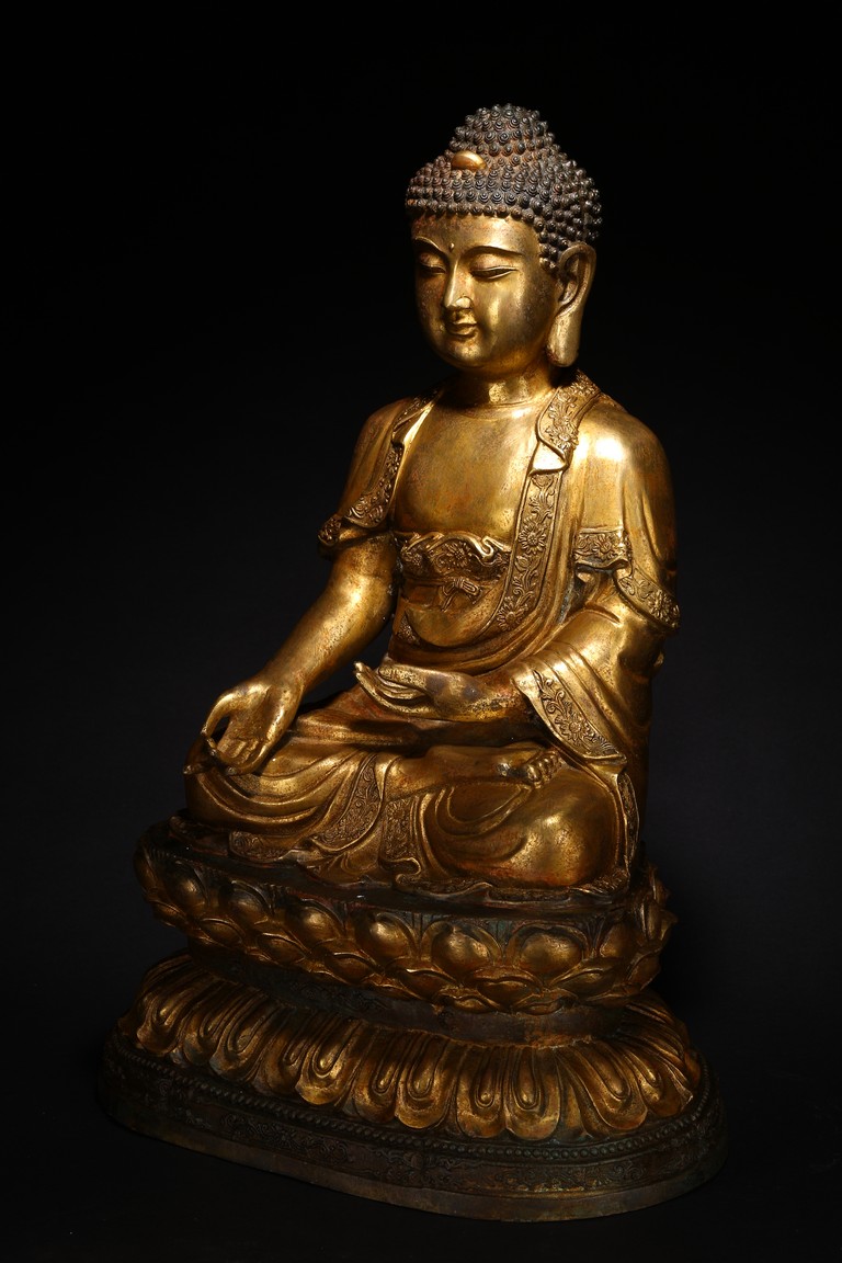 此尊釋迦牟尼坐像,闊面高髻,五官比例精準,細眉垂目,雙唇微啟,大耳垂肩,儀態安詳沈靜。佛尊身著通肩式袈裟,胸前袒露,衣紋自然起伏。左手結禪定印,右手結說法印,自然平放於右膝之上,雙腿結跏趺坐,神態端莊。整器造型端莊,比例勻稱,肢體豐滿圓潤,鎏金厚實,金光熠熠,具有較高的藝術性。“宣德年制”款識。