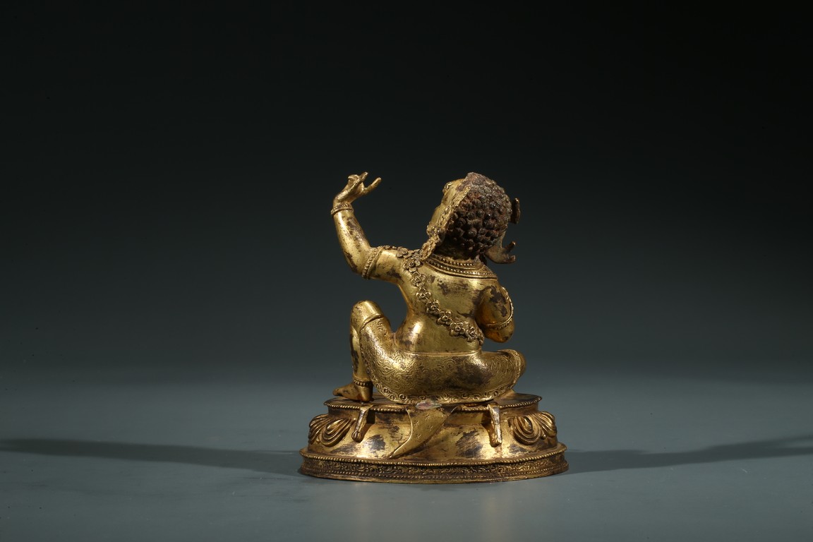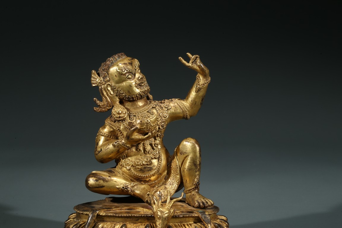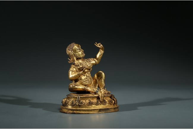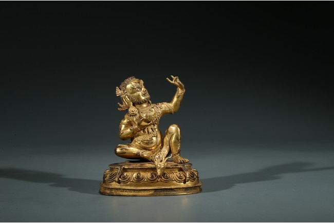 大成就者毗盧巴出生於印度,生活於9世紀中葉。關於他上指的手勢,有這樣的記載:一次,口渴的毗盧巴喝乾了一個酒館裡所有的酒,店家要求他結賬,毗盧巴提出當地上的陰影到達某個點時才結賬,然後用手一指,阻止太陽移動。兩天一夜太陽一動不動,當地的國王大惑不解,令人查詢。當他聽說有一位瑜伽大士將太陽停在天上時,國王為他付了賬。毗盧巴離開以後,太陽又開始運行了。薩迦派特別崇拜毗盧巴,當表現他“阻止太陽運行”時,要麼採用“不共”姿,舉起右手;要麼用“共”姿,舉起左手。作為上師時,他施轉法輪印。此尊毗盧巴像再現了一位梵僧的形象。身材肥碩,四肢粗短。面龐飽滿,眼睛圓睜,鼻翼與口部微張。頸上戴有雙重瓔珞做成的飾物,胸前的瓔珞彎捲成半圓形如花瓣,下垂的部分形如“個”字,充滿裝飾感與律動感。右手置於胸前,持嘎布拉碗,左手上舉,食指伸出,表現了將太陽止於天空的一瞬。他的右腿平置於檯面,左腿彎曲豎起,是古印度大成就者常見的姿態。身下鋪墊有獸皮,是神秘與力量的再現。