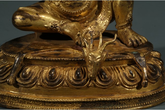 The deity is shown seated on a deer skin over a lotus stand with left knee raised, the body wearing long robes adorned with jewelry and headdress, the left hand raised in gesture and the right hand holding a skull cup, his expressive face with curly beard and hair, his prominent eyes flanked by two pendulous earlobes with circular earring.