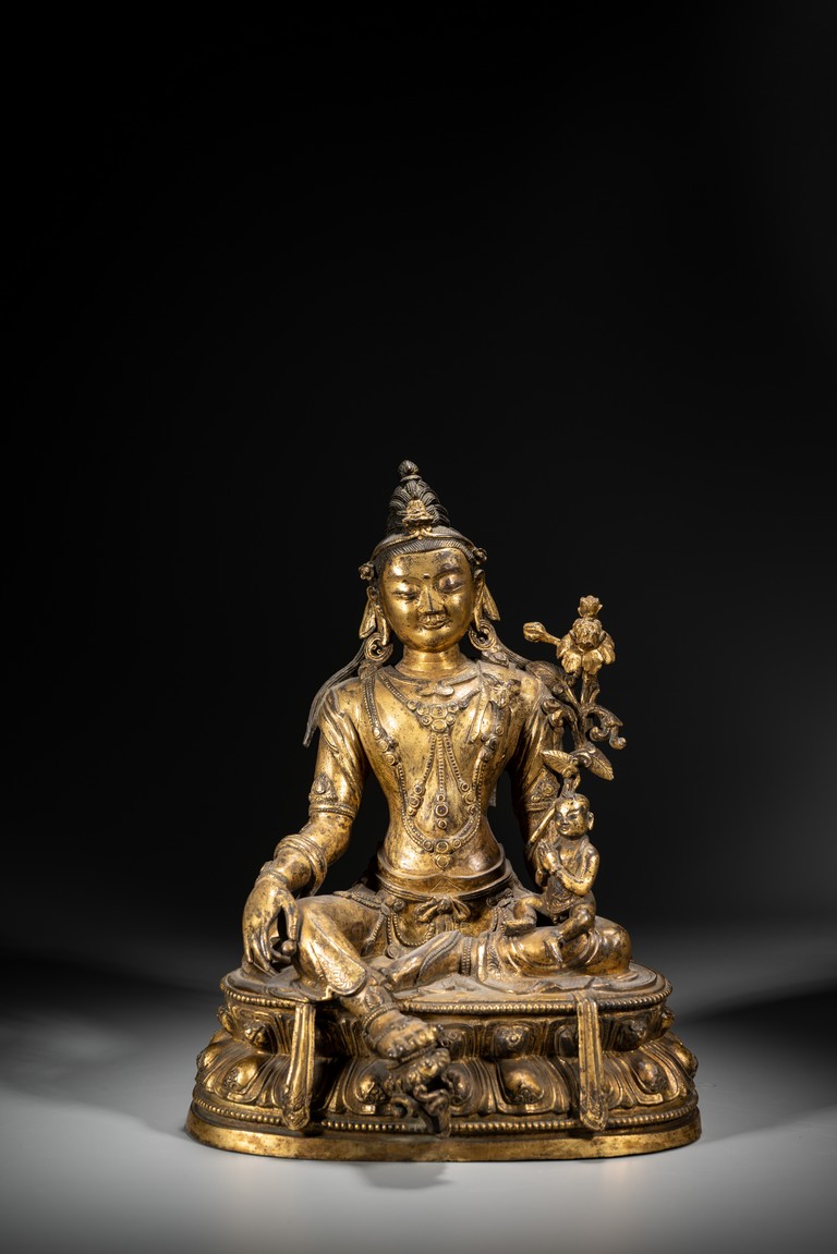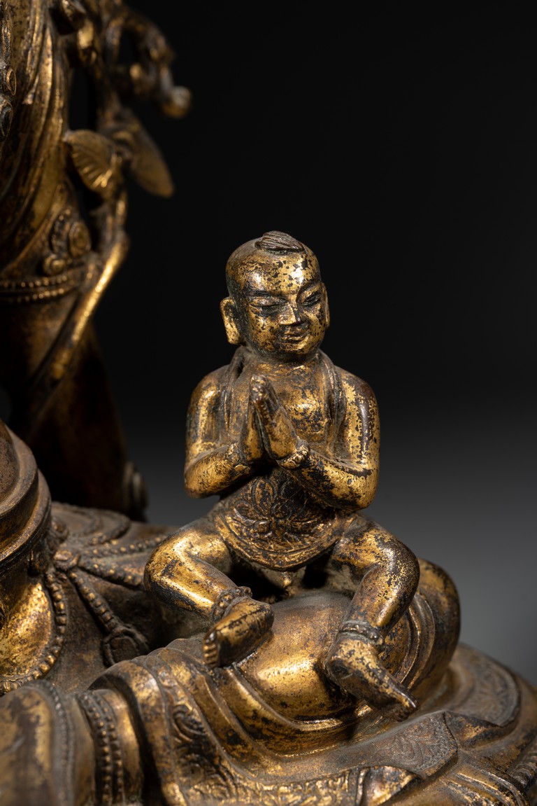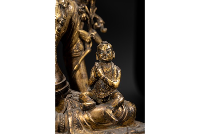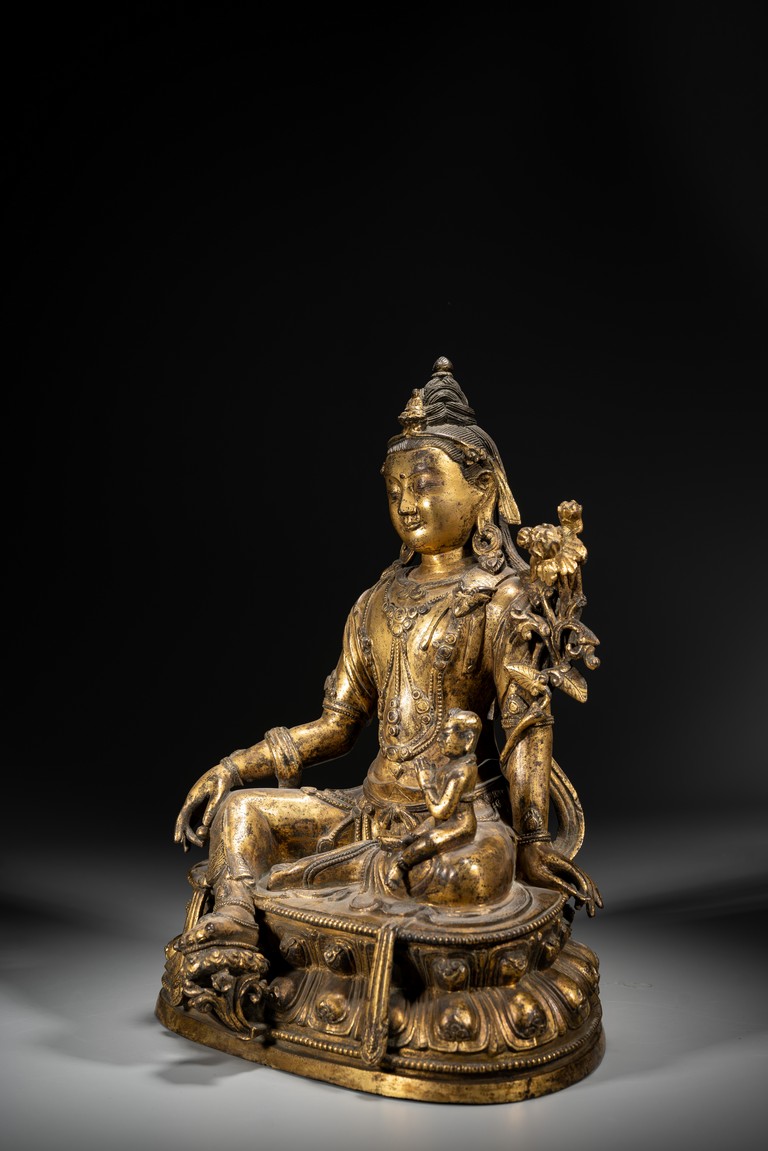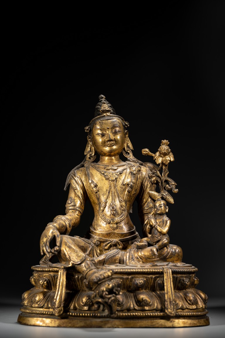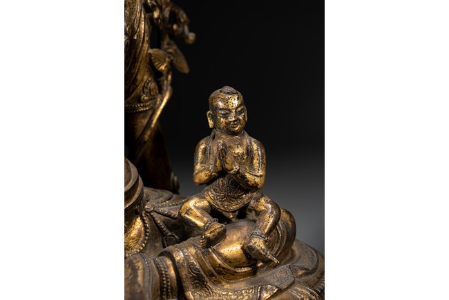 《妙法蓮華經·觀世音普門品》雲:「若有女人,設欲求男,禮拜供養觀世音菩薩,便生福德智慧之男;設欲求女,便生端正有相之女。」送子觀音題材的造像在北宋時期已有之,到明清時期大量出現。在中原地區,送子觀音被認為具有助生育的法力,倍受人們崇信,如此造型接近民間多子多嗣的願望,為人們喜聞樂見。此尊觀音面頰豐腴,白毫圓凸,頭戴髮箍,正中有阿彌陀佛,髮辮垂至兩肩,頭微偏轉,目光下斂,低眉若有所思,神情嫻淑,姿態端莊,微含笑意,相容慈和。身穿通肩天衣,胸前珮飾三層式瓔珞,左肩披一仁獸及綻開肩花,衣紋刻畫寫實自然。觀音呈大自在相,坐於雙層式蓮花座上,蓮座樣式為典型康熙宮廷風格,觀音左腿盤曲,左腿下垂並踩踏蓮花,左手撐於蓮座上方,右手輕撫膝部。憨態可掬的童子則坐於觀音的左膝上,雙手合十,面容靜謐,生動傳神。整像尺寸碩大,通體鎏金,造型端莊,比例勻稱,體態優美。歷經常年供奉,銅色沈穆,包漿古潤。在宋至清代中原造像中,送子觀音為一位世俗化的慈祥的婦人造型,而此尊送子觀音來自於康熙宮廷造像,觀音融化了漢藏風格,為藏傳佛教中介於男女之間的善男子形象,與常見的送子觀音有很大區別,但比善男子形象同樣的慈眉善目,盡可能的追求一種疼愛幼童的慈祥形象。目前存世的造像中,此造型共不多見,極具收藏價值。明代中原送子觀音銅像偶有所見,但清康熙的送子觀音像兼有如此尺寸大者則極為罕見。